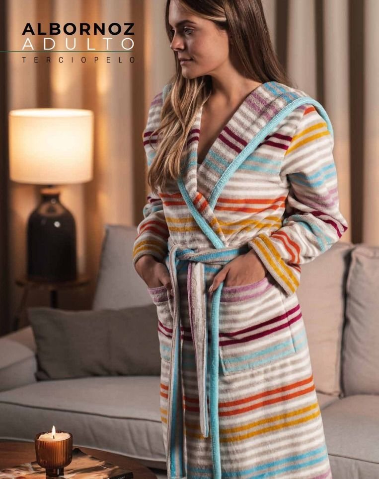 Albornoz con capucha 100 % algodón de acabado terciopelo que secan como el mejor rizo. De la marca ArcoBaleno fabricados en Galicia con los mejores acabados y los diseños más bonitos y originales. Este albornoz es una prenda de FIO TEXTIL, sinónimo de diseño y calidad.