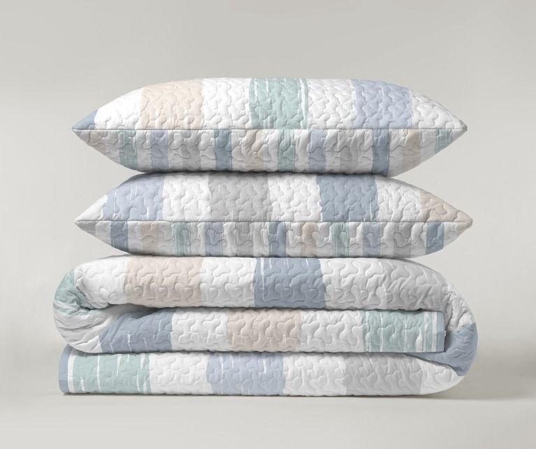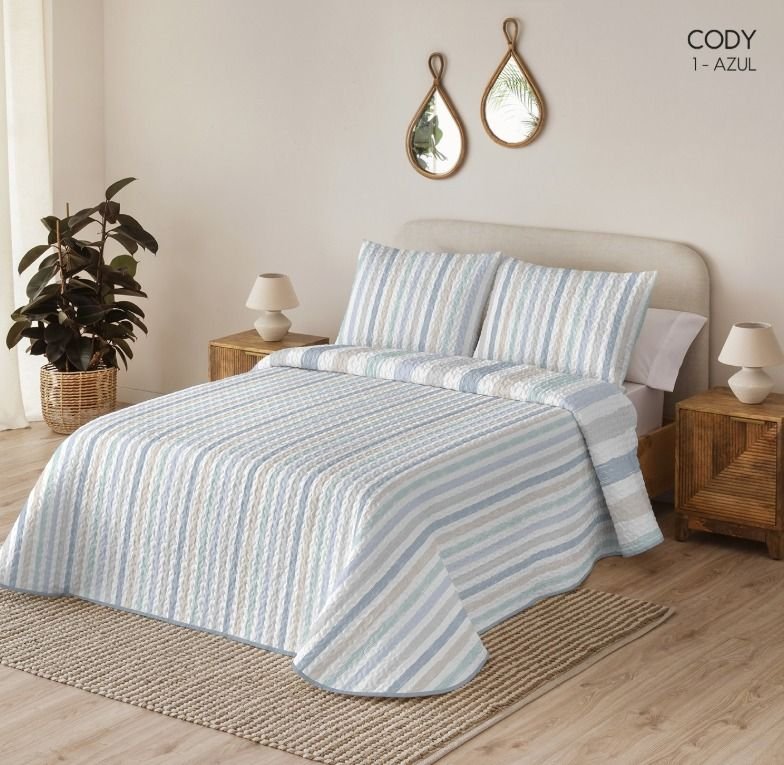 Serena Bouti Cody color Beige de rayas, reversible cosido microfibra estampado y fundas de cojín a juego de 50X70. Guateada con un relleno ligero que le aporta relieve y su tejido esmerilado un tacto suave y agradable. Este conjunto es ideal como colcha para entretiempo y verano. Las medidas para cama pequeña incluyen una funda de cojín y las de cama grande dos, el relleno de las fundas de cojín no está incluido.