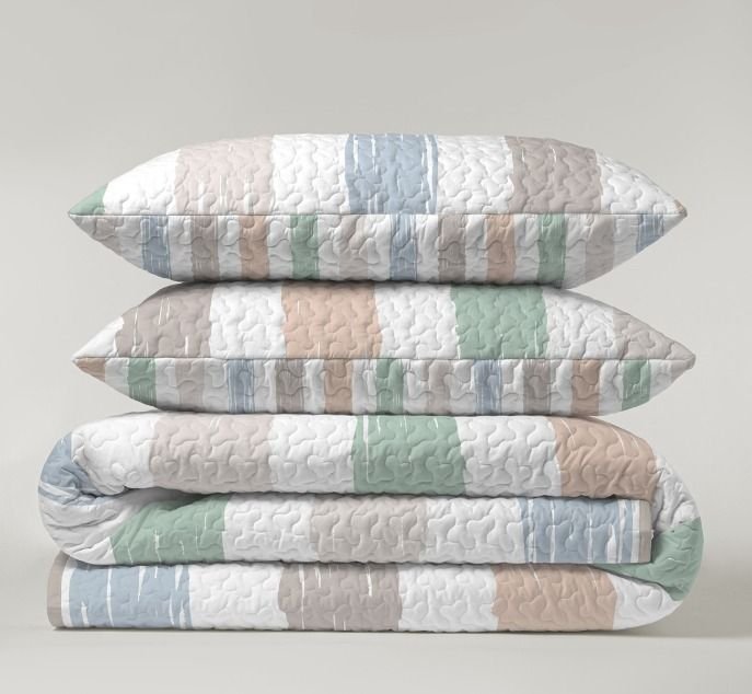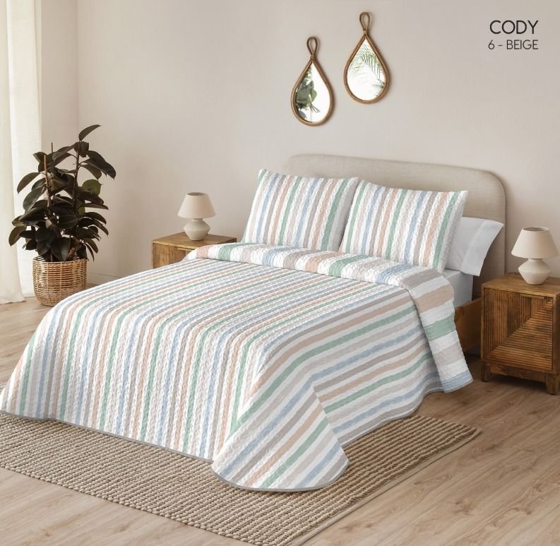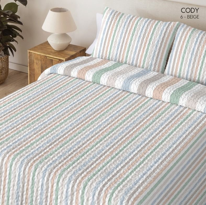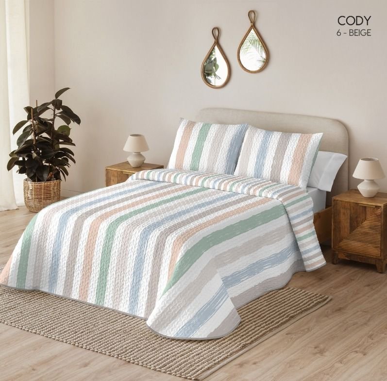 Serena Bouti Cody color Beige de rayas, reversible cosido microfibra estampado y fundas de cojín a juego de 50X70. Guateada con un relleno ligero que le aporta relieve y su tejido esmerilado un tacto suave y agradable. Este conjunto es ideal como colcha para entretiempo y verano. Las medidas para cama pequeña incluyen una funda de cojín y las de cama grande dos, el relleno de las fundas de cojín no está incluido.
