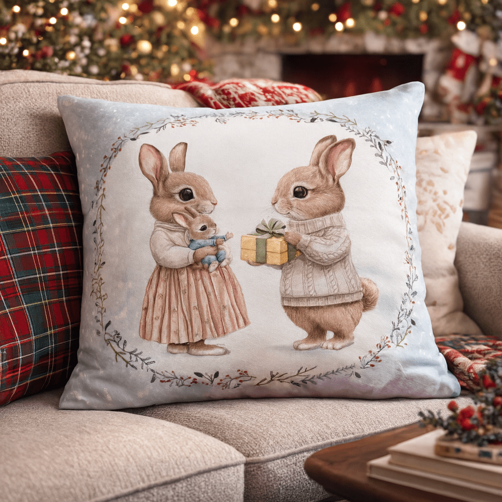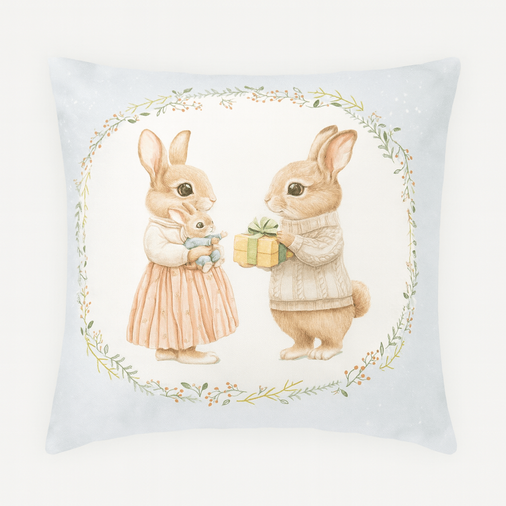 Aporta dulzura y un toque acogedor a tu hogar con este encantador cojín ilustrado. Su diseño muestra a una familia de conejitos en una escena invernal llena de ternura, perfecto para crear ambientes cálidos en salones, dormitorios o espacios infantiles. Con medidas de 45×45 cm y funda sin relleno, es ideal para combinar con tus interiores y añadir un detalle decorativo único y encantador.