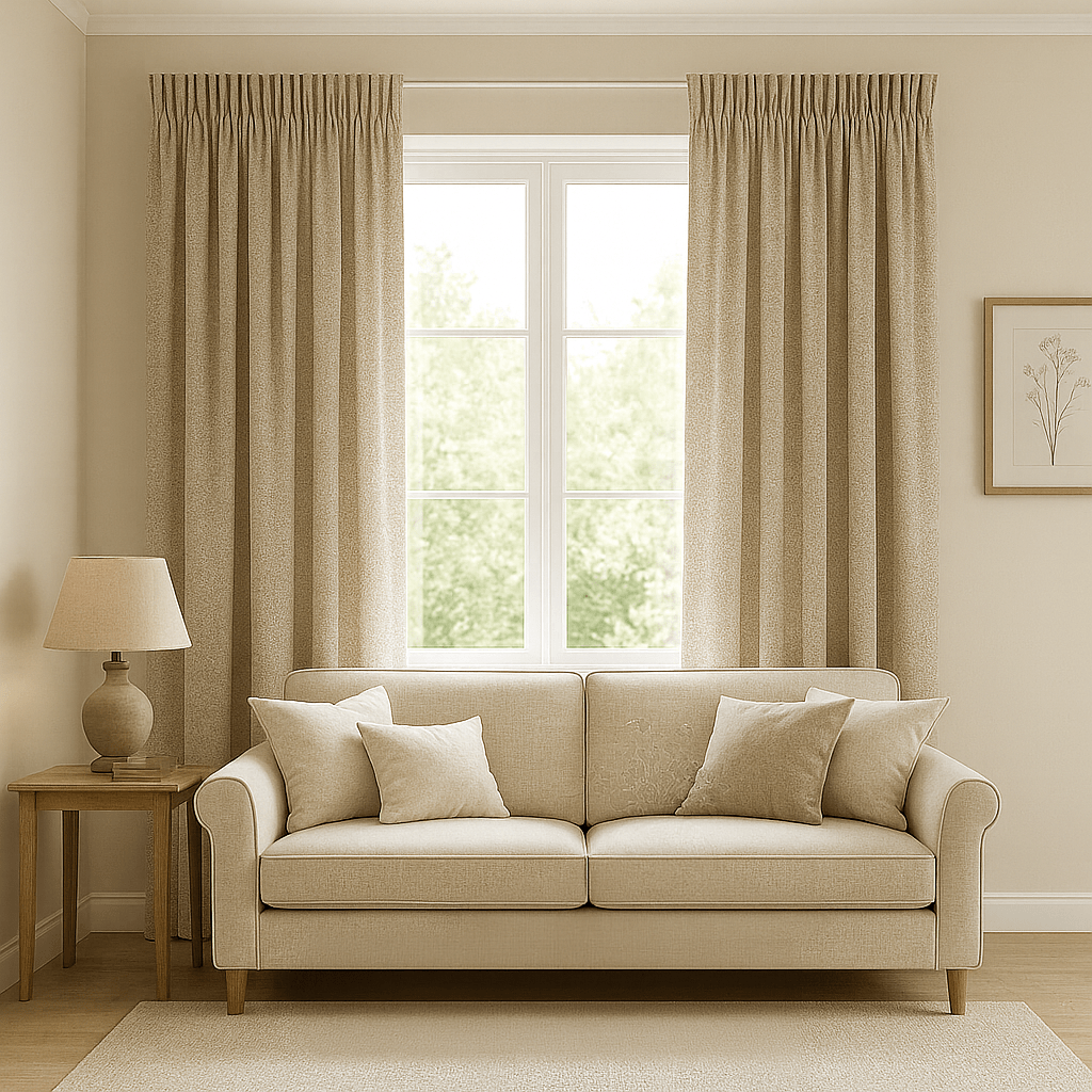 La confección fruncida se realiza mediante la utilización de cintas fruncidoras que permiten recoger el tejido de forma regular, generando pliegues continuos y simétricos. Dependiendo del tipo de cinta, se puede obtener diferentes proporciones de fruncido, generalmente entre 1/2, 1/2.5 o 1/3, garantizando un volumen equilibrado y una caída estable. Este sistema es especialmente adecuado para tejidos ligeros y medianos, ofreciendo una presentación clásica y funcional compatible con barras y rieles.