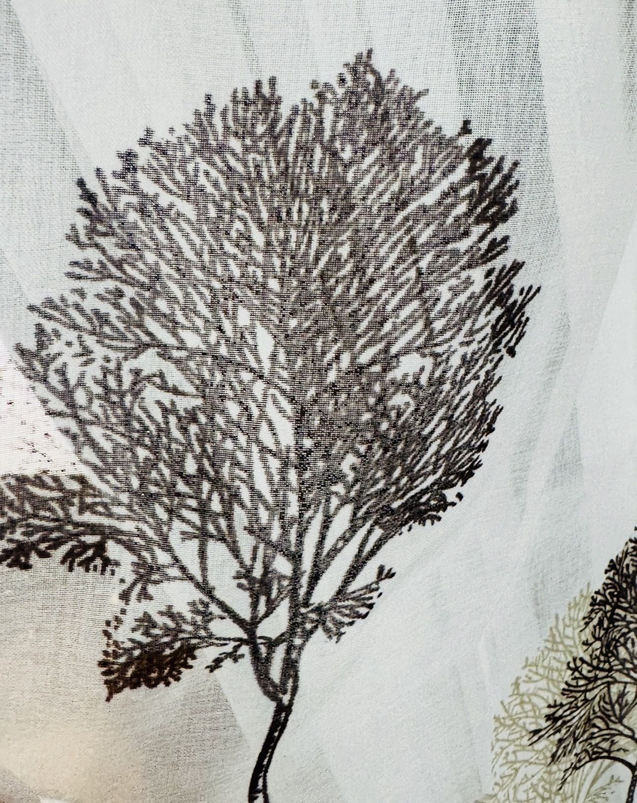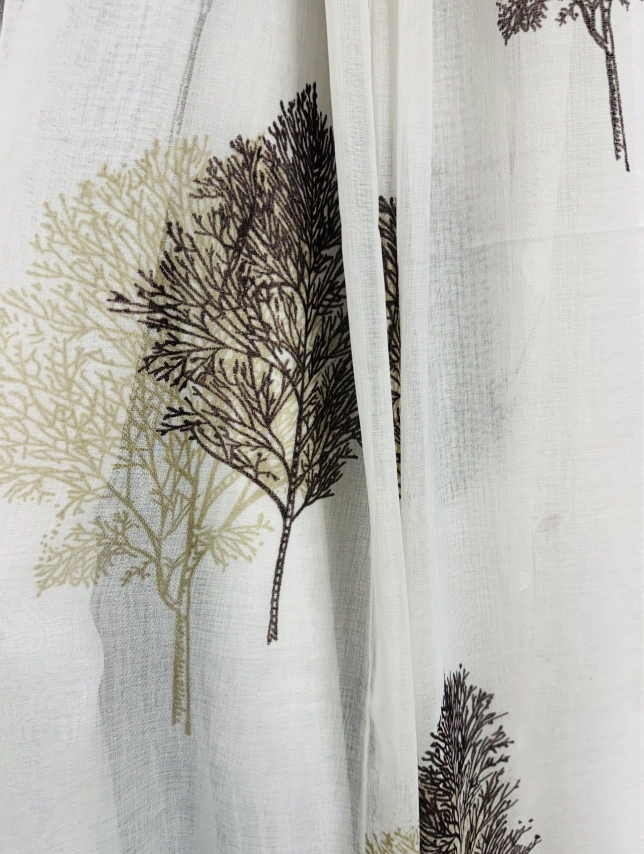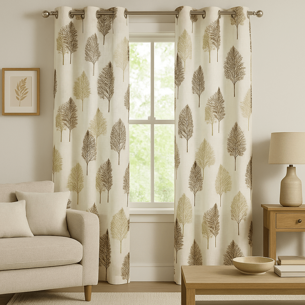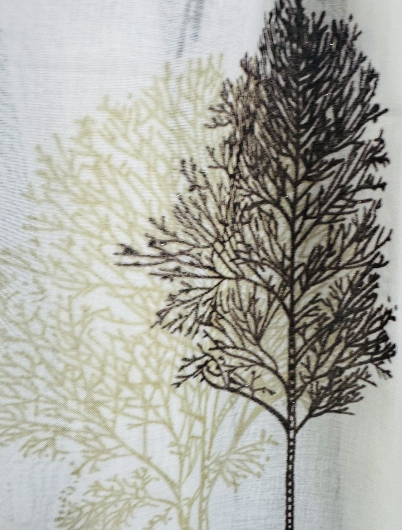 Cortina decorativa de estilo de rústico con un estilo y tacto muy natural. Modelo árbol colores beiges y marrón chocolate en fondo natural, para decorar cualquier estancia. Confeccionadas en medida estándar, listas para su fácil colocación mediante su sistema de ollaos.