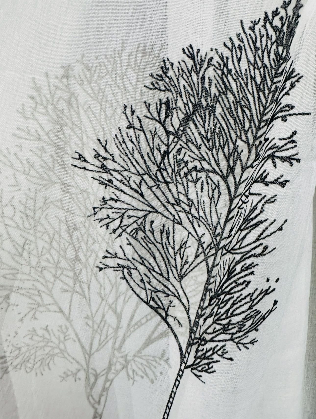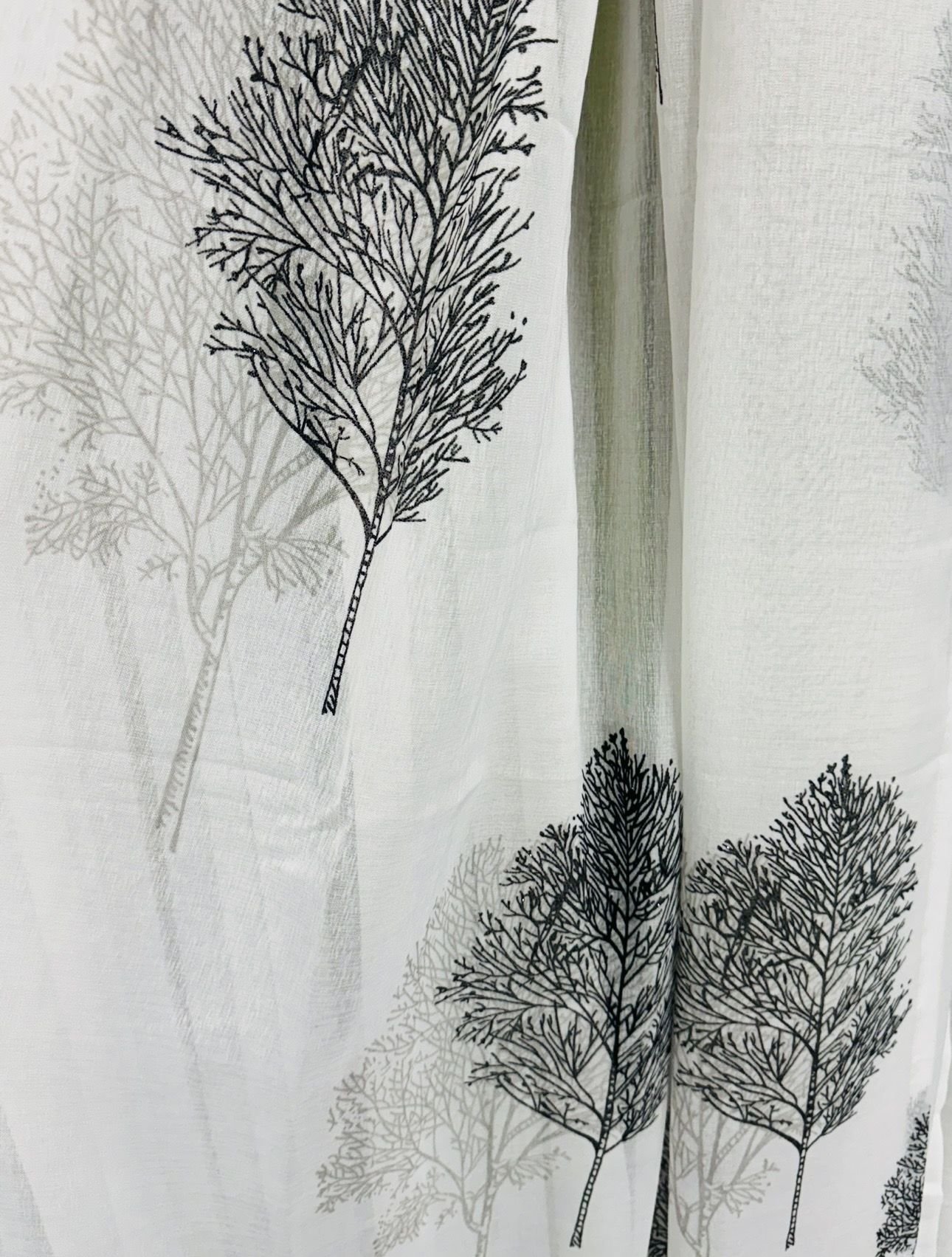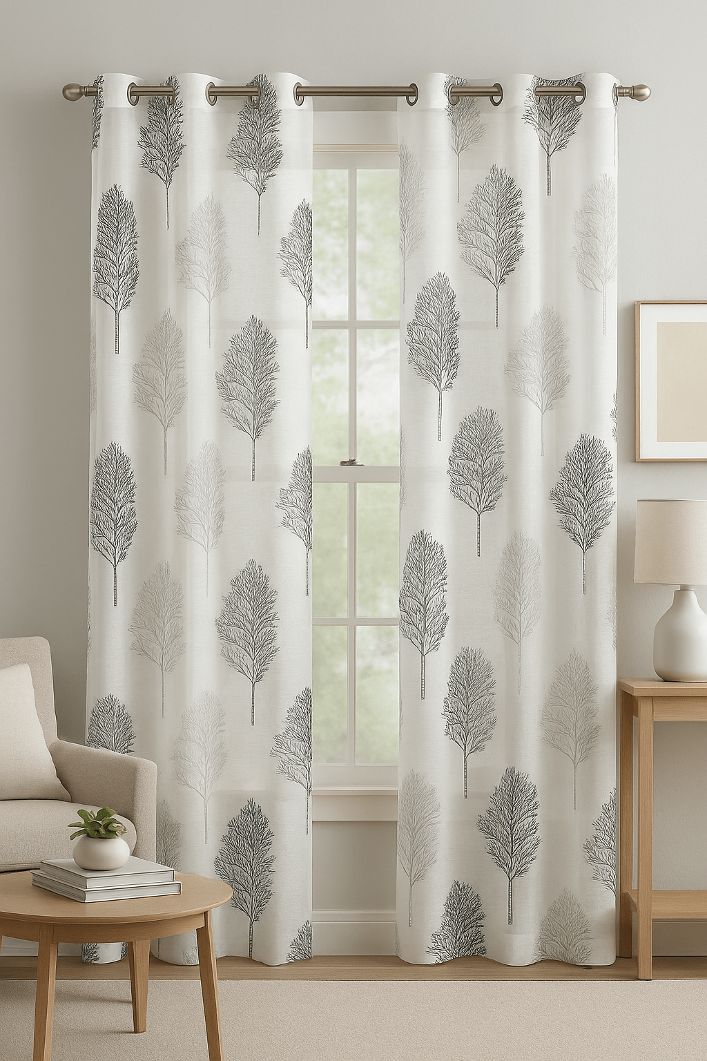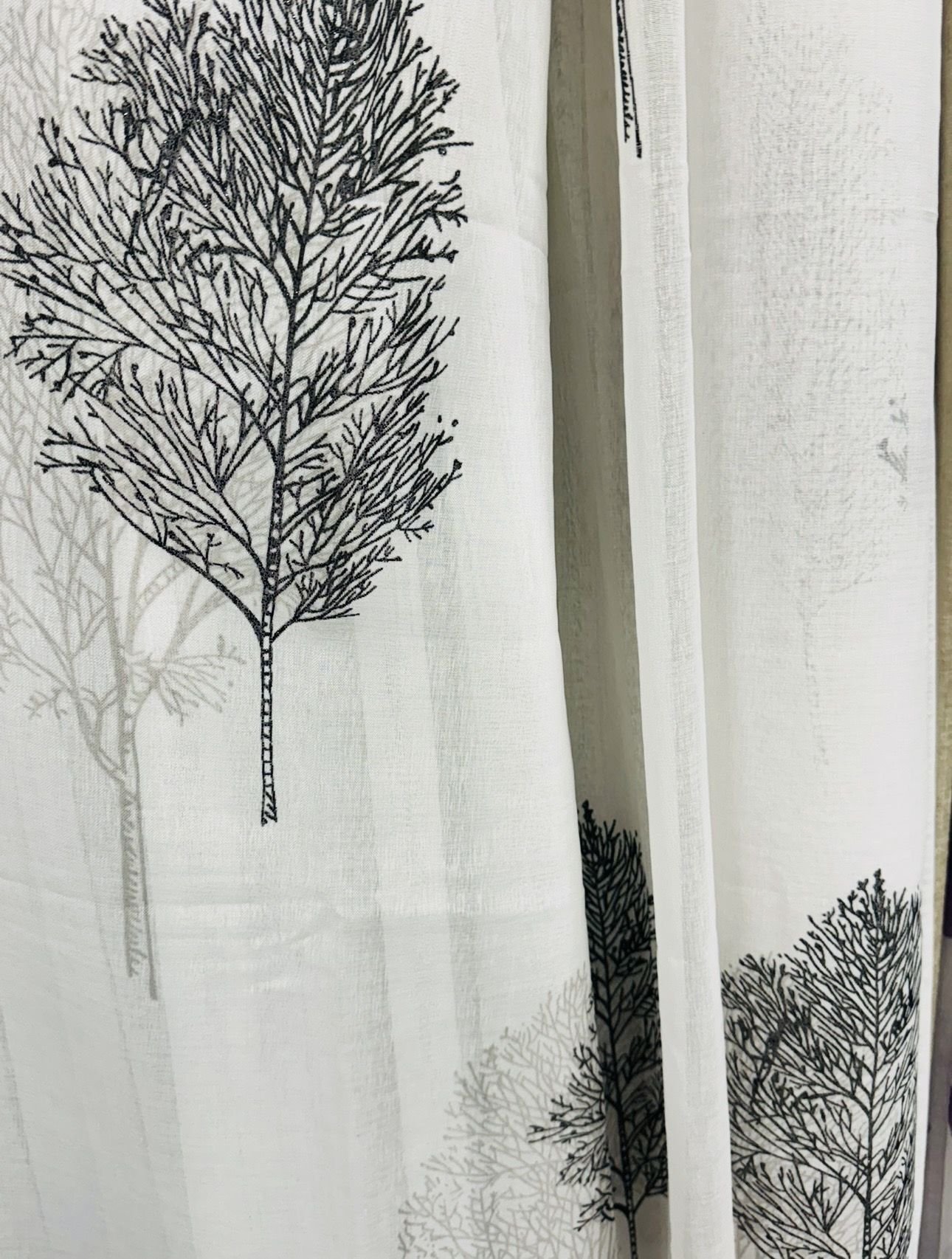 Cortina decorativa de estilo de rústico con un estilo y tacto muy natural. Modelo árbol colores grises y negros en fondo natural, para decorar cualquier estancia. Confeccionadas en medida estándar, listas para su fácil colocación mediante su sistema de ollaos.