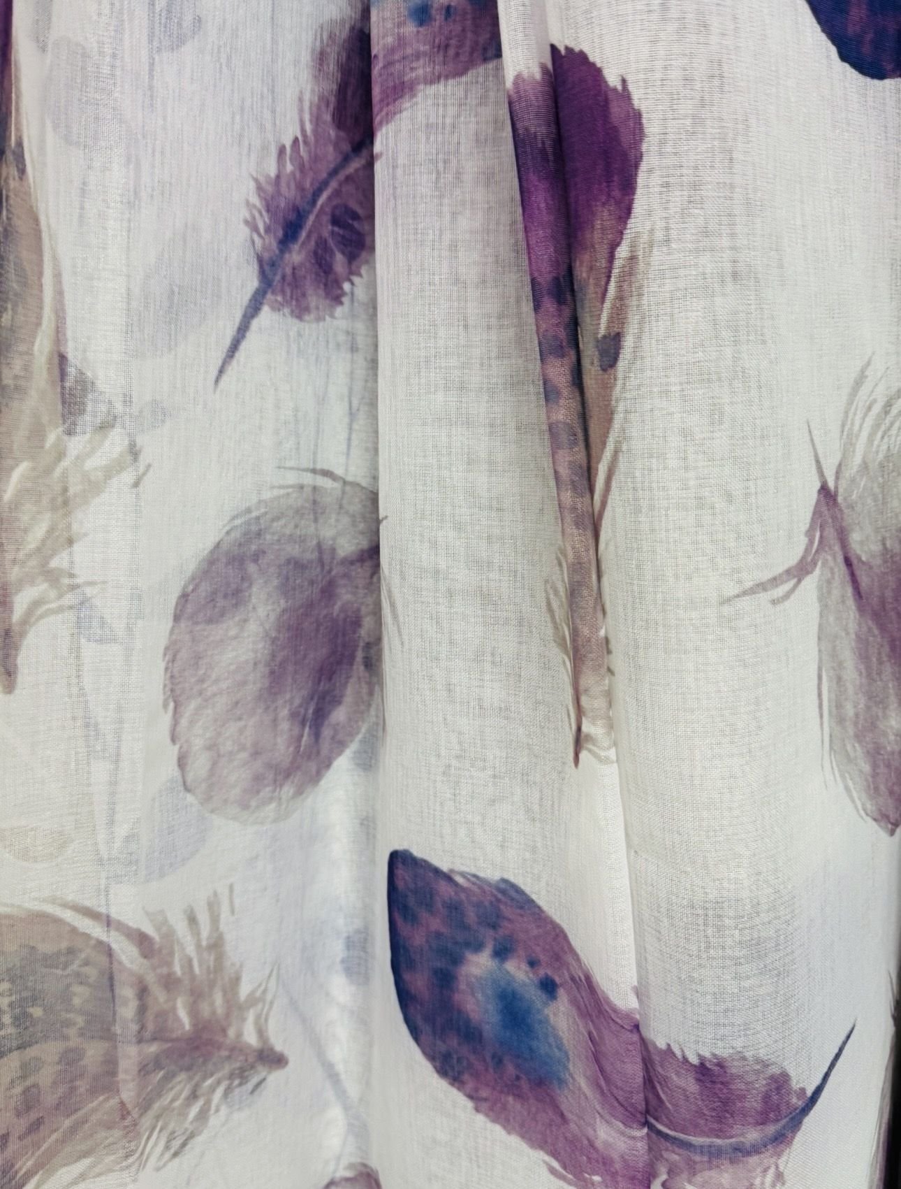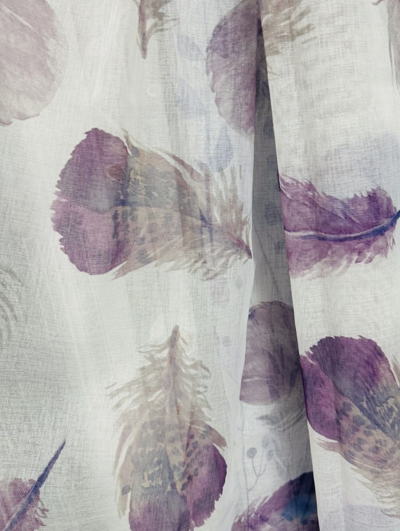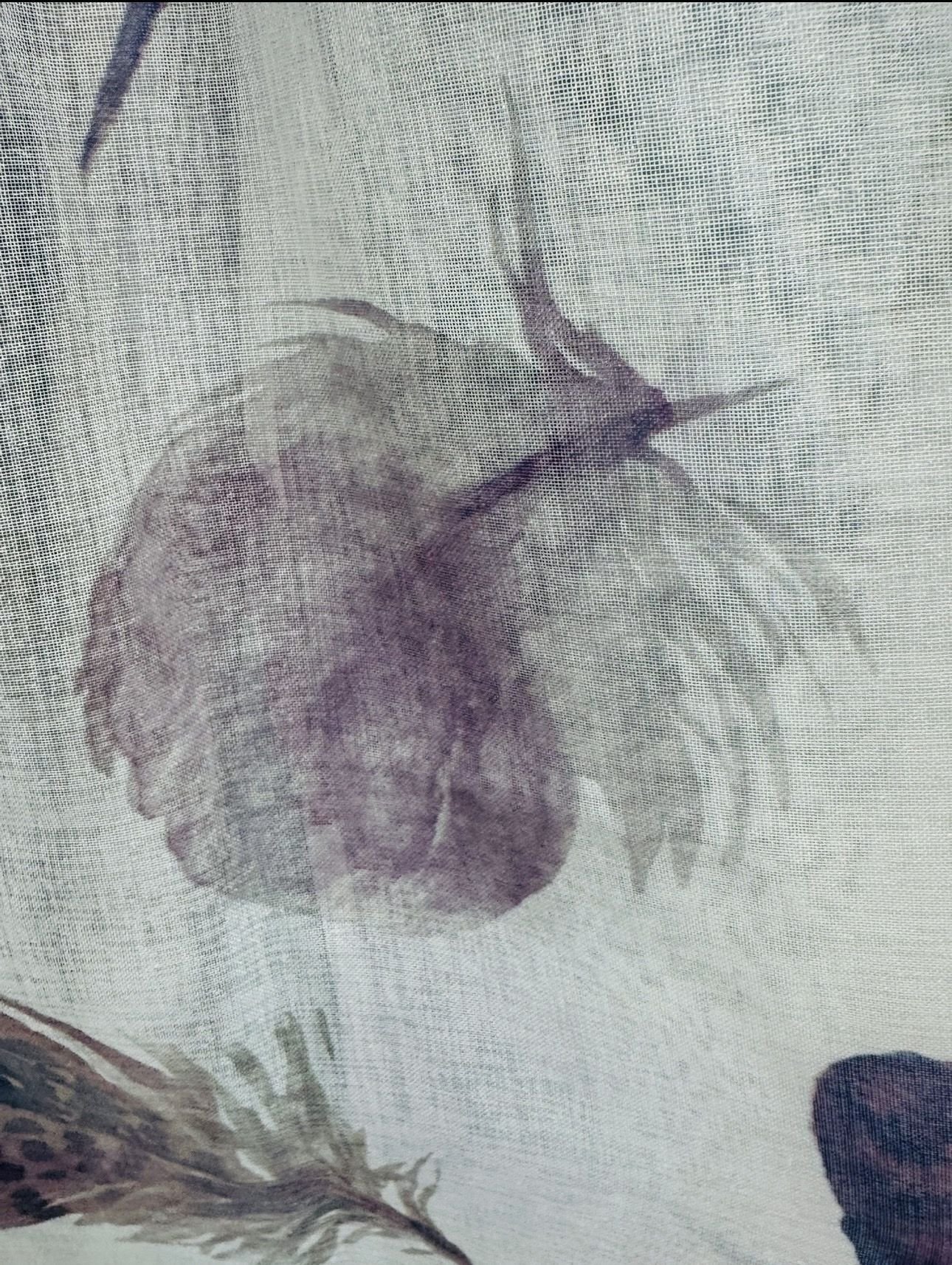 Cortina decorativa de estilo de rústico con un estilo y tacto muy natural. Modelo Cova en colores morados y grises, en fondo blanco natural, para decorar cualquier estancia. Confeccionadas en medida estándar, listas para su fácil colocación mediante su sistema de ollaos.