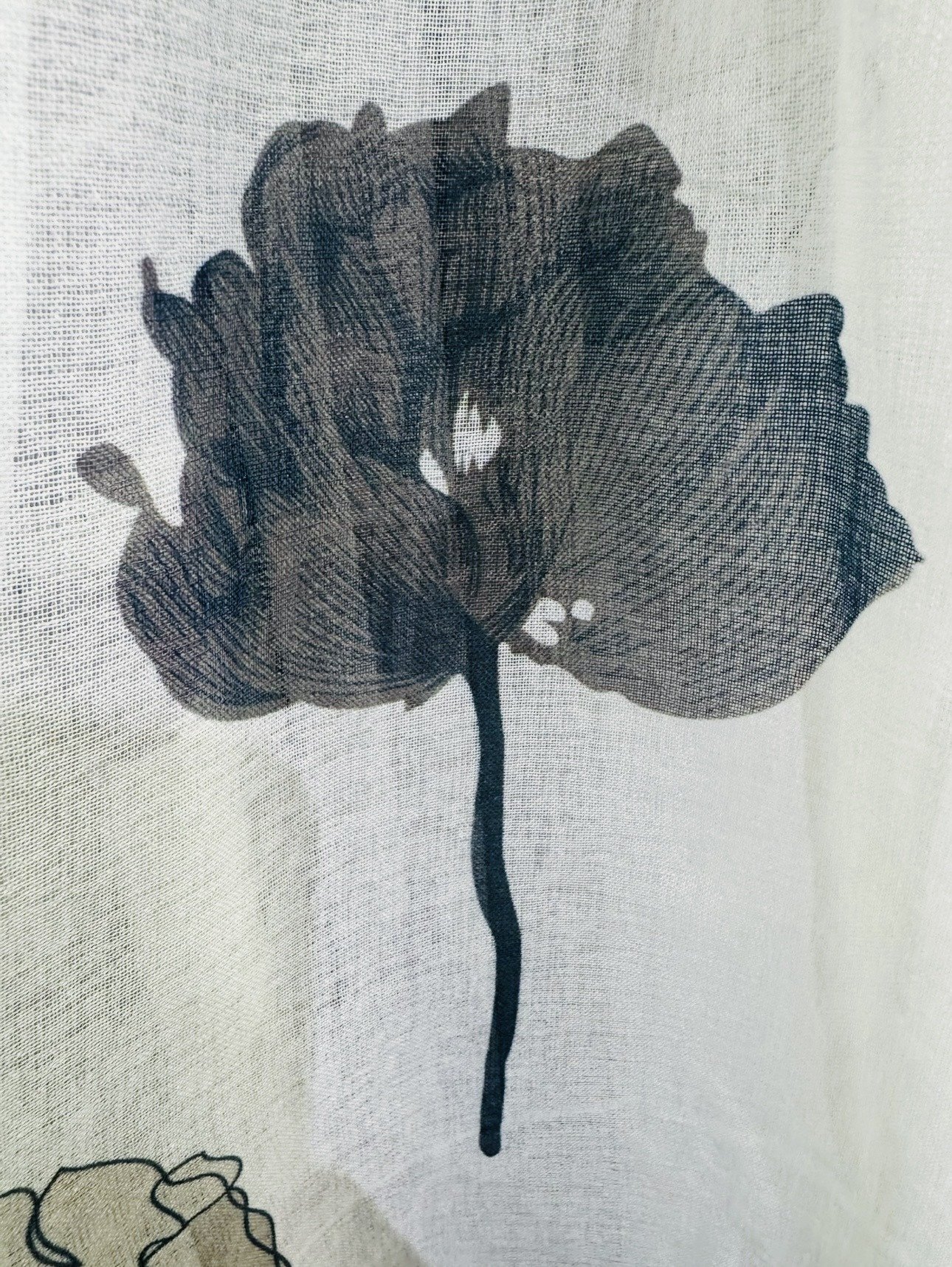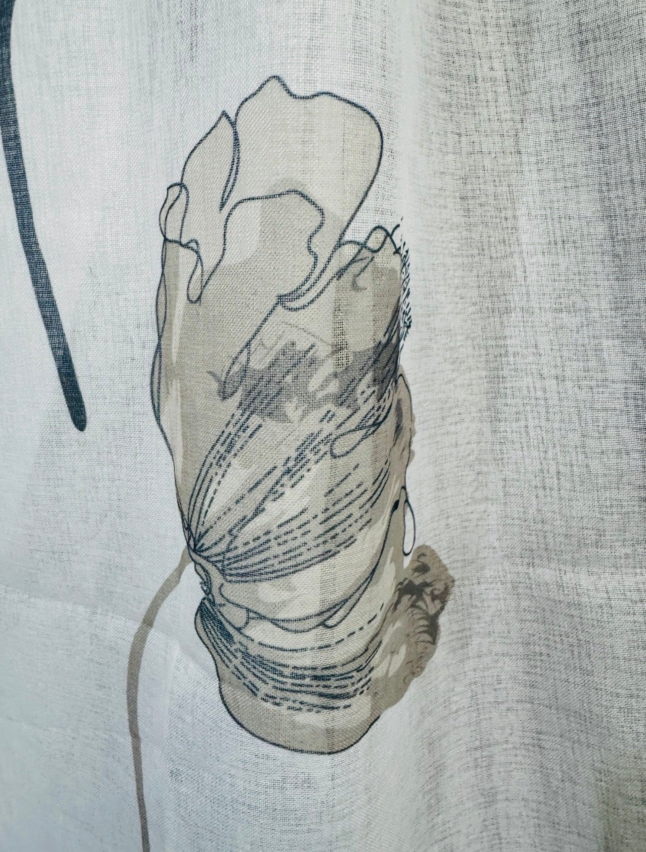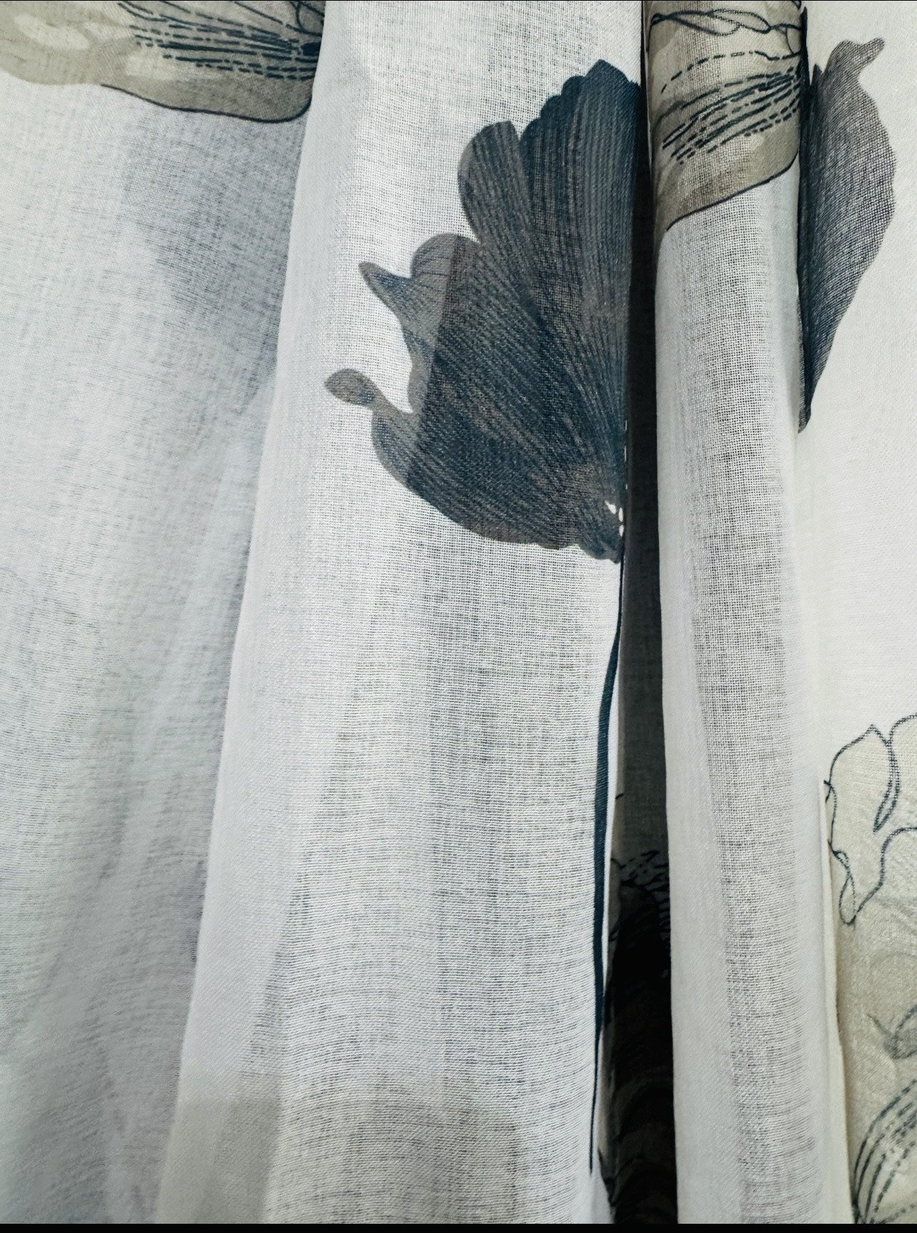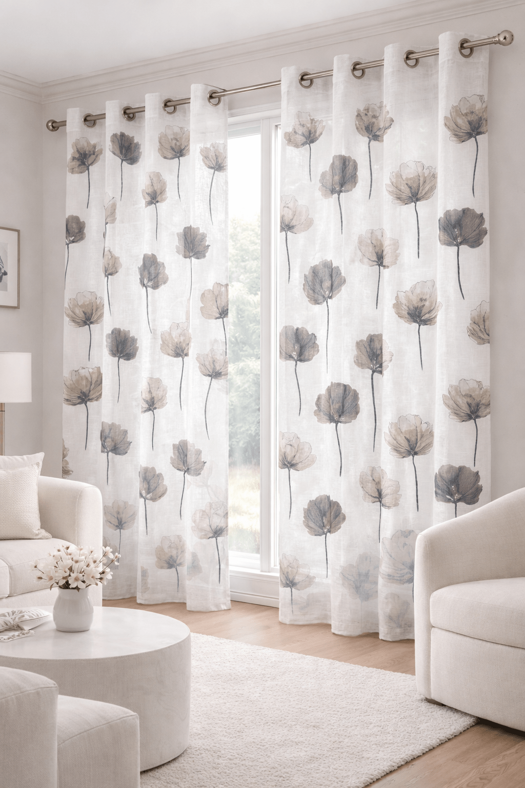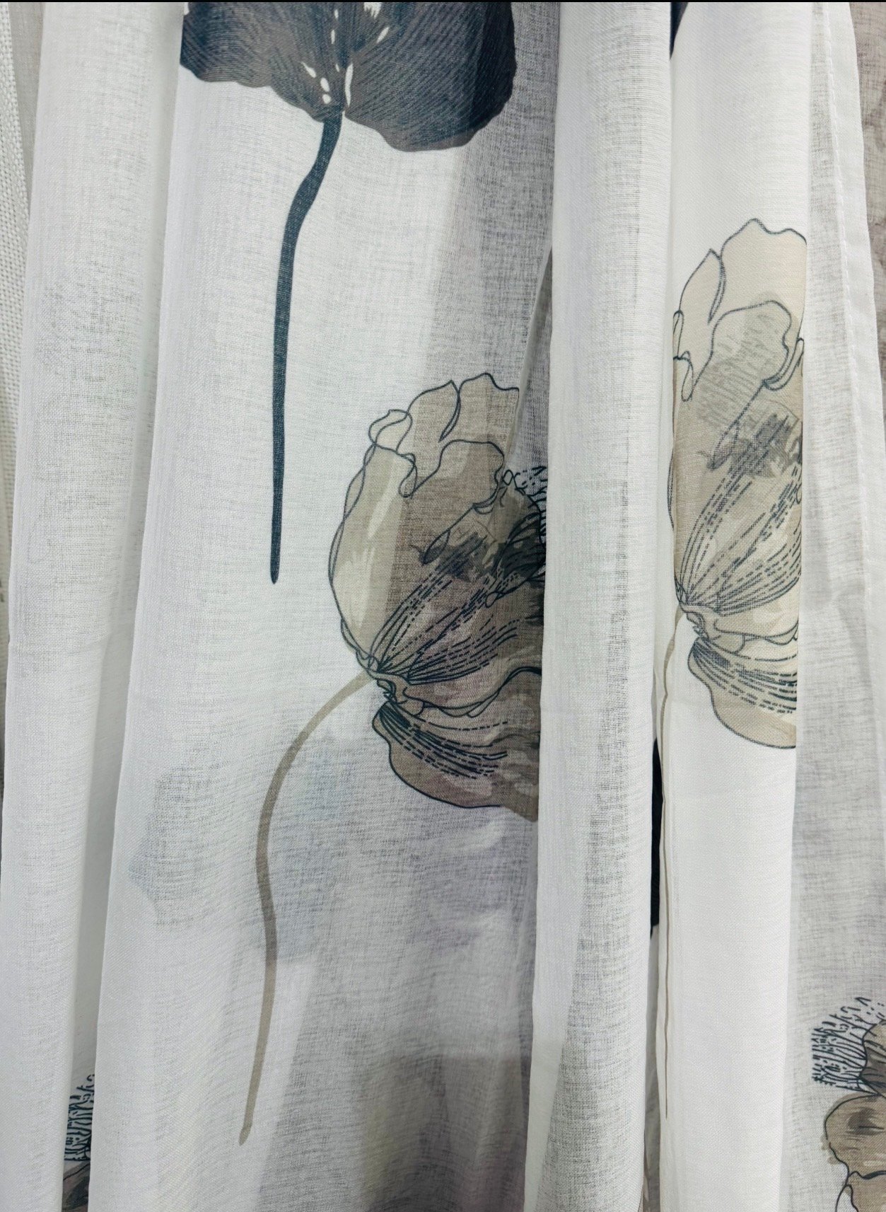 Cortina decorativa de estilo de rústico con un estilo y tacto muy natural. Modelo Dolly hojas grandes en colores grises y beige en fondo natural, para decorar cualquier estancia. Confeccionadas en medida estándar, listas para su fácil colocación mediante su sistema de ollaos.