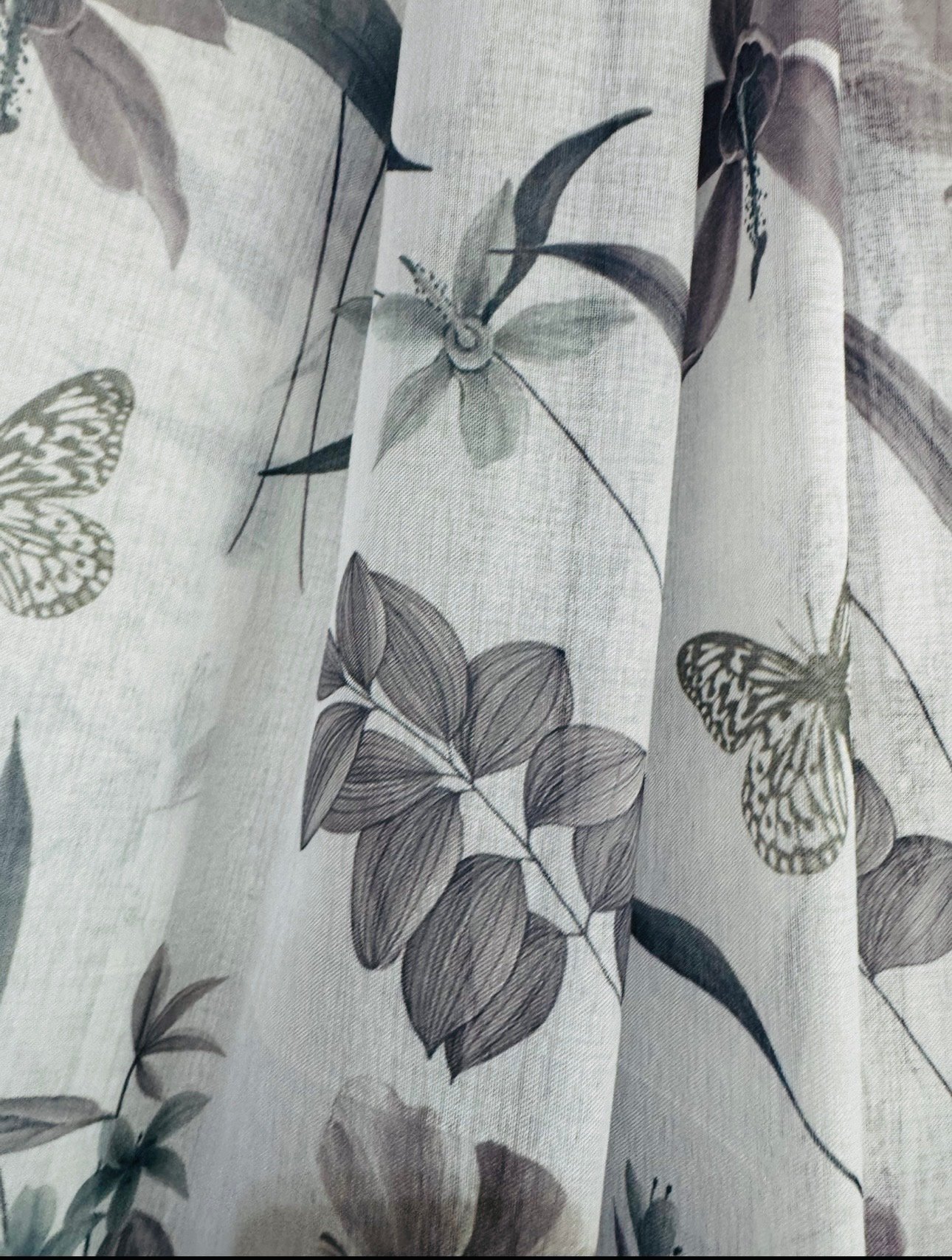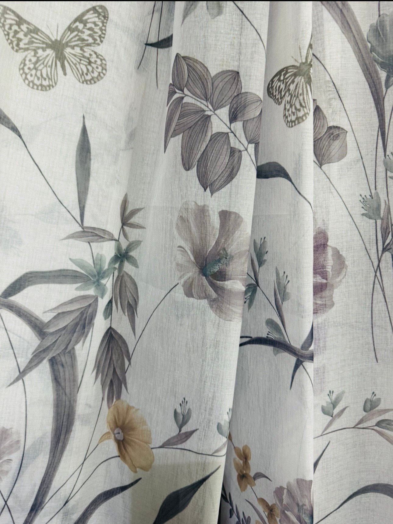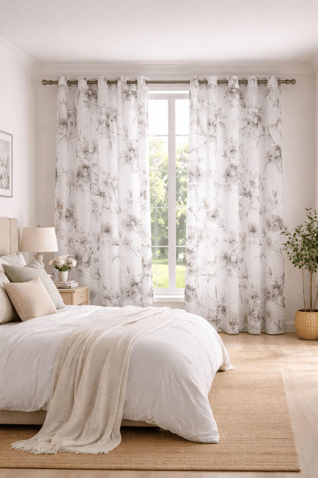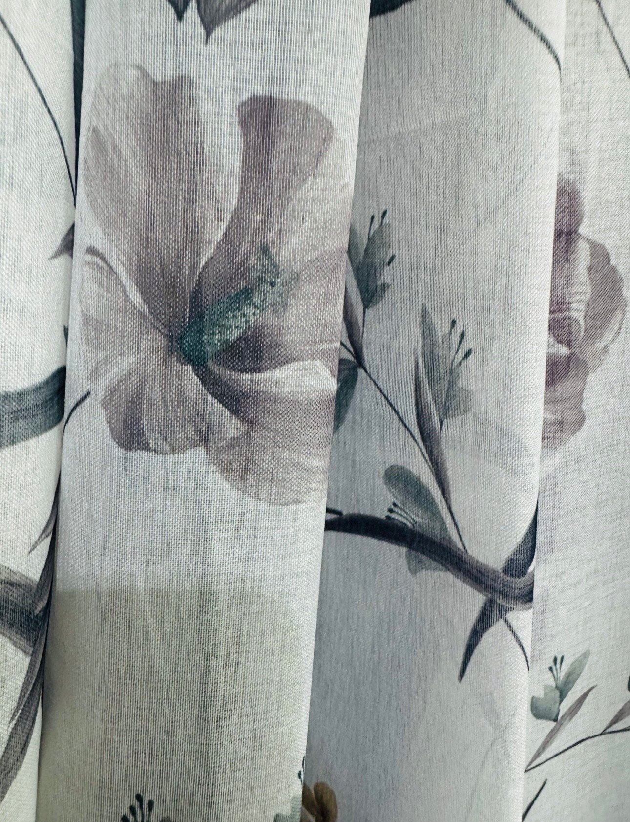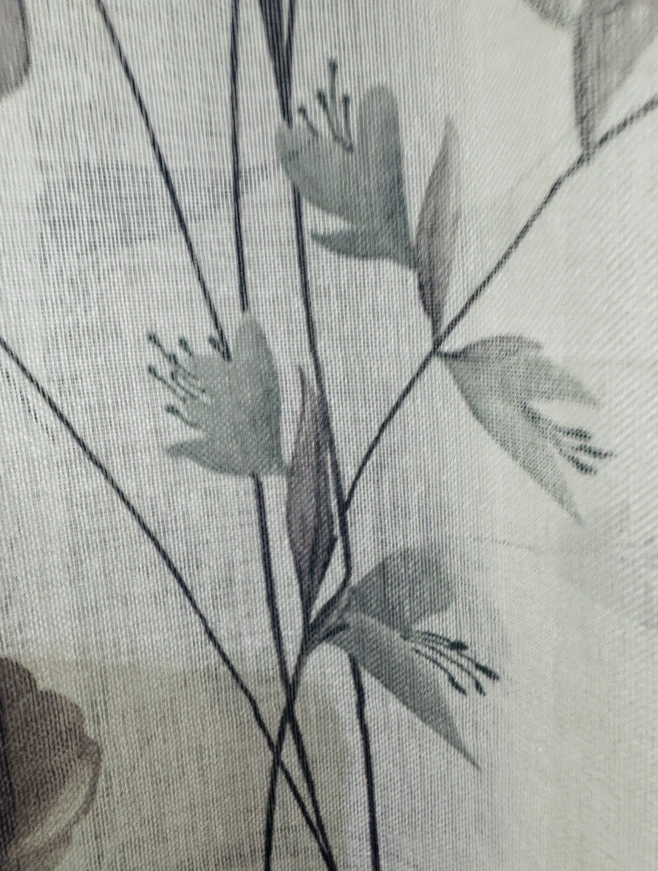 Cortina decorativa de estilo de rústico con un estilo y tacto muy natural. Modelo flores de colores beige y grises en fondo natural, para decorar cualquier estancia. Confeccionadas en medida estándar, listas para su fácil colocación mediante su sistema de ollaos.