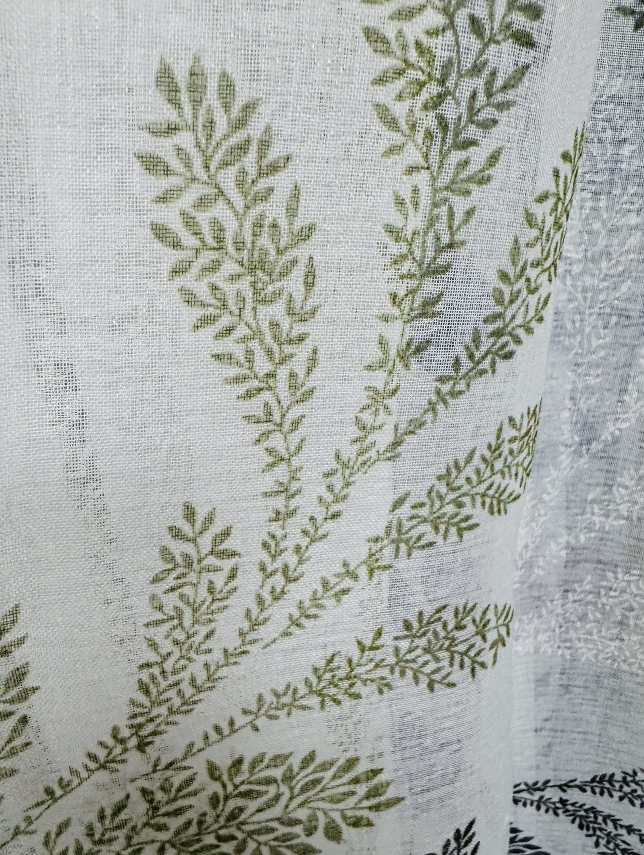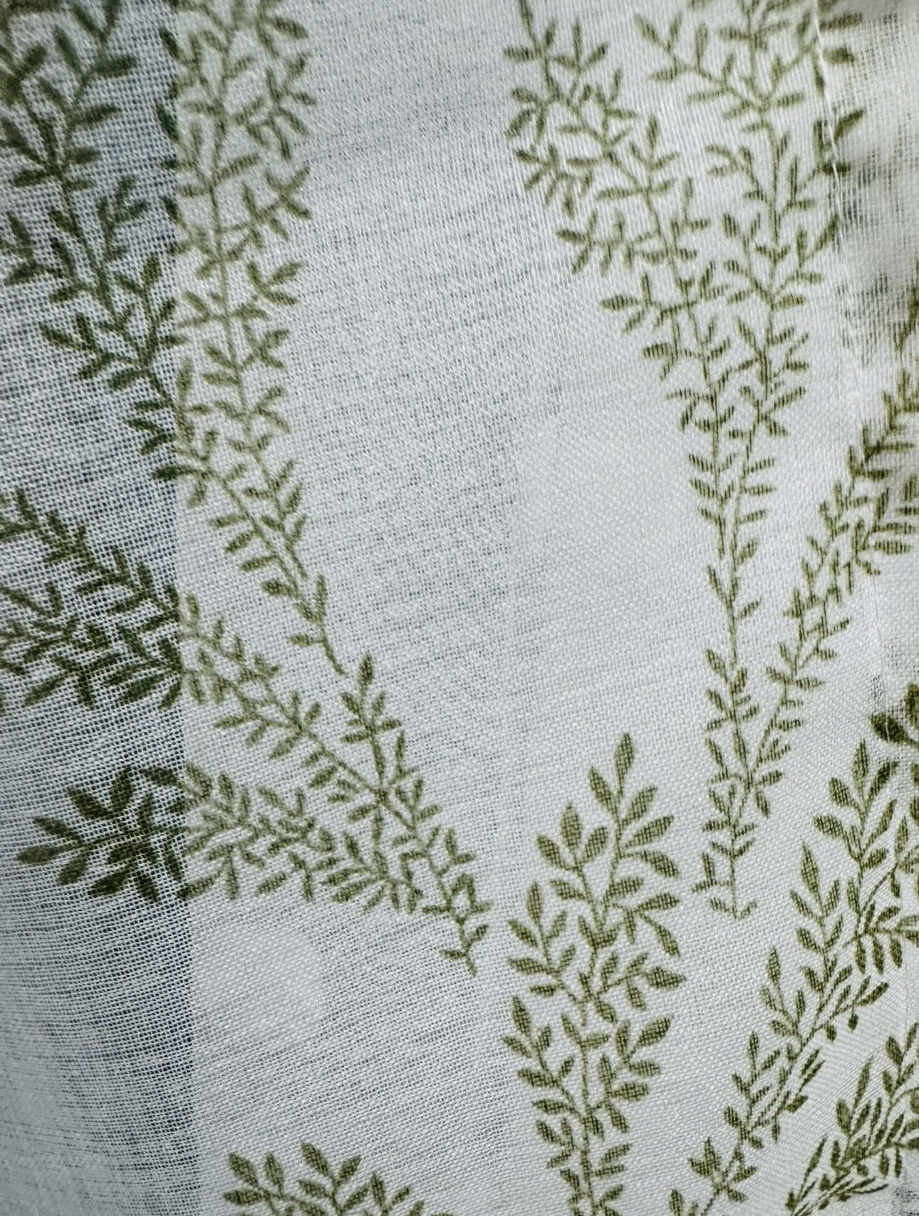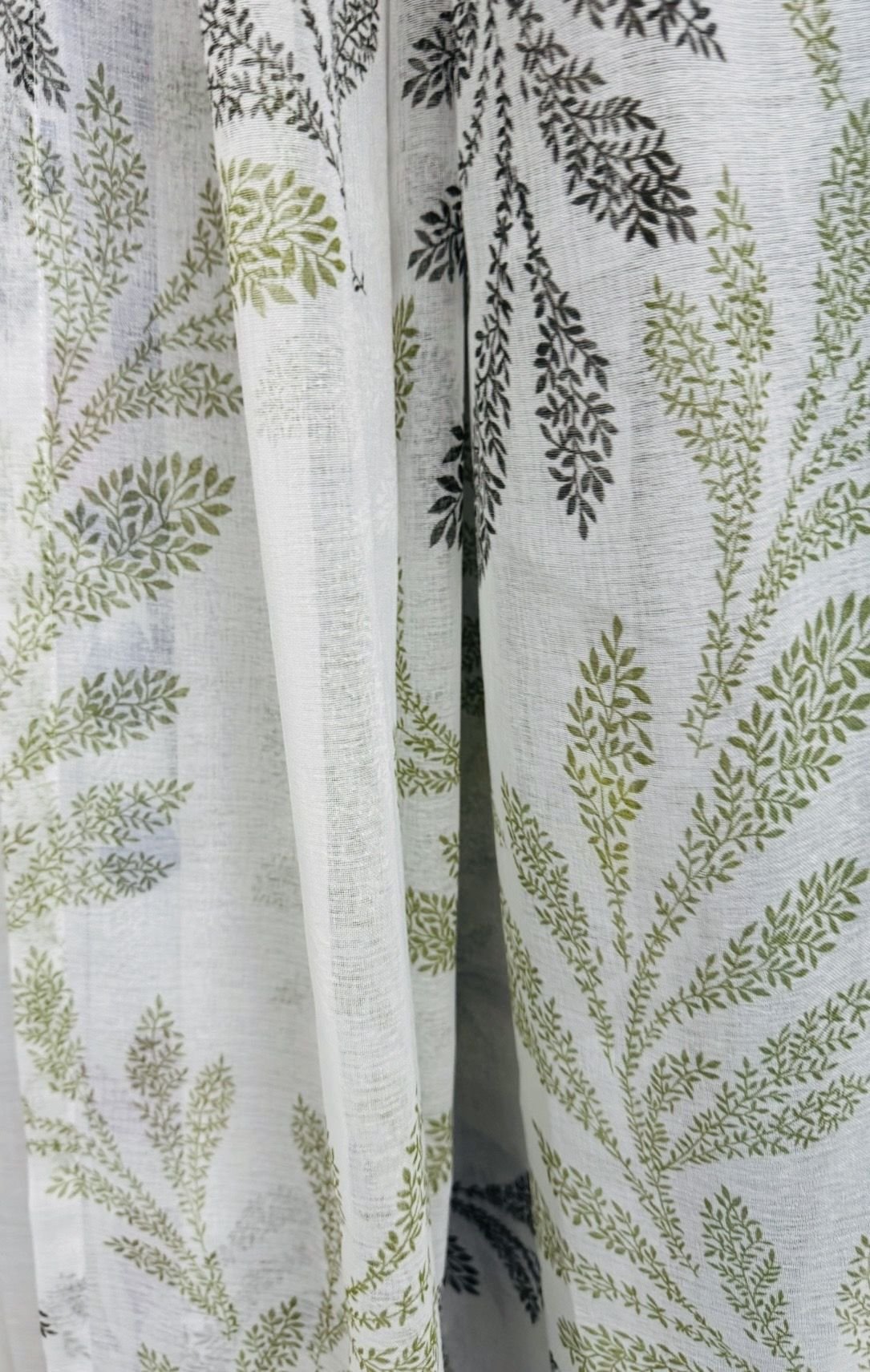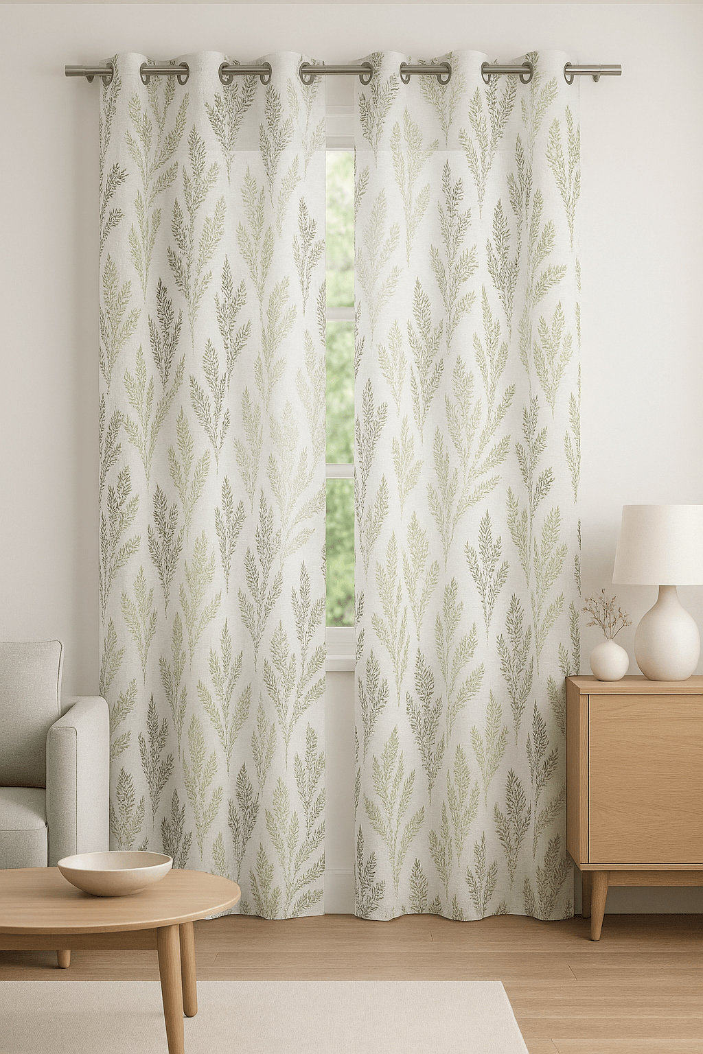 Cortina decorativa de estilo de rústico con un estilo y tacto muy natural. Modelo hojas naturales pequeñas en colores verdes y grises oscuros, en fondo blanco natural, para decorar cualquier estancia. Confeccionadas en medida estándar, listas para su fácil colocación mediante su sistema de ollaos.