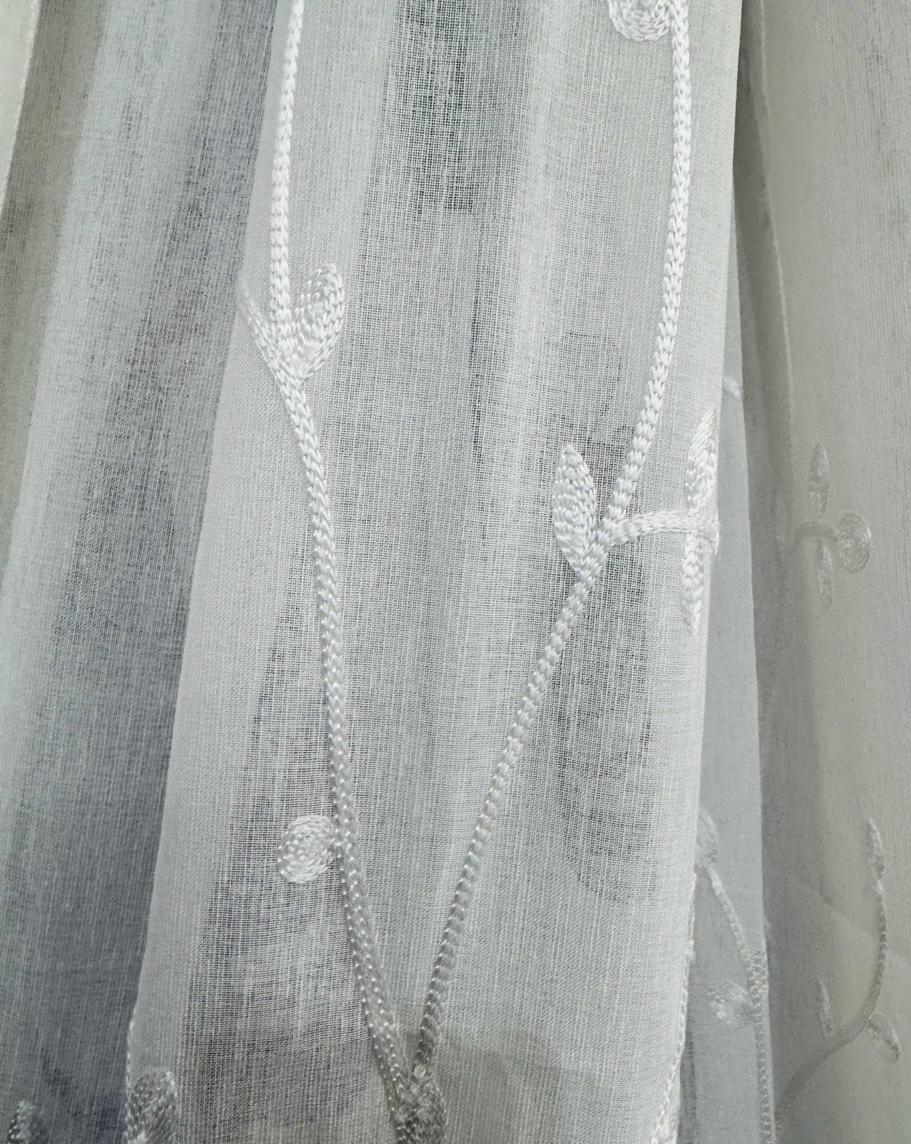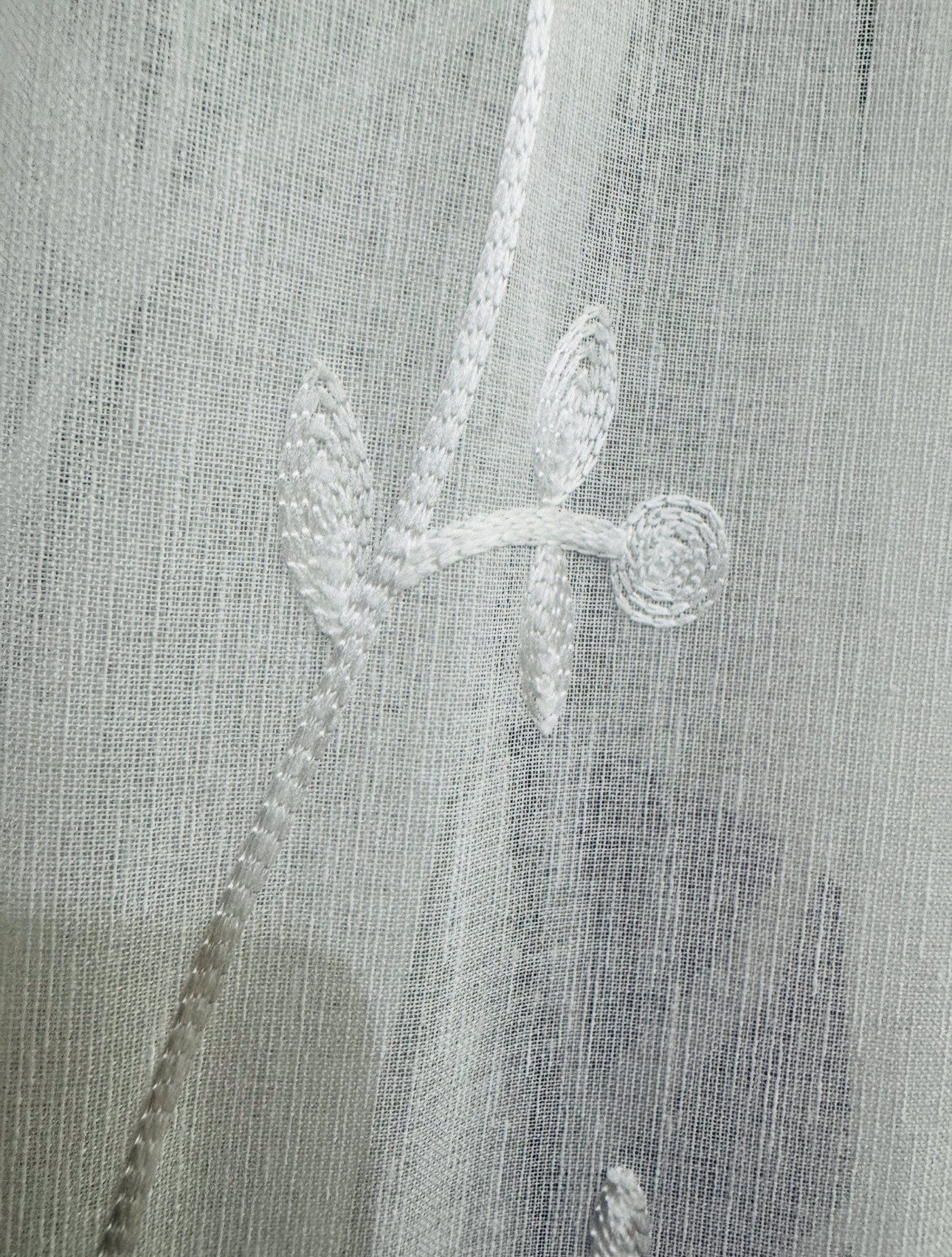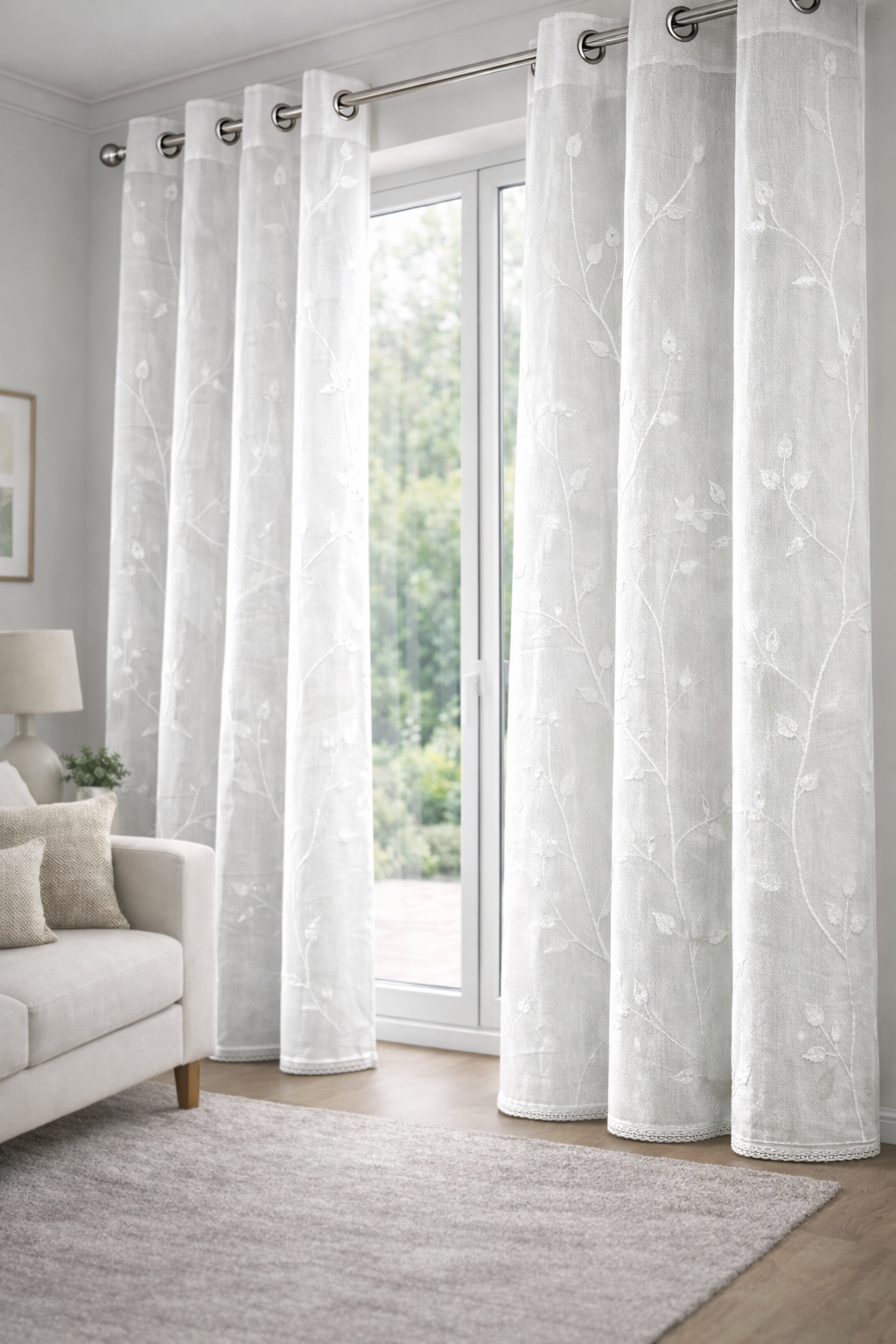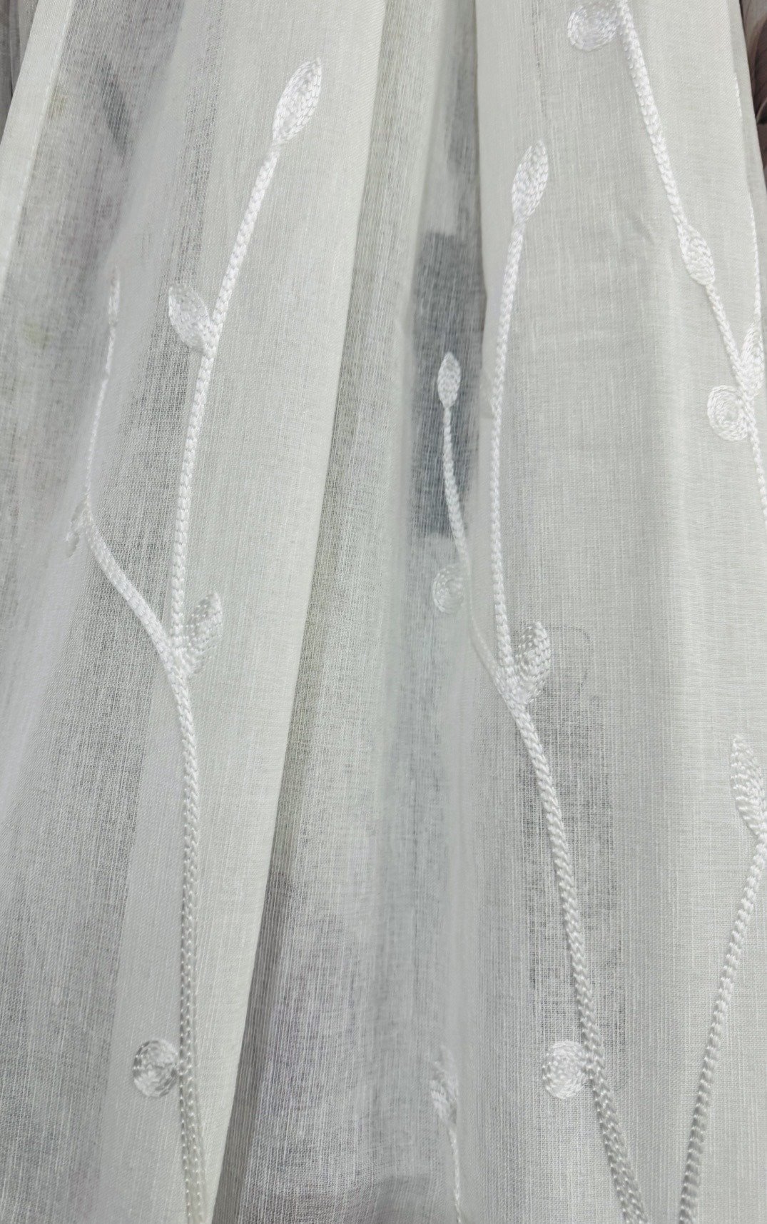Cortina decorativa de estilo de rústico con un estilo y tacto muy natural. Modelo Espiga con bordados en blanco en un fondo natural, para decorar cualquier estancia. Confeccionadas en medida estándar, listas para su fácil colocación mediante su sistema de ollaos.