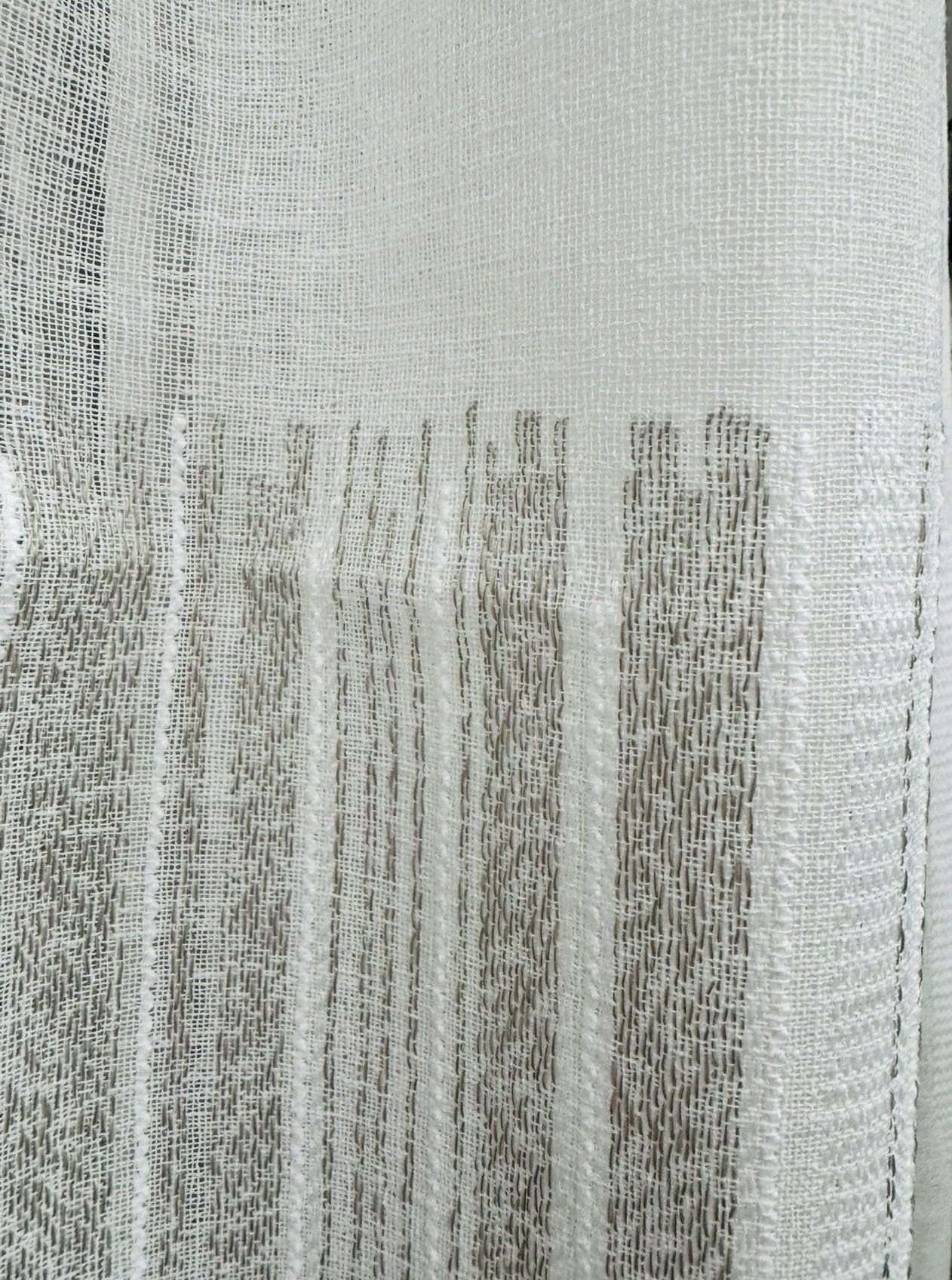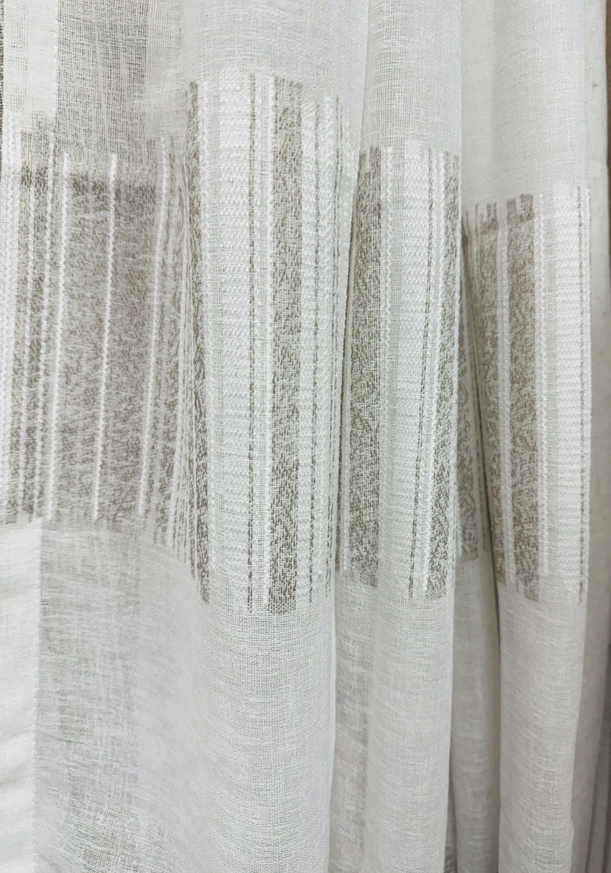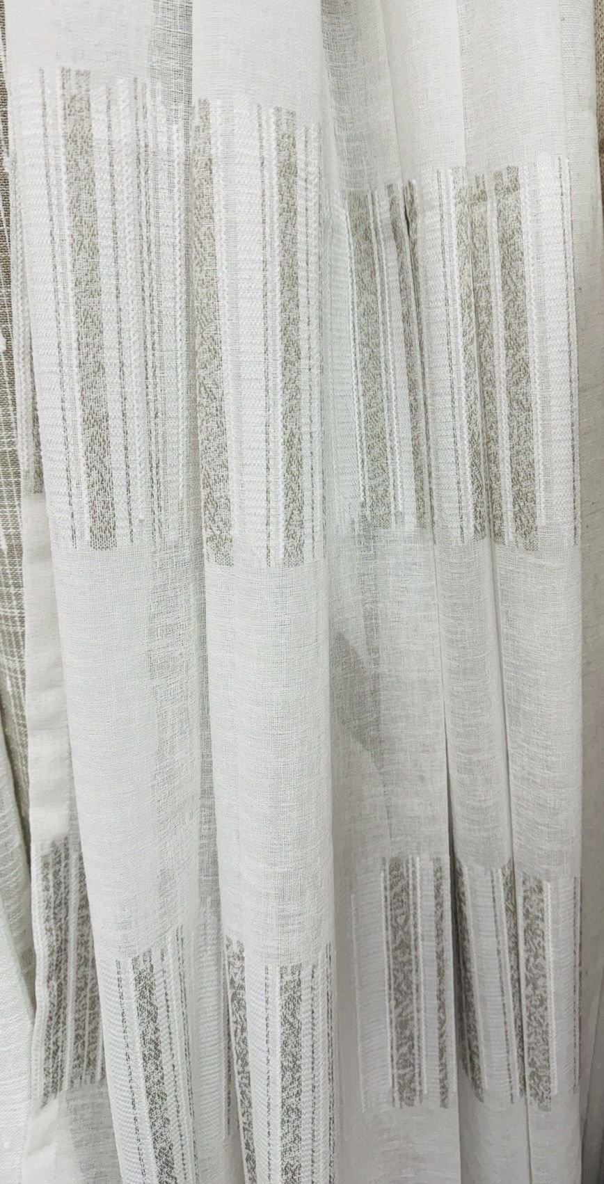 Cortina decorativa de estilo de rústico con un estilo y tacto muy natural. Modelo V021 rayas color beige y blancas en un fondo natural con jaspeados efecto lino, para decorar cualquier estancia. Confeccionadas en medida estándar, listas para su fácil colocación mediante su sistema de ollaos.