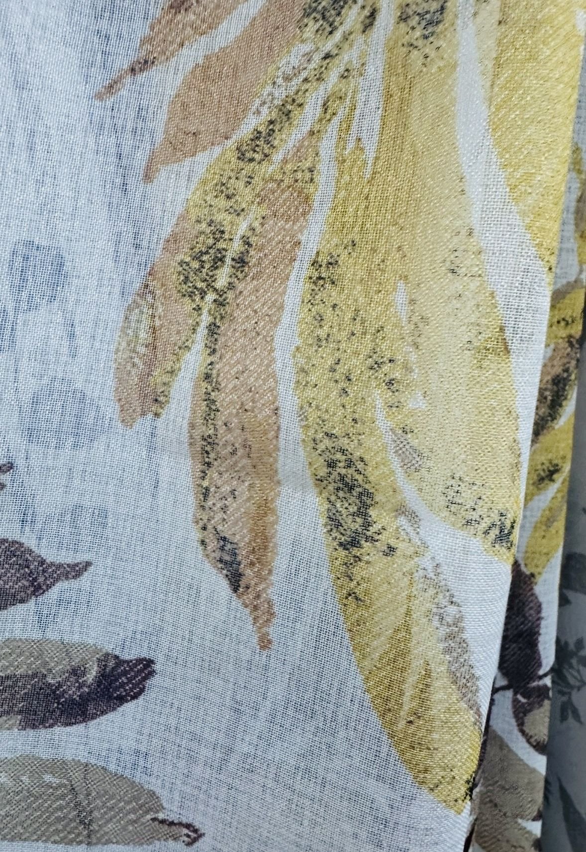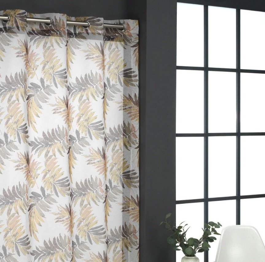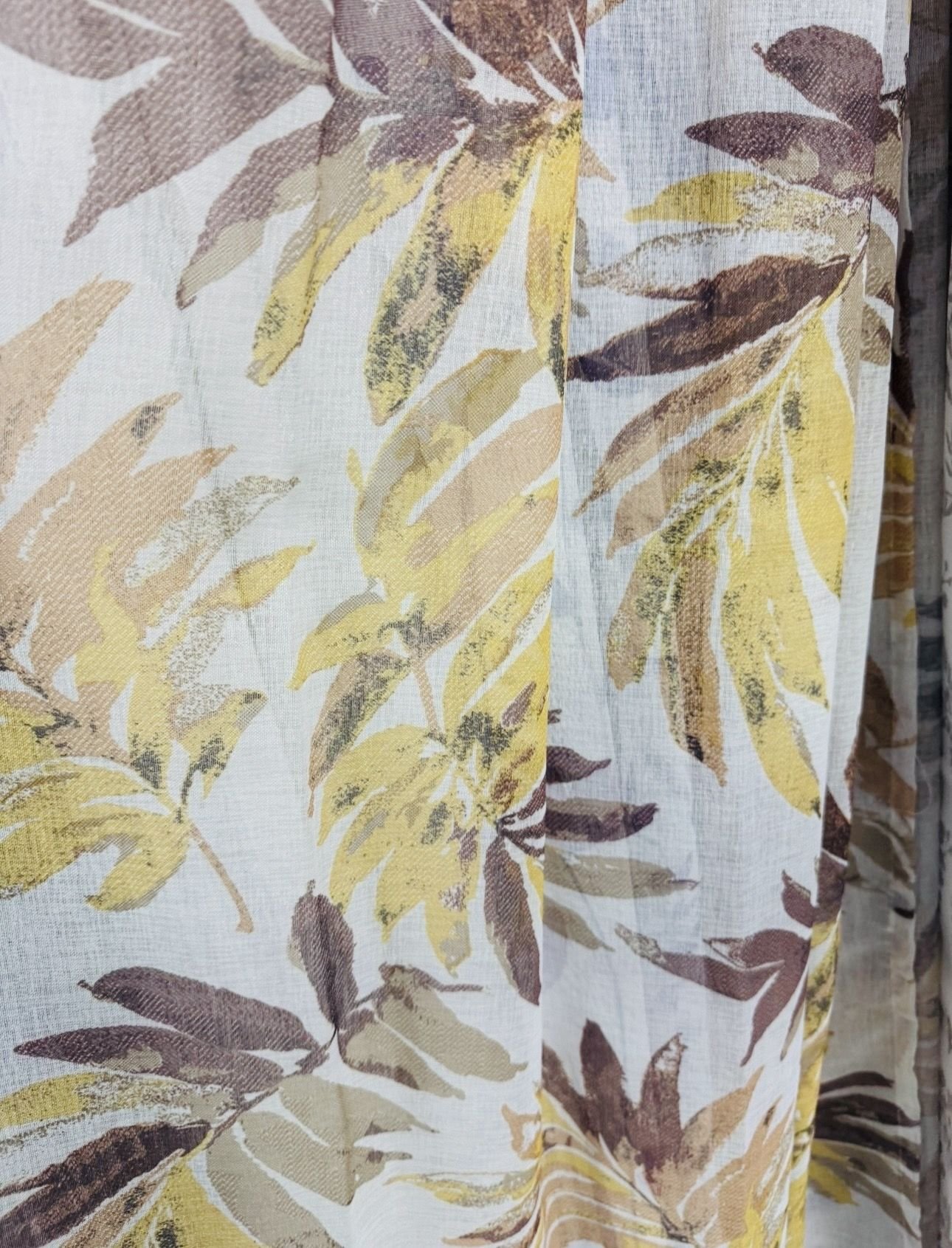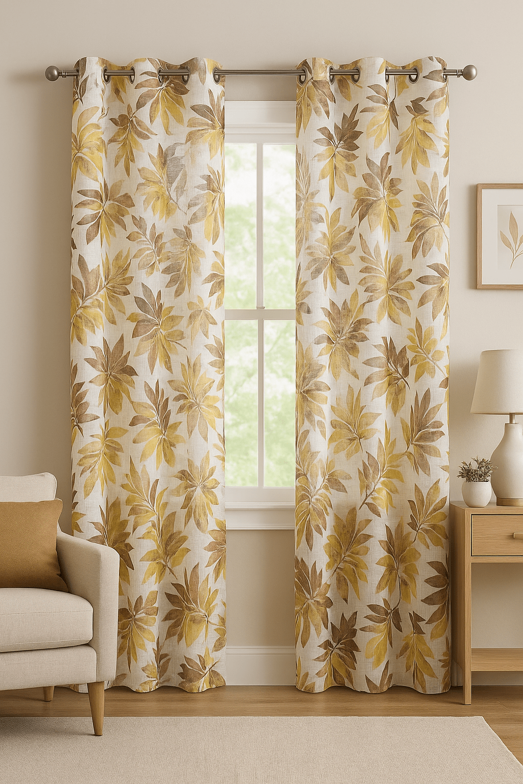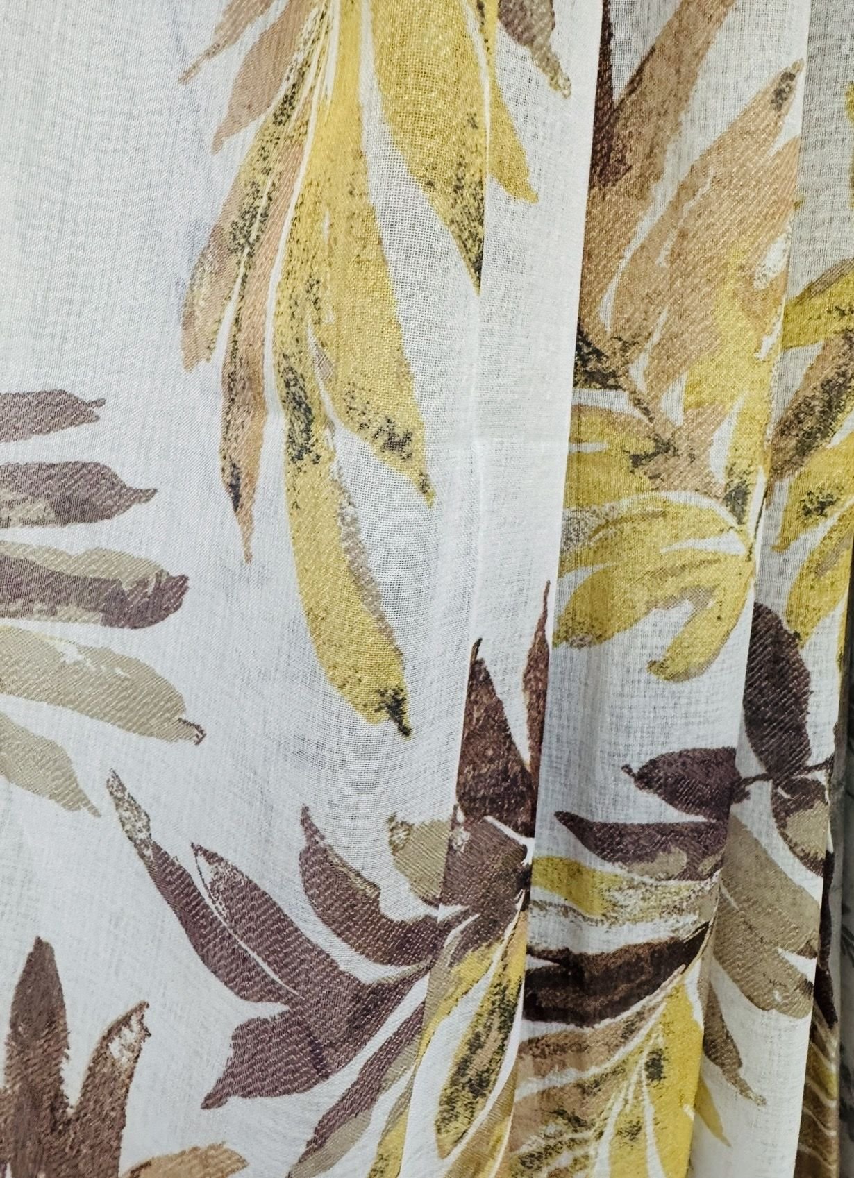 Cortina decorativa de estilo de rústico con un estilo y tacto muy natural. Modelo Tanzania con un estampado de hojas color tostado, marrón y amarillo mostaza en fondo natural, para decorar cualquier estancia. Confeccionadas en medida estándar, listas para su fácil colocación mediante su sistema de ollaos.