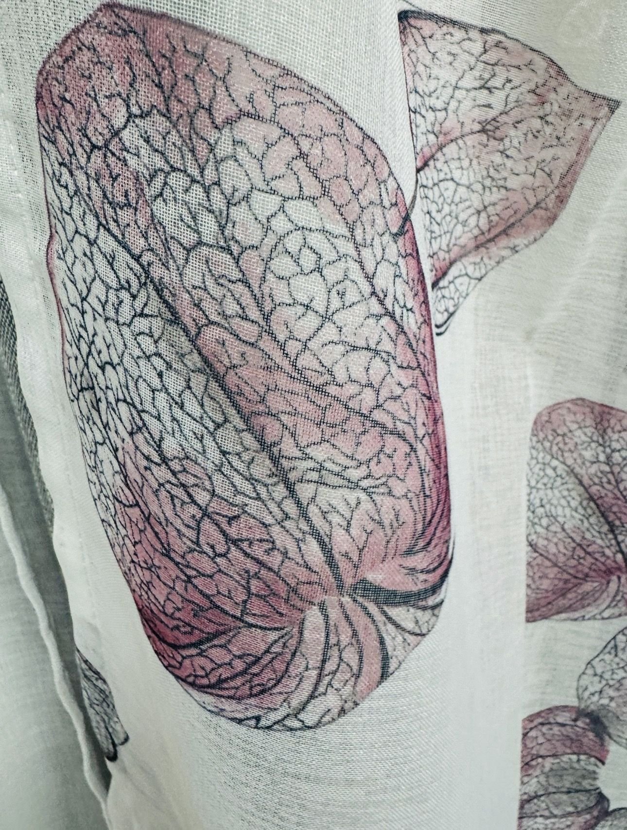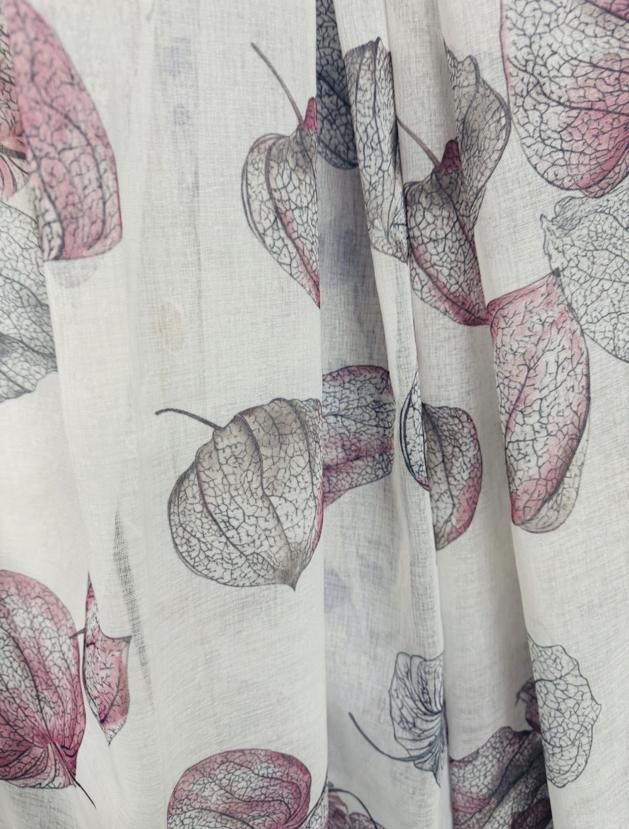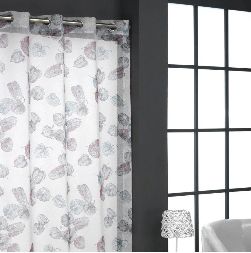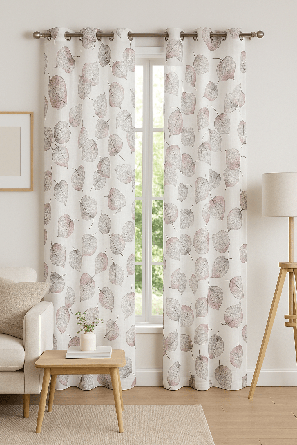 Cortina decorativa de estilo de rústico con un estilo y tacto muy natural. Modelo Toscana en colores granates y grises oscuros, en fondo blanco natural, para decorar cualquier estancia. Confeccionadas en medida estándar, listas para su fácil colocación mediante su sistema de ollaos.