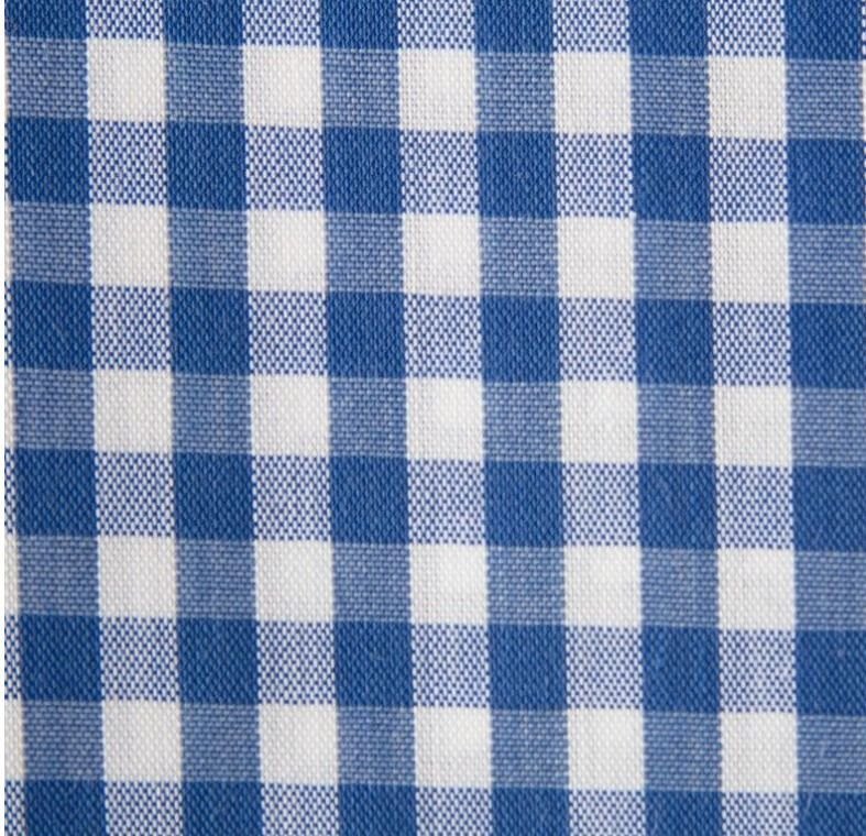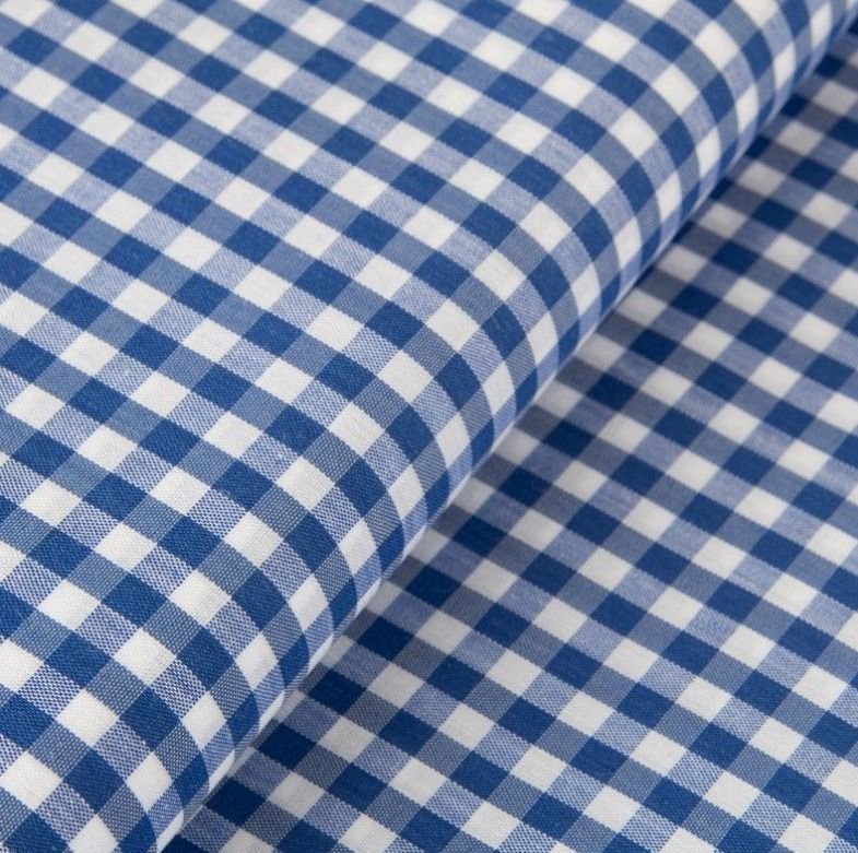 Tela de cuadros Vichy azules de 5 milímetros. El cuadro Vichy es una tela sostenida y fina, ideal para batas de colegios, bolsa para el pan y manteles. El cuadro de Vichy se utiliza para manualidades, decoración y labores.