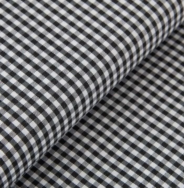 Tela de cuadros Vichy negros de 3 milímetros. El cuadro Vichy es una tela sostenida y fina, ideal para batas de colegios, bolsa para el pan y manteles. El cuadro de Vichy se utiliza para manualidades, decoración y labores.