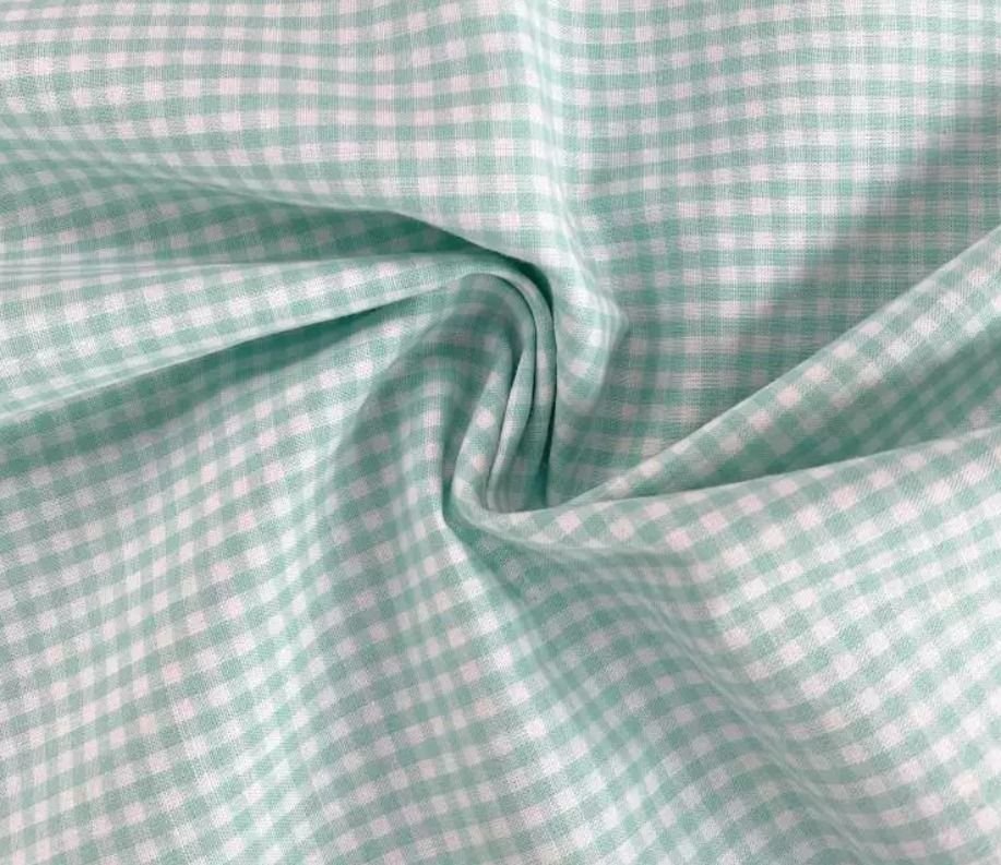 Tela de cuadros Vichy verde agua de 3 milímetros. El cuadro Vichy es una tela sostenida y fina, ideal para batas de colegios, bolsa para el pan y manteles. El cuadro de Vichy se utiliza para manualidades, decoración y labores.
