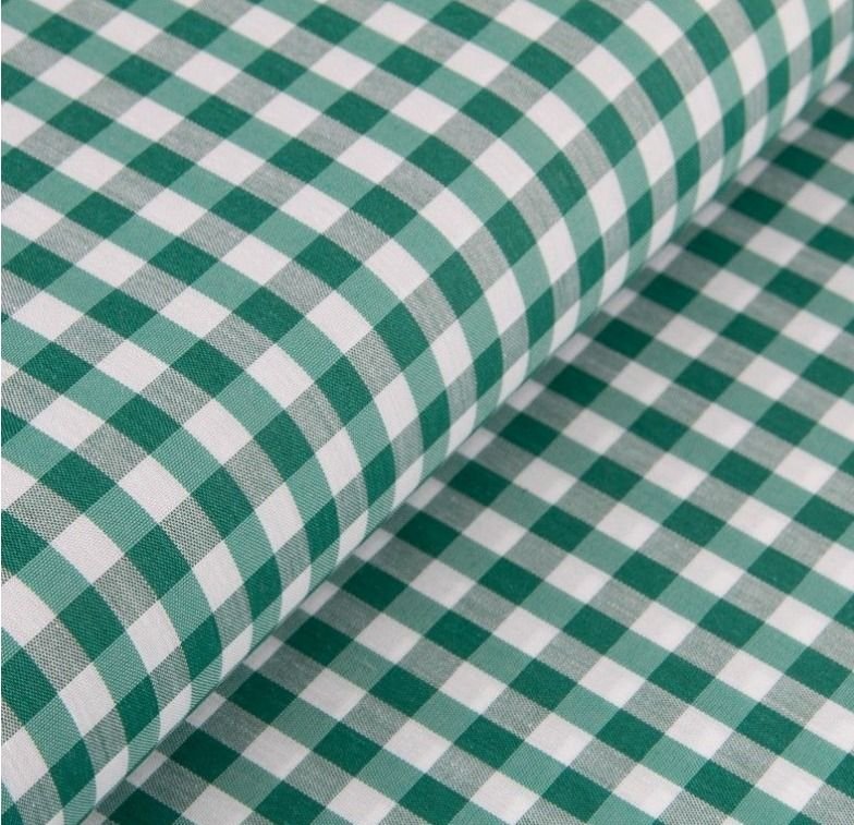 Tela de cuadros Vichy verdes de 5 milímetros. El cuadro Vichy es una tela sostenida y fina, ideal para batas de colegios, bolsa para el pan y manteles. El cuadro de Vichy se utiliza para manualidades, decoración y labores.