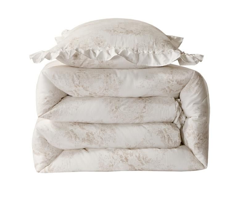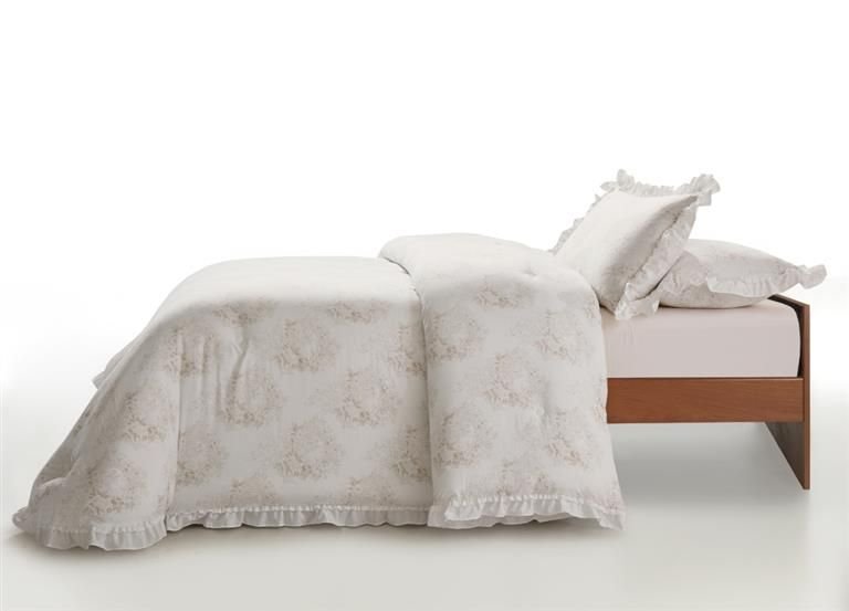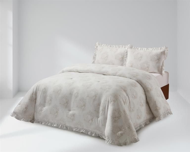 Conjunto de edredón de tejido extra suave con estampado con diseño de toile de jouy, fundas de cojín a juego de 50X70 y doble volante. Guateado con puntos de ajuste, con un relleno extra suave que le aporta relieve y un tacto muy agradable. Este conjunto es ideal para las frías noches de otoño e invierno. Las medidas para cama pequeña incluyen una funda de cojín y las de cama grande dos, el relleno no está incluido.