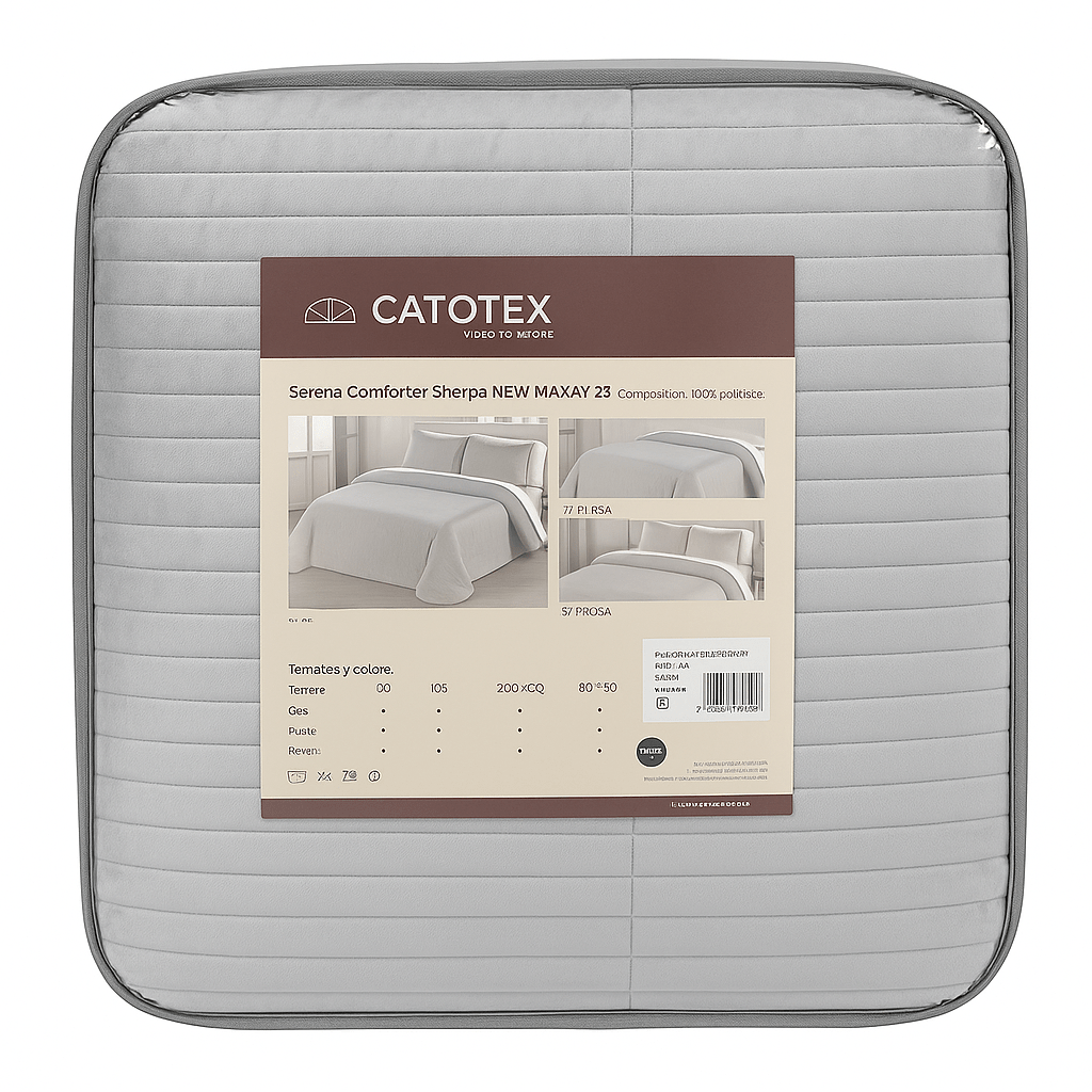 Edredón extra comforter Serena Sherpa modelo New Makay 25, acolchado completo con un gramaje total de 300 grs. Tejido exterior de microfibra y el interior del edredón de tejido Sherpa (manta de borreguito) con relleno interior de Fibra hueca siliconada dándole un poder calórico alto. Confección en forma abierta en las esquinas y terminado con cinta bies el los laterales.