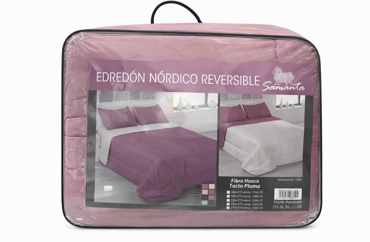 Relleno de primera calidad con alto poder calorífico y máximo volumen. Presentado en bolsa de maleta con cremallera. Fabricado en Valencia – España. Color rosa maquillaje y beige.
