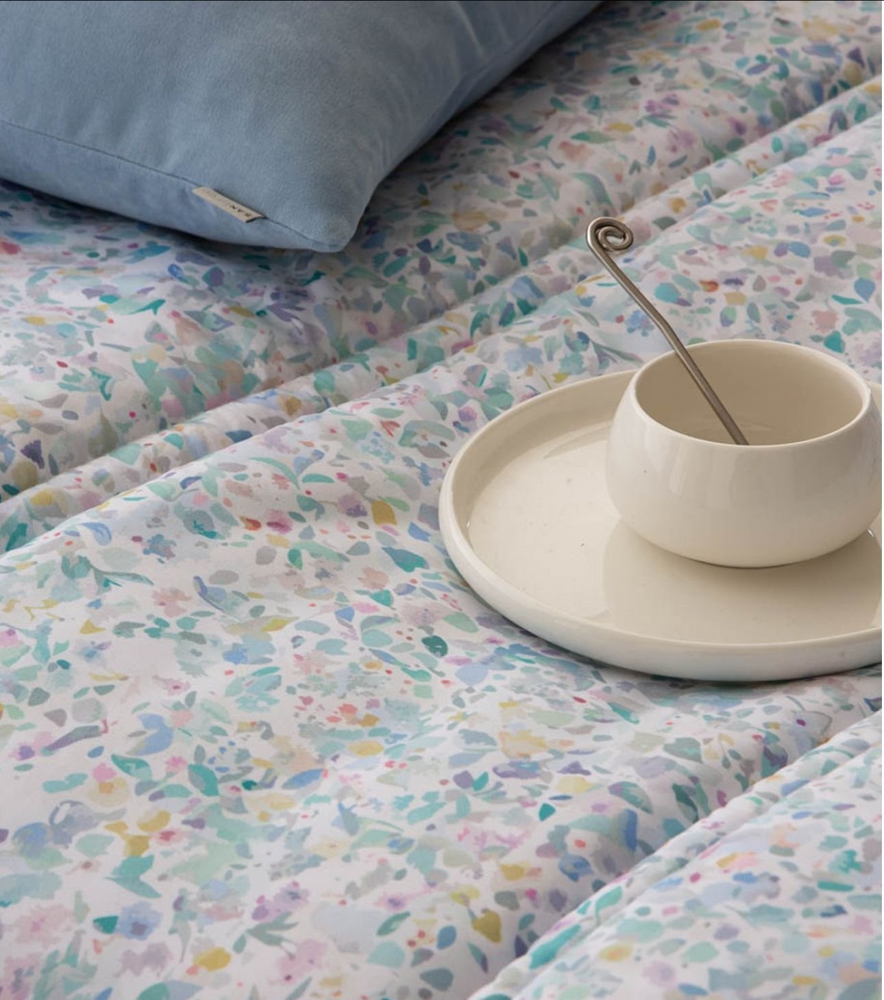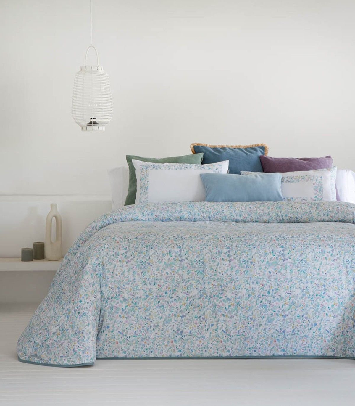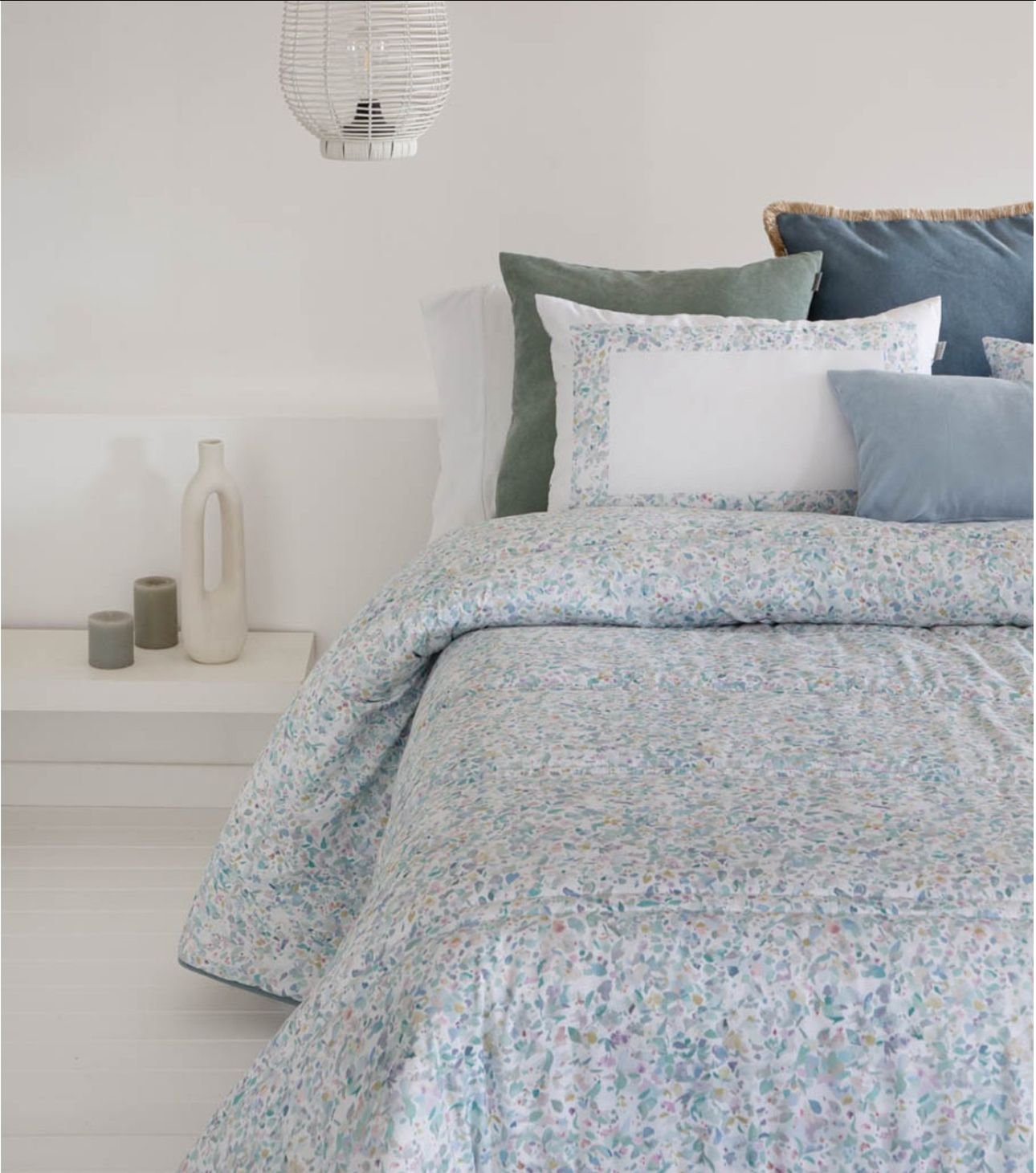 Su relleno mullido garantiza un equilibrio perfecto entre calidez y transpirabilidad, mientras que su exterior se realza con un delicado estampado de pequeñas flores acuareladas en tonos malva, aportando un toque romántico y equilibrado al dormitorio.