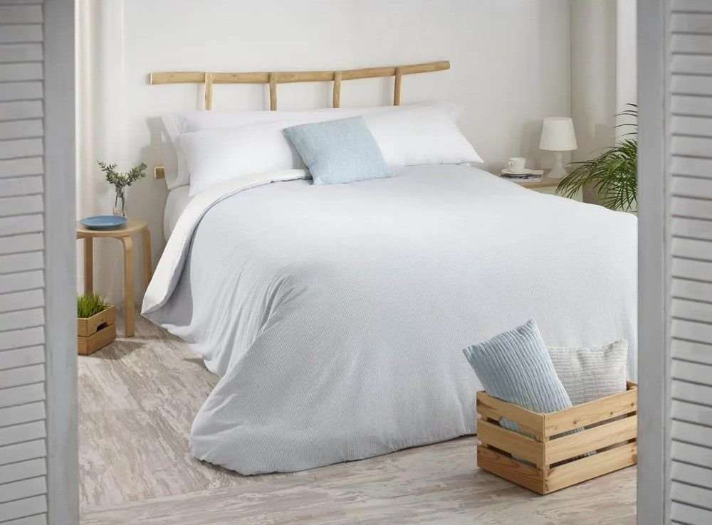 Funda nórdica de rayas, textura prelavada. Tej ext: 100% algodón de 145GSM. Tej int: 100% algodón de 100GSM – incluye 1 almohadón en camas pequeñas y 2 en camas de matrimonio.