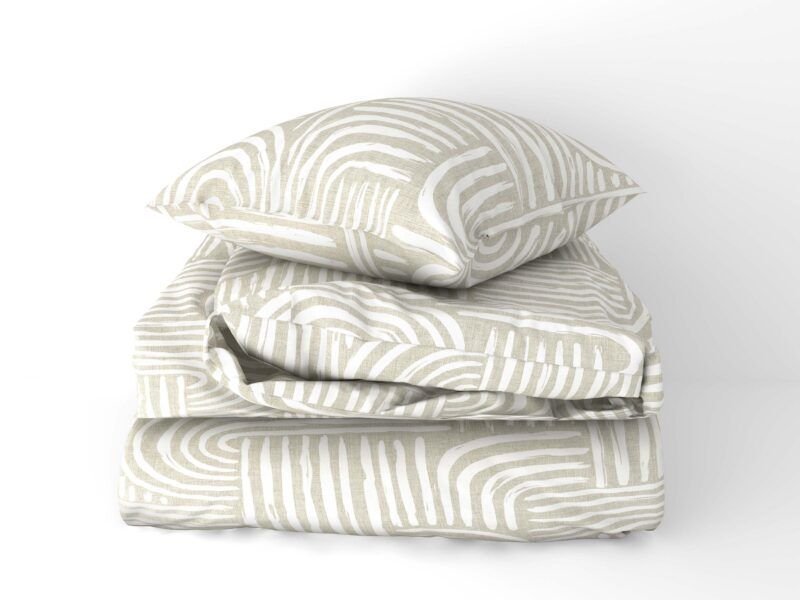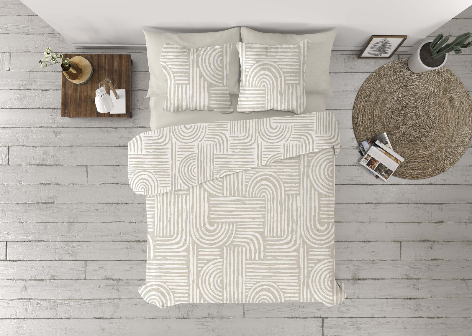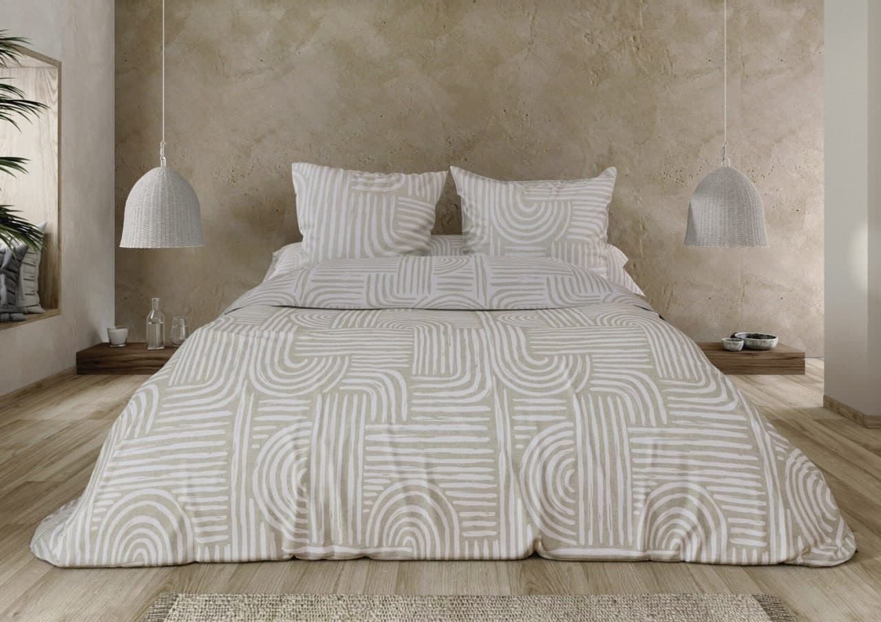 Funda nórdica Pierre Cardin Dafne en tonos beige y blancos, con diseño moderno y elegante. Juego completo con bajera ajustable, funda de almohada y saco nórdico. Tejido suave y resistente 50% algodón – 50% poliéster.