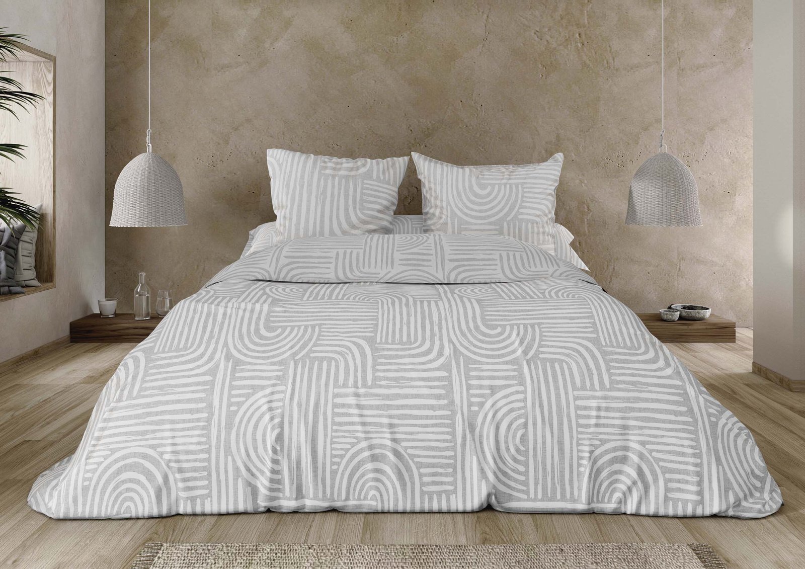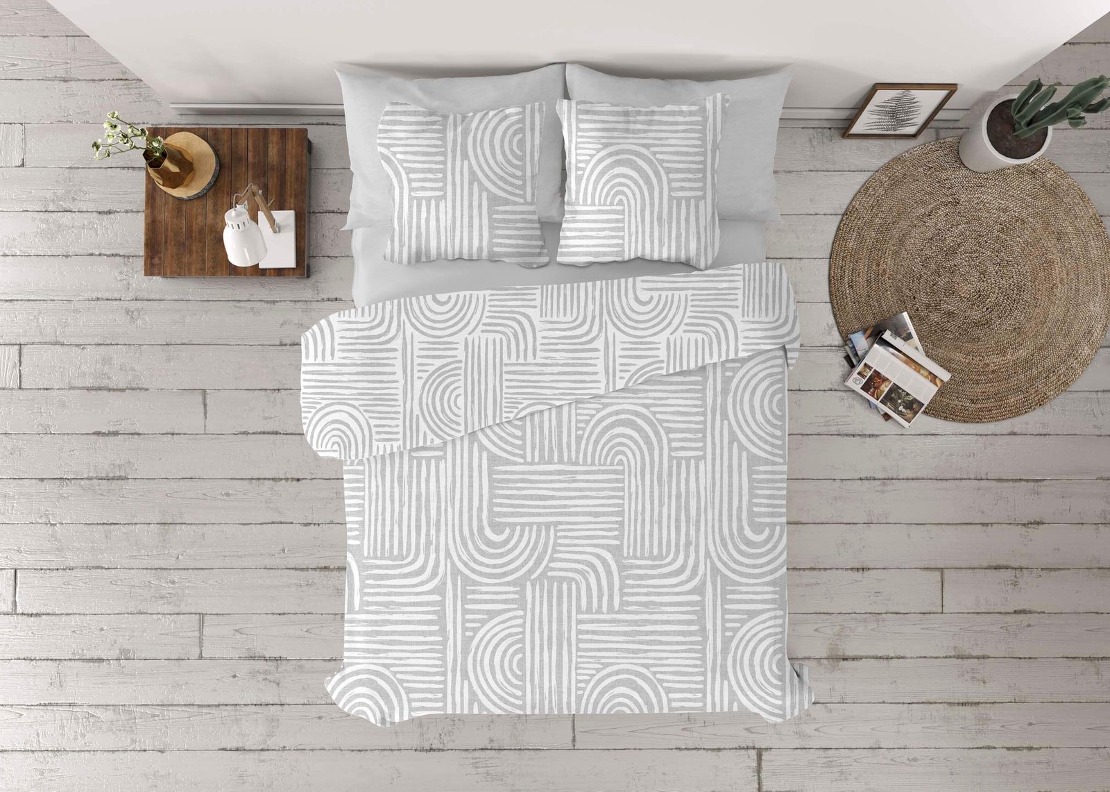 Funda nórdica Pierre Cardin Dafne en tonos grises y blancos, con diseño moderno y elegante. Juego completo con bajera ajustable, funda de almohada y saco nórdico. Tejido suave y resistente 50% algodón – 50% poliéster.