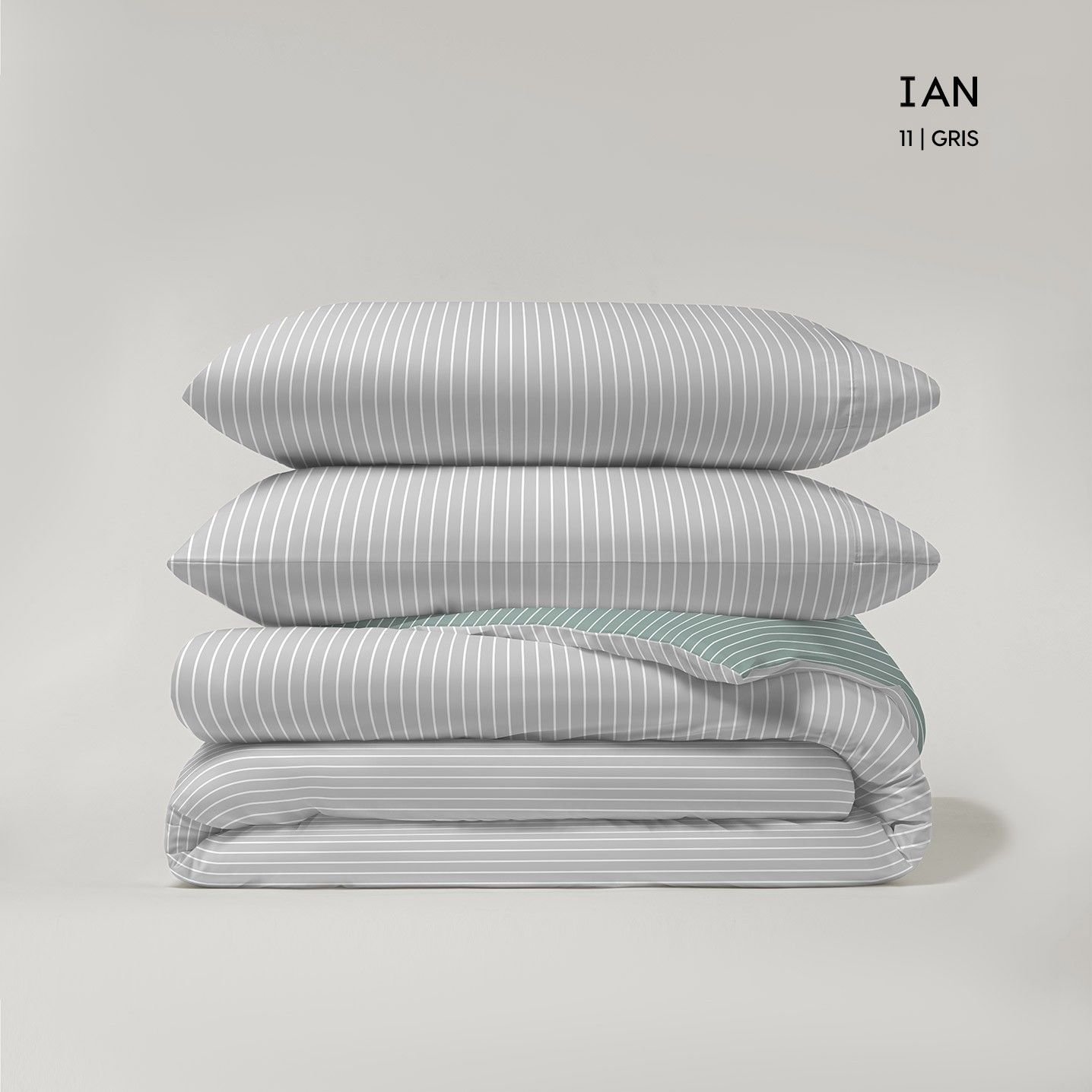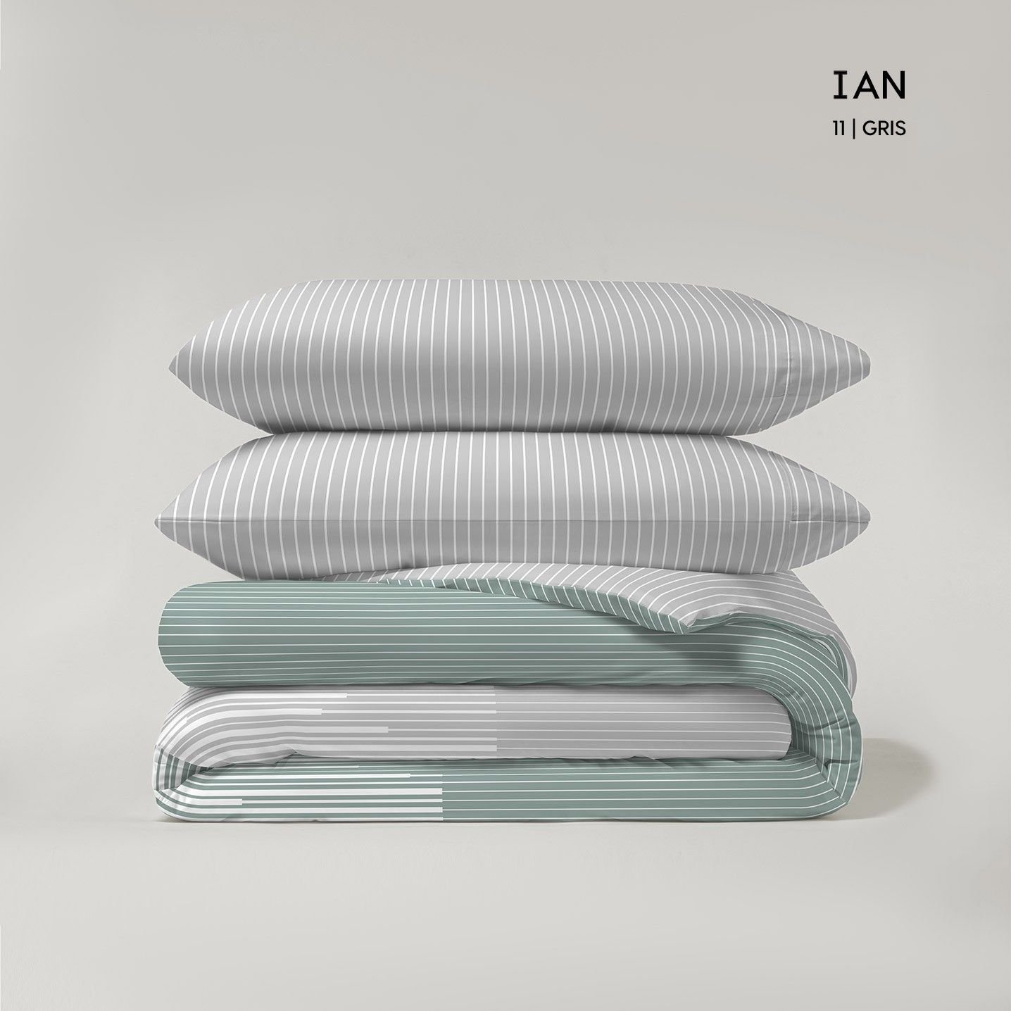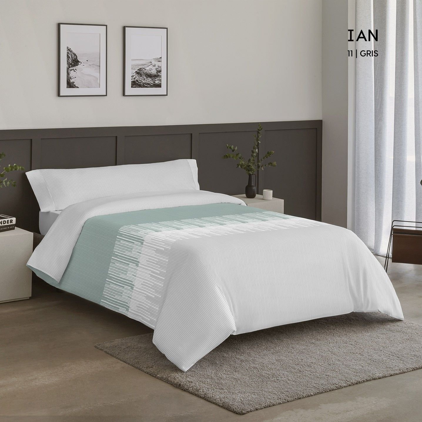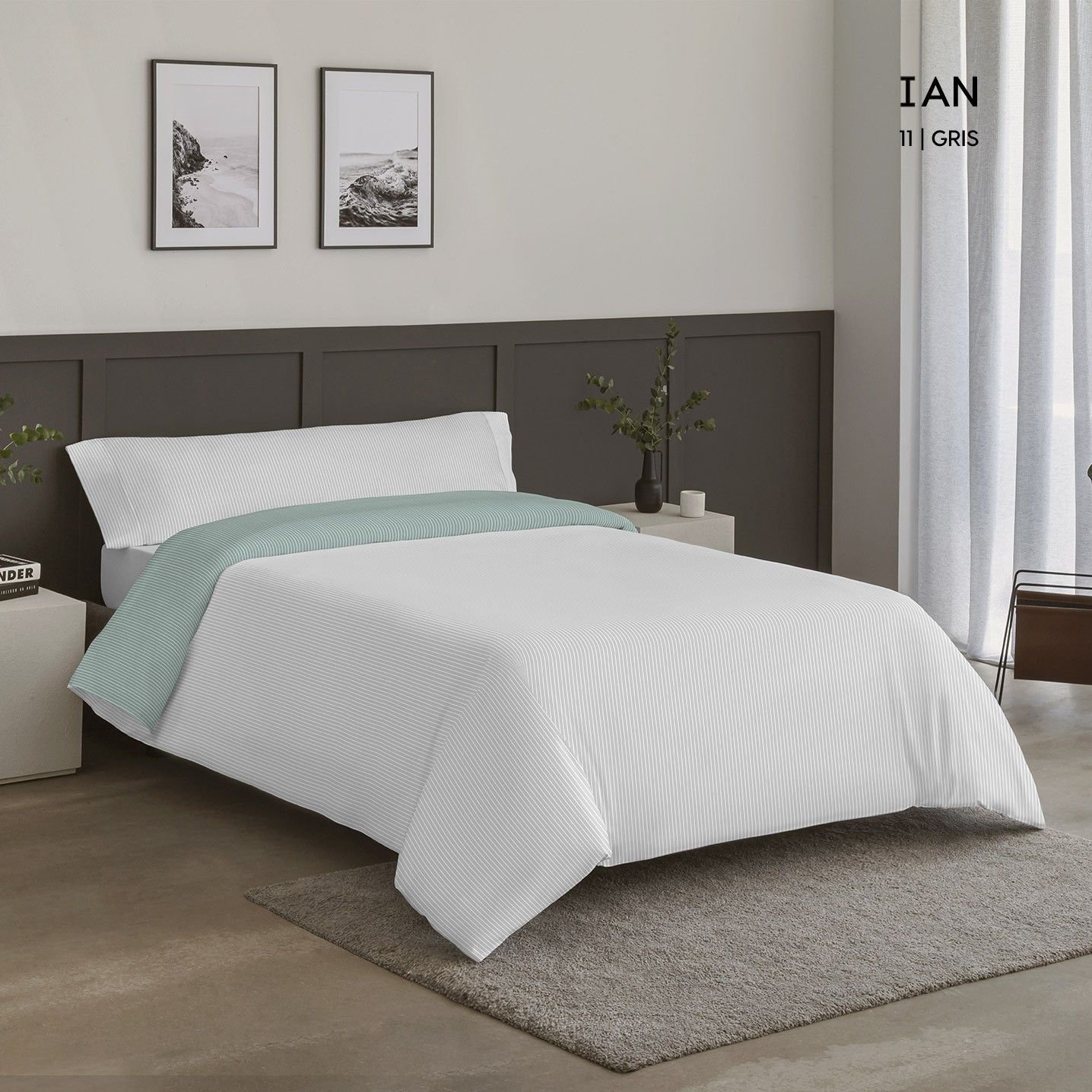 Funda nórdica reversible modelo Ian en tonos mentas, tejido de sábana por ambos lados, la funda va abierta en la parte de los pies para introducir el relleno. El diseño es un lado estampado floral y otro sencillo de línea. con diseño moderno y elegante. Juego completo con bajera ajustable, funda de almohada y saco nórdico. Tejido suave y resistente 50% algodón – 50% poliéster. 132 hilos