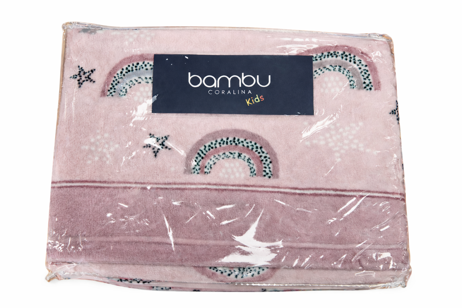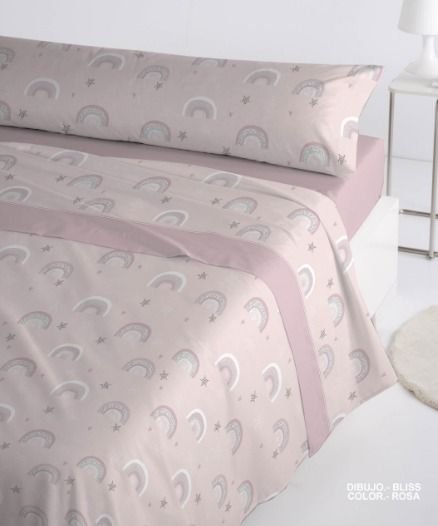 Juego de sábanas de coralina de la firma Bambú Kids, con un diseño sencillo y elegante, con dibujos de arcoíris sobre un fondo claro. Es un modelo sencillo y combinable.
