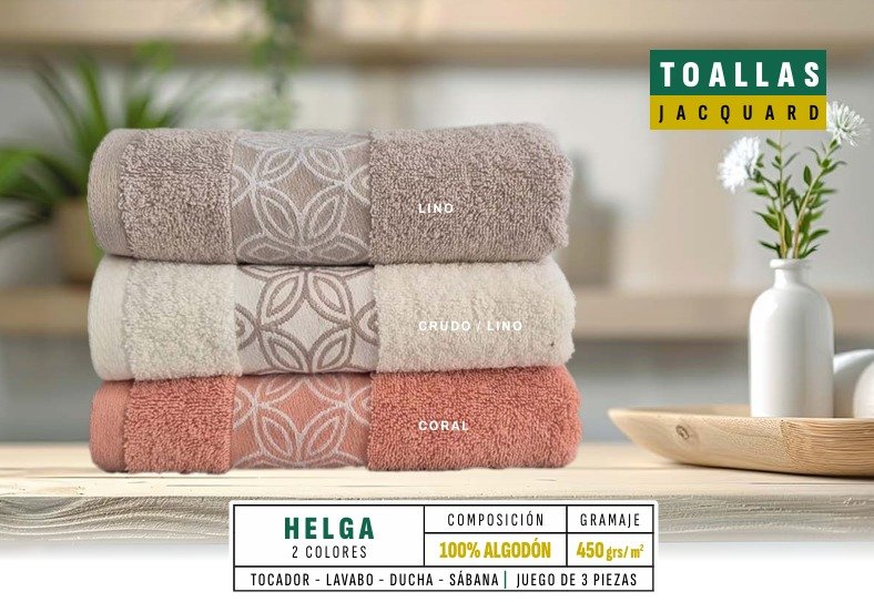 Elegante juego de toallas FIOTEX modelo Helga en color coral, confeccionado con tejido jacquard de alta calidad (450 g/m²) que ofrece gran suavidad, absorción y durabilidad. Ideal para aportar estilo y confort a cualquier baño.