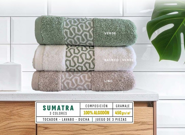 Elegante juego de toallas FIOTEX modelo Sumatra en color blanco, confeccionado con tejido jacquard de alta calidad (450 g/m²) que ofrece gran suavidad, absorción y durabilidad. Ideal para aportar estilo y confort a cualquier baño.
