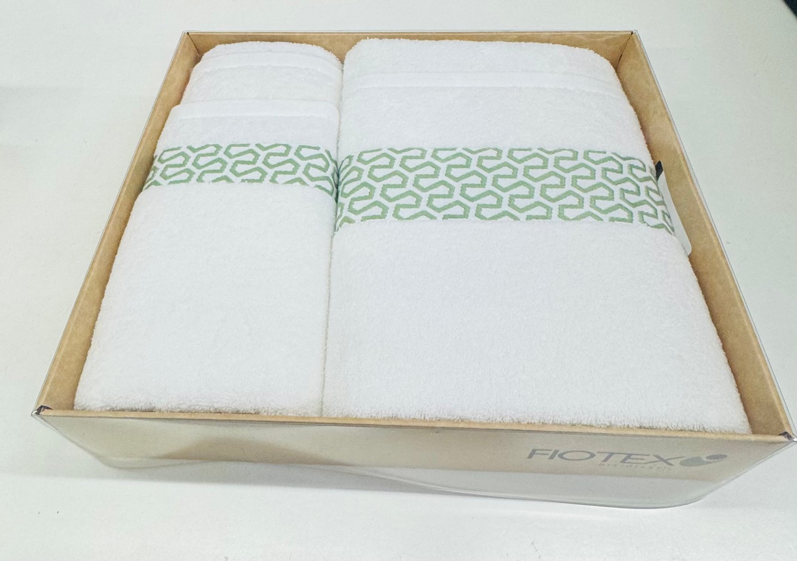 Juego de Toallas FIOTEX Sumatra blanco con greca verde – 3 Piezas