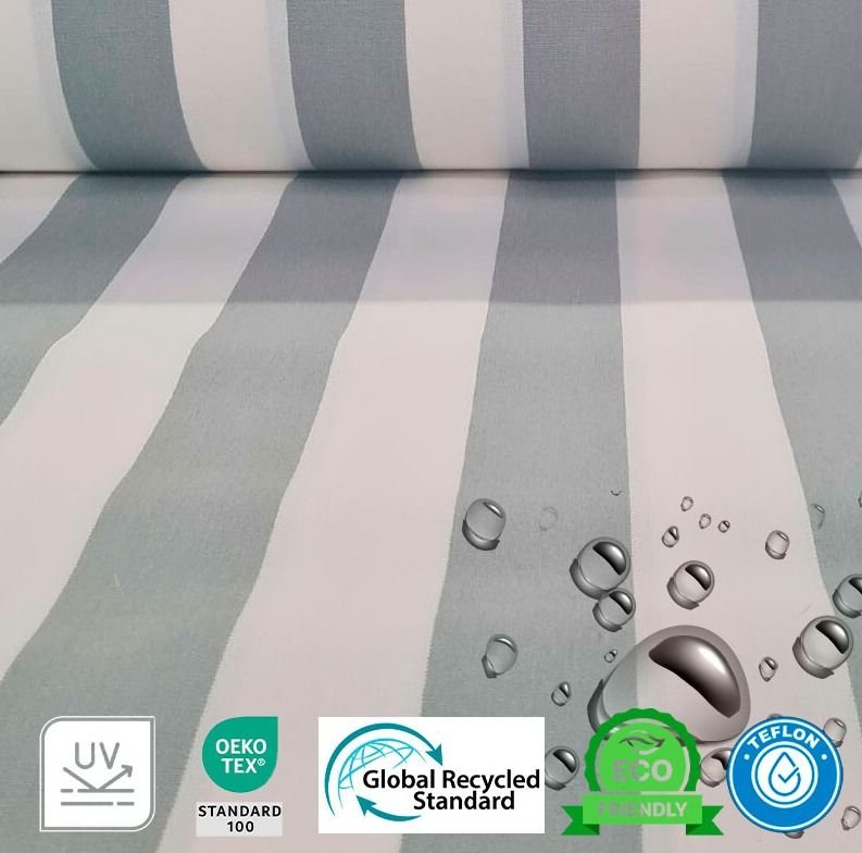 Conoce nuestra lona de toldo de rayas en color gris claro y blanco natural. Toldo con un ancho de 3.20 metros siendo un tejido de cierto grosor, con un tacto poroso, fabricado poliéster reciclado. Este toldo de rayas se caracteriza por la gran variedad de usos que podemos realizar con él, desde tapizados hasta sombras para exteriores. Gracias a su tonalidades oscuras esta lona de toldo absorbe gran cantidad de luz para tener una sombra de gran calidad en tus espacios exteriores.
