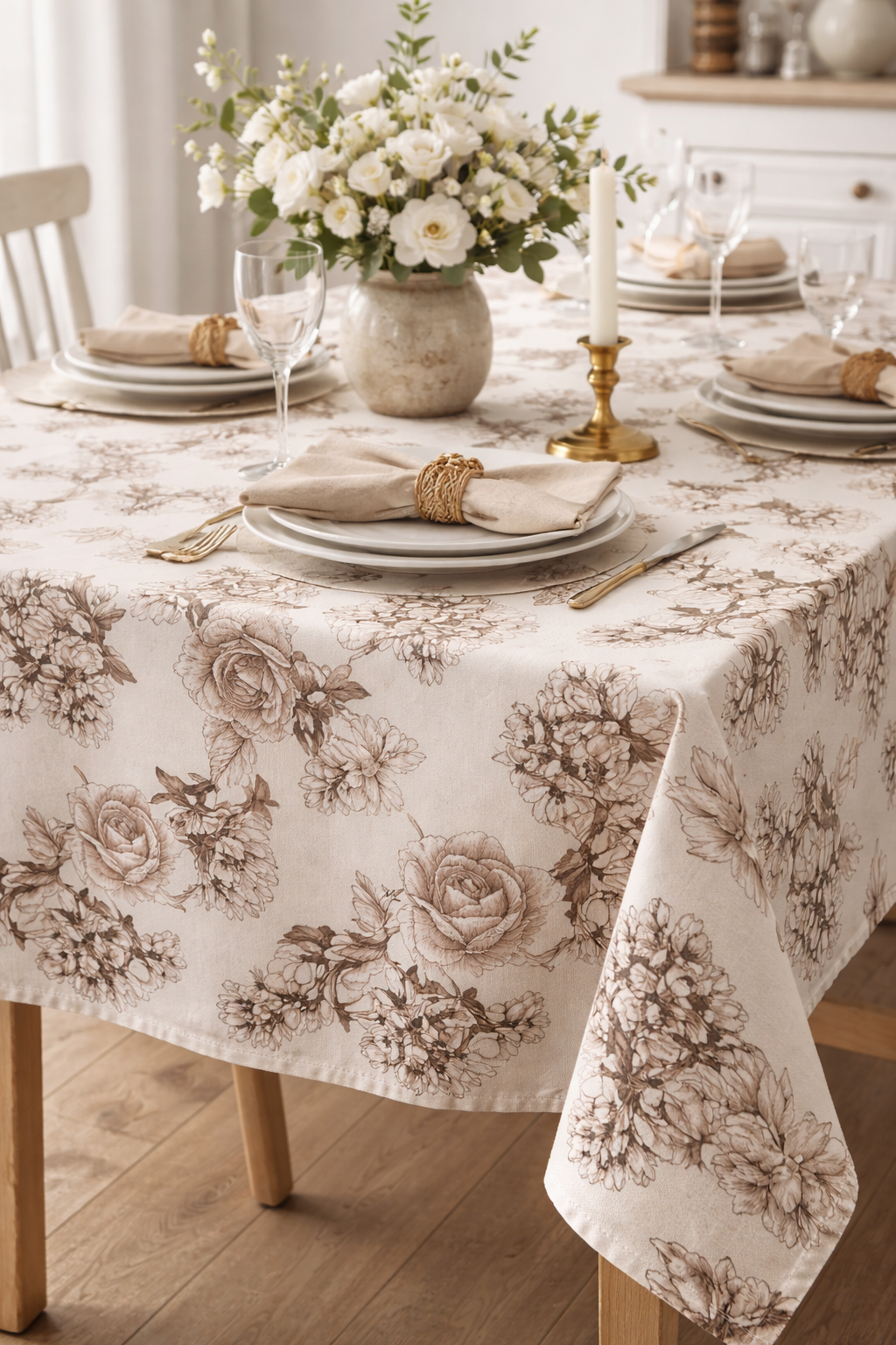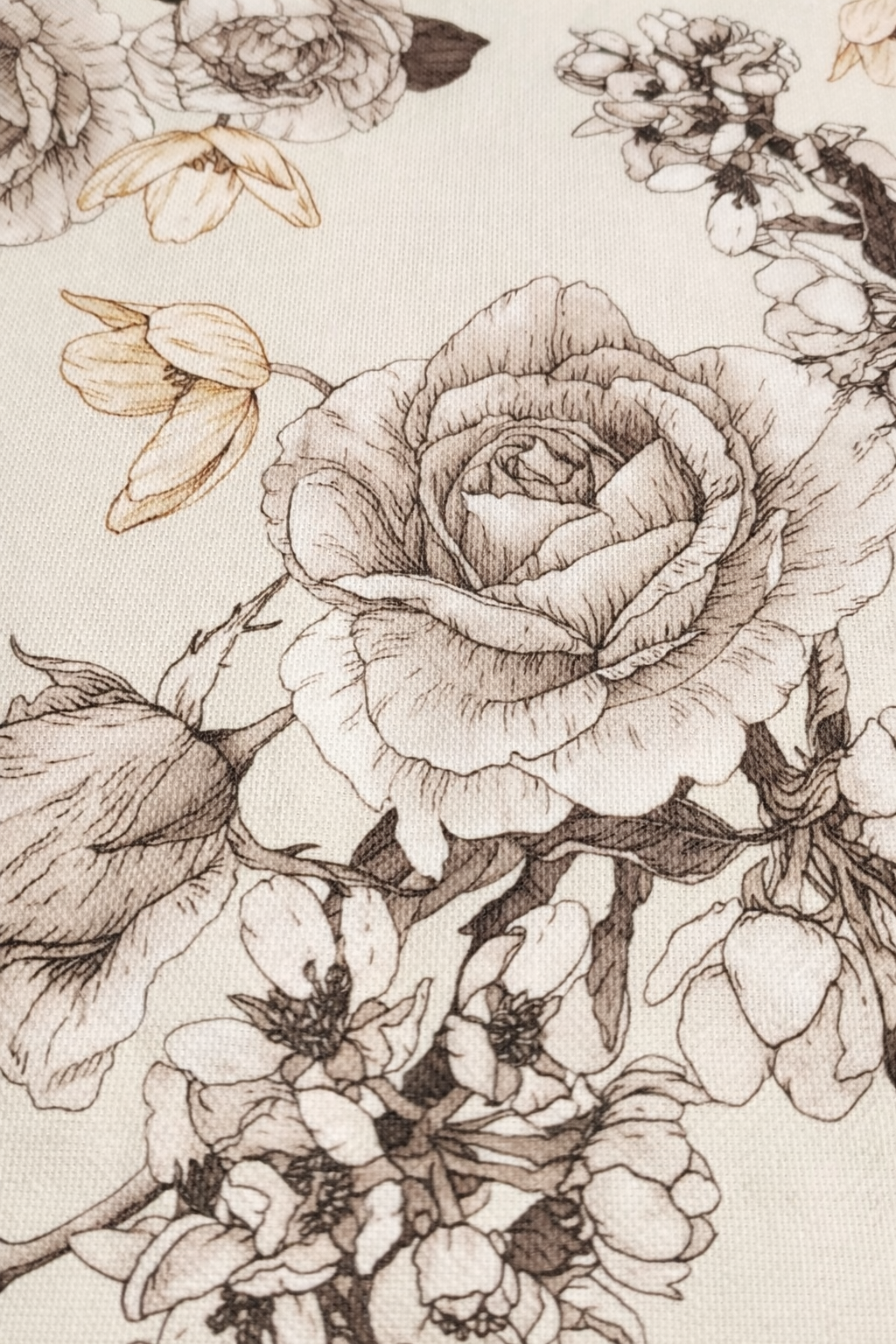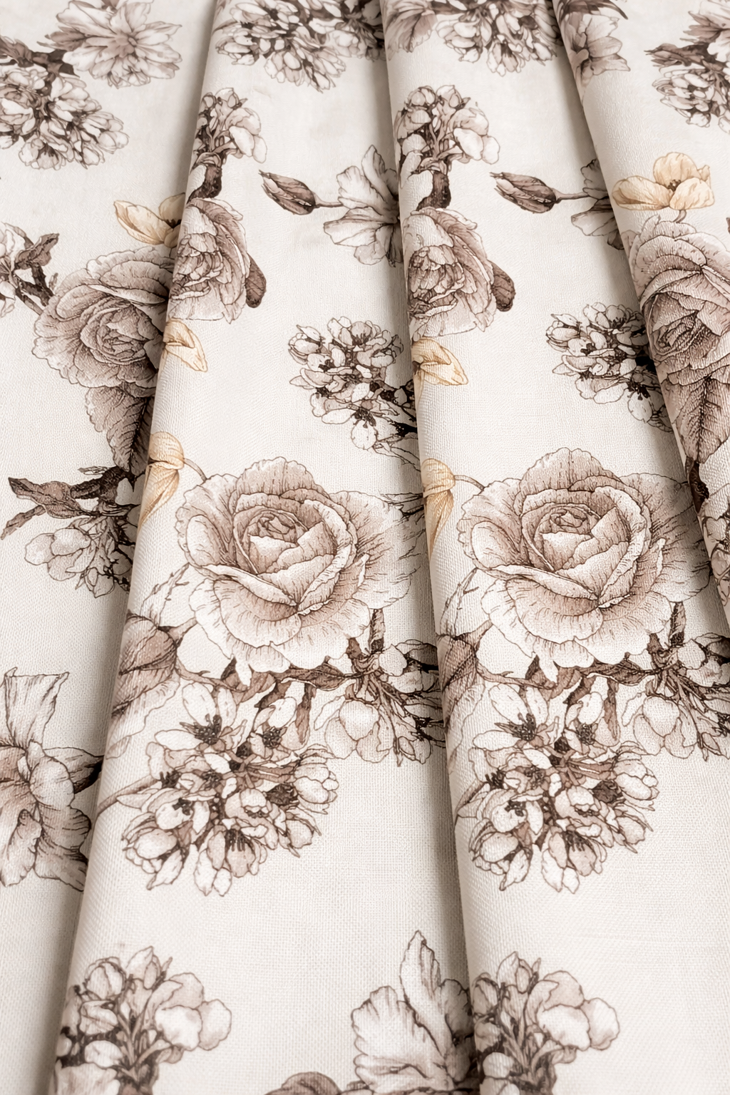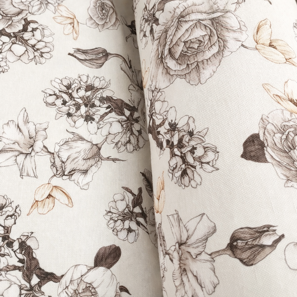 Tejido decorativo con delicado estampado floral en tonos neutros, ideal para confección y proyectos de hogar. Su composición equilibrada de 50% algodón y 50% poliéster aporta suavidad al tacto, buena resistencia y fácil mantenimiento.