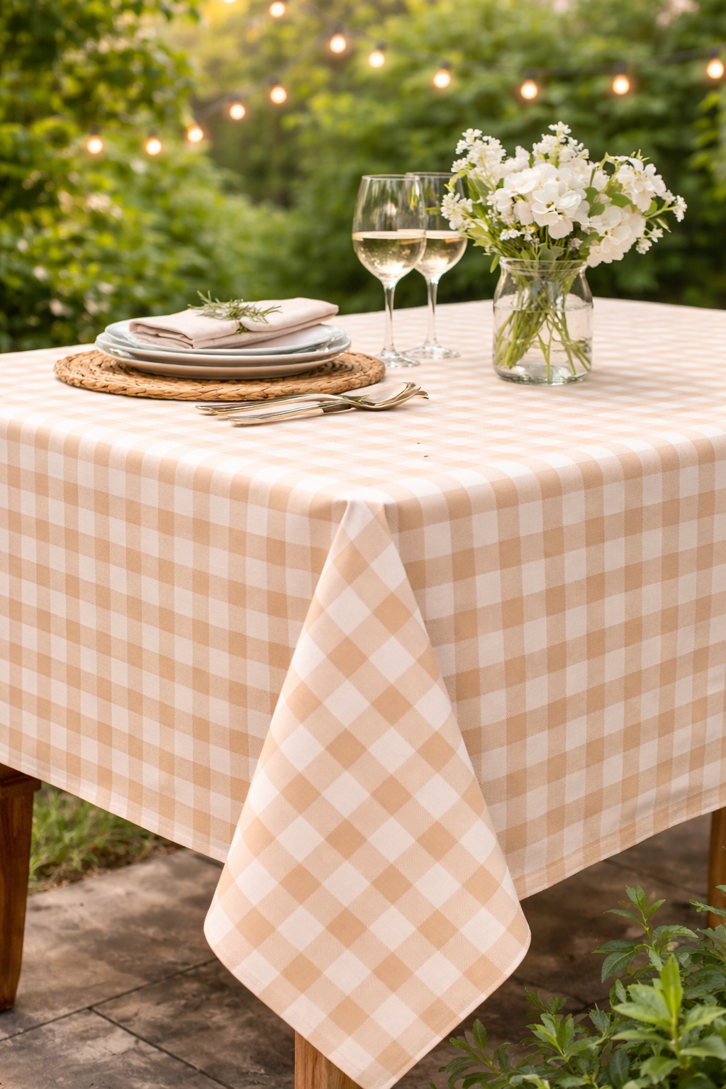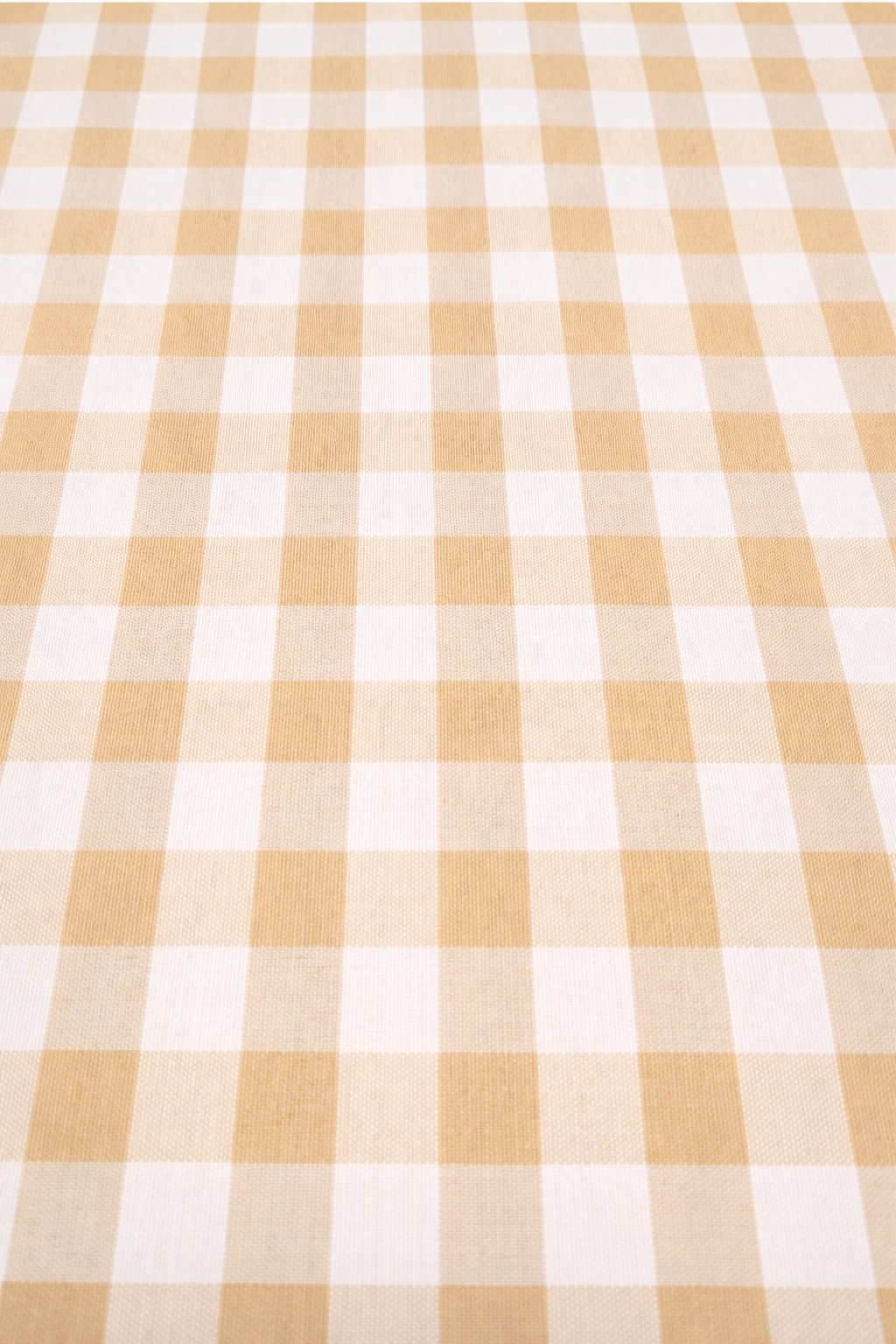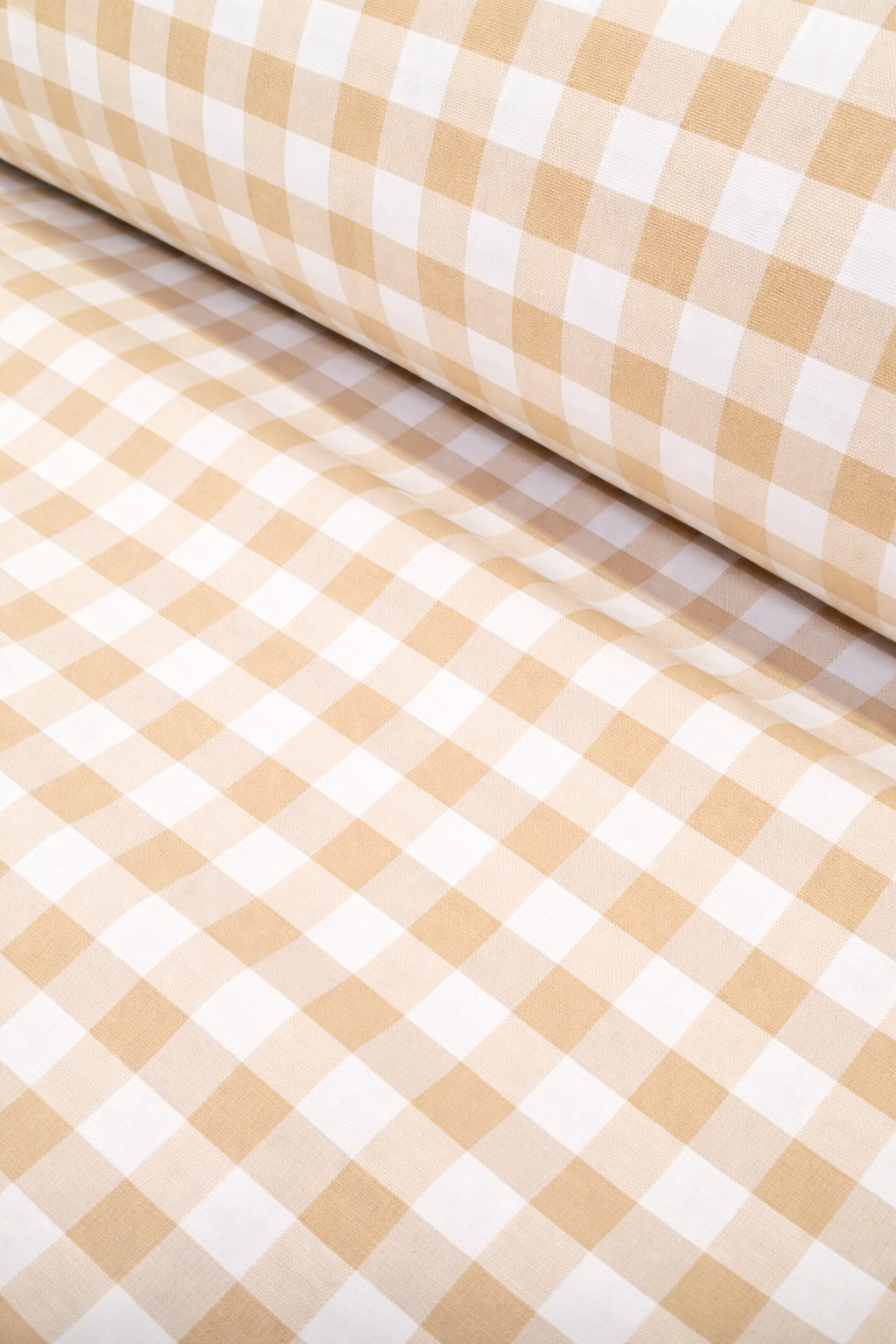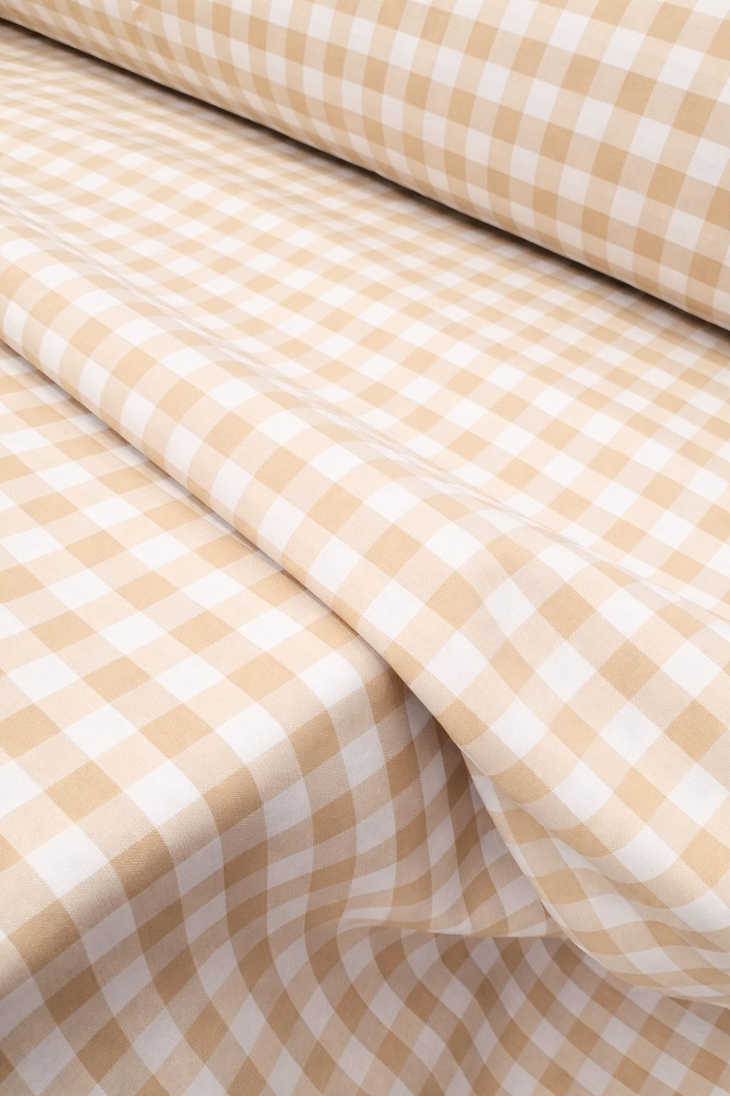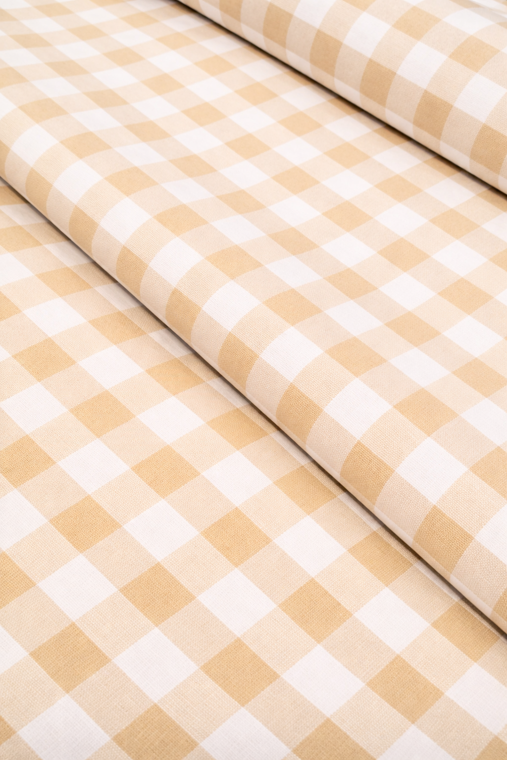 Tela de loneta Gamonal cuadros Vichy beige de 15 milímetros. El cuadro Vichy es una tela sostenida y fina, ideal para batas de colegios, bolsa para el pan y manteles. El cuadro de Vichy se utiliza para manualidades, decoración y labores.