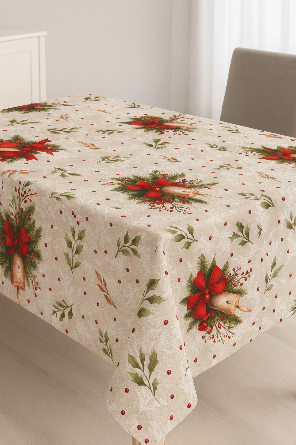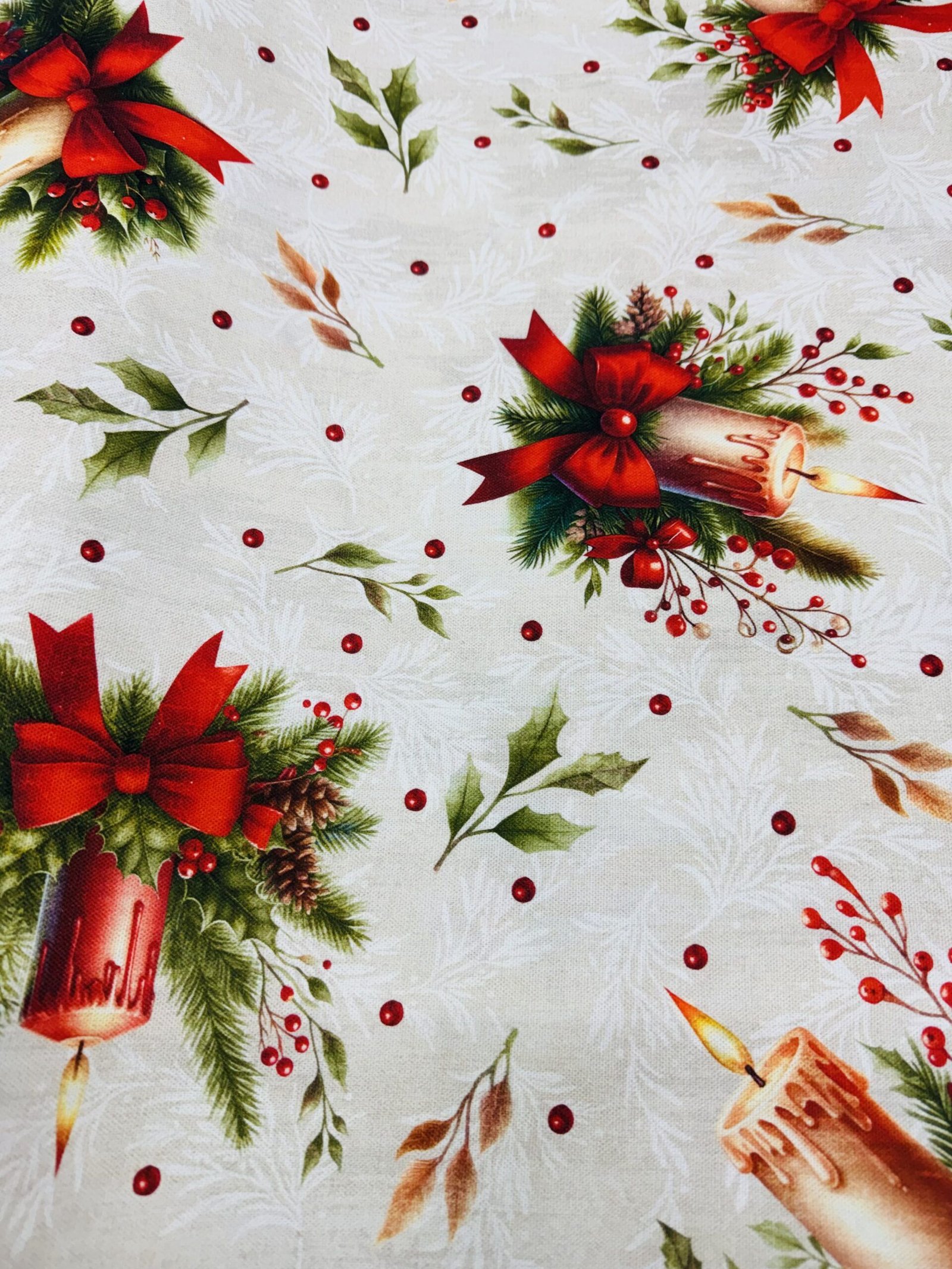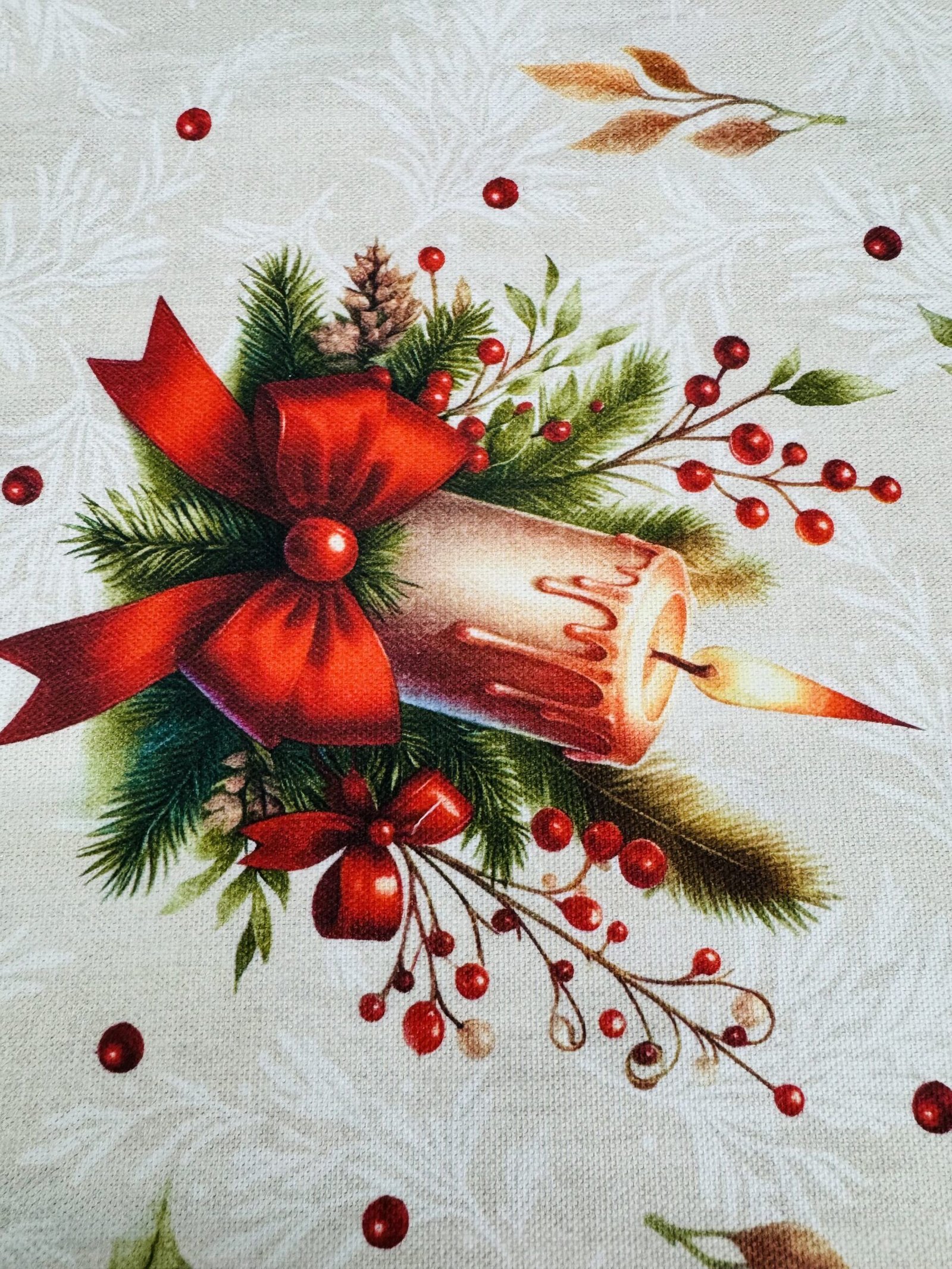 Crea un ambiente elegante y festivo con esta loneta estampada digitalmente en tonos rojos, beige, verdes y tostados.