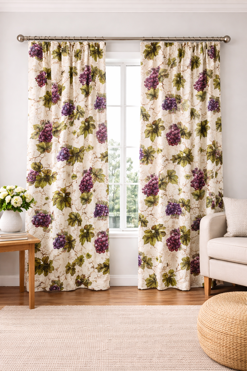 La loneta para cortina modelo Pompelina C/168 es una tela decorativa con un delicado estampado botánico compuesto por hojas, flores y frutos en tonos verdes, malvas y rosados sobre fondo claro. Su diseño natural aporta frescura y elegancia a cualquier espacio.