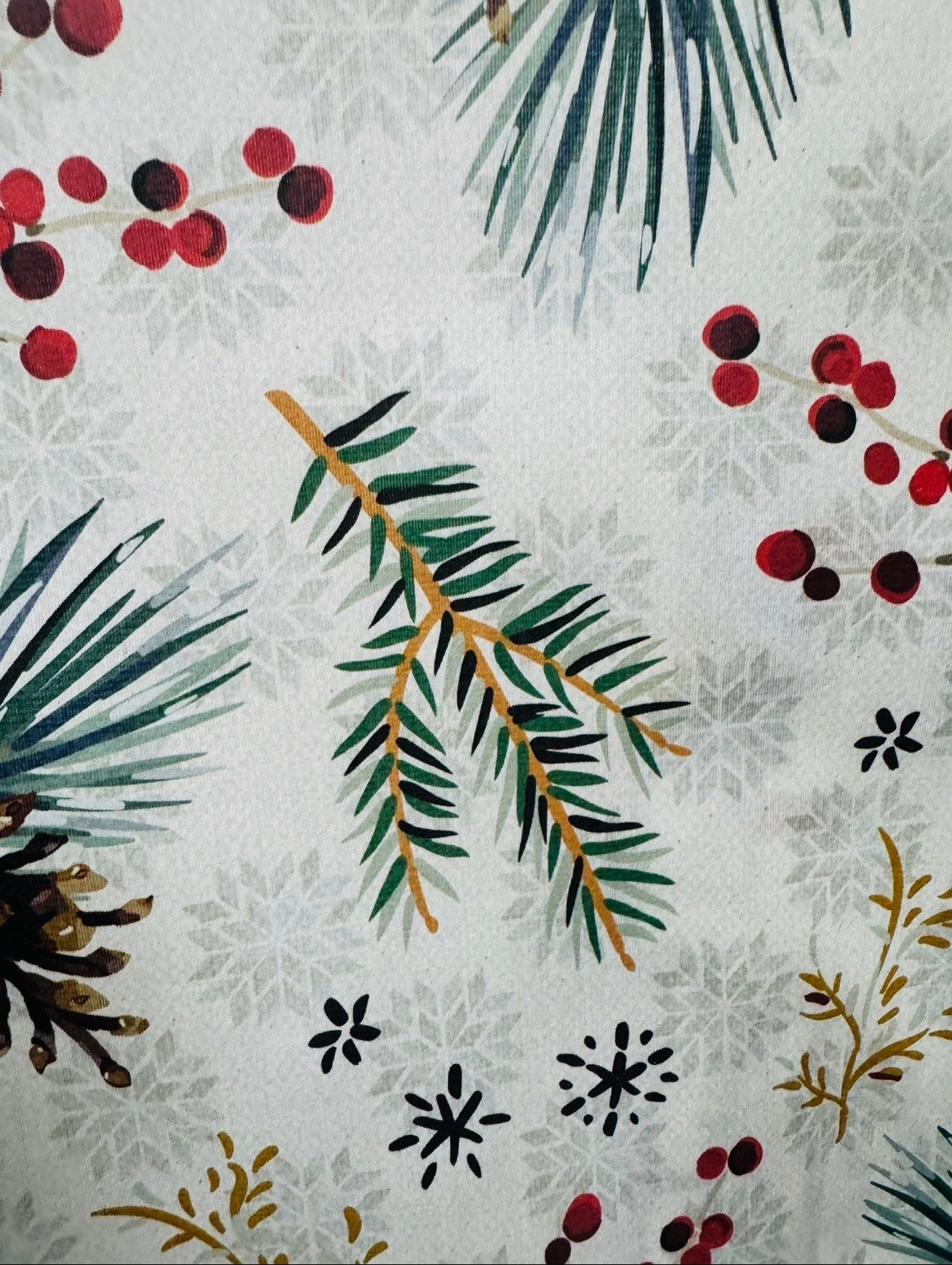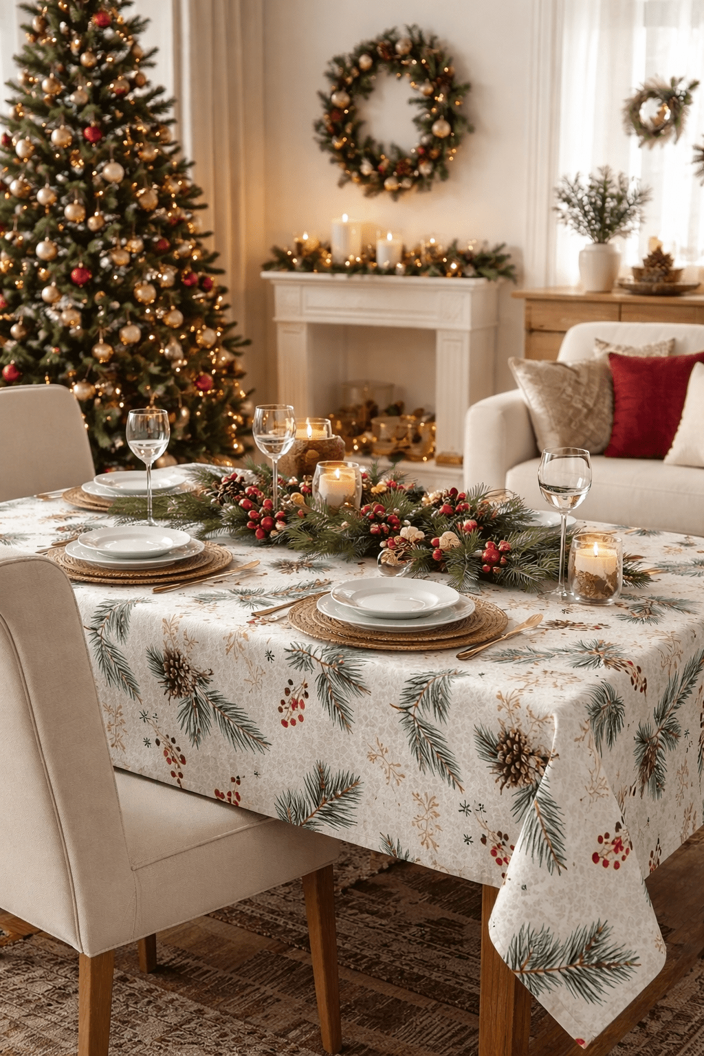 Crea un ambiente elegante y festivo con este mantel resinado en motivos navideños en tonos verde, rojo, y beige.