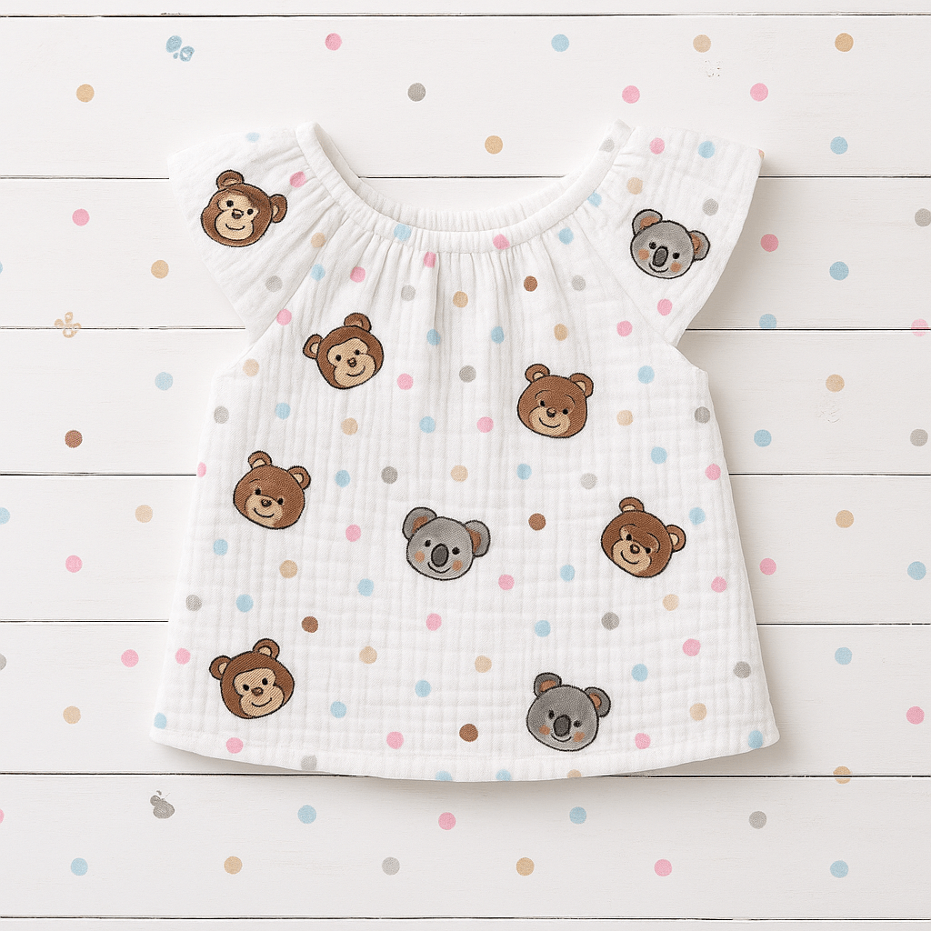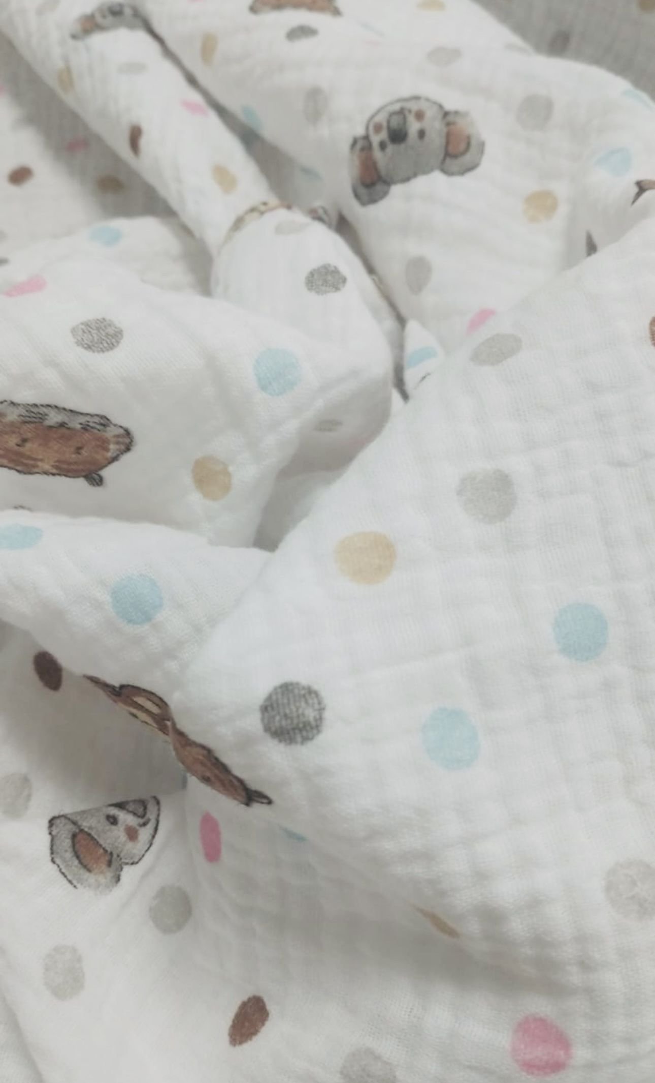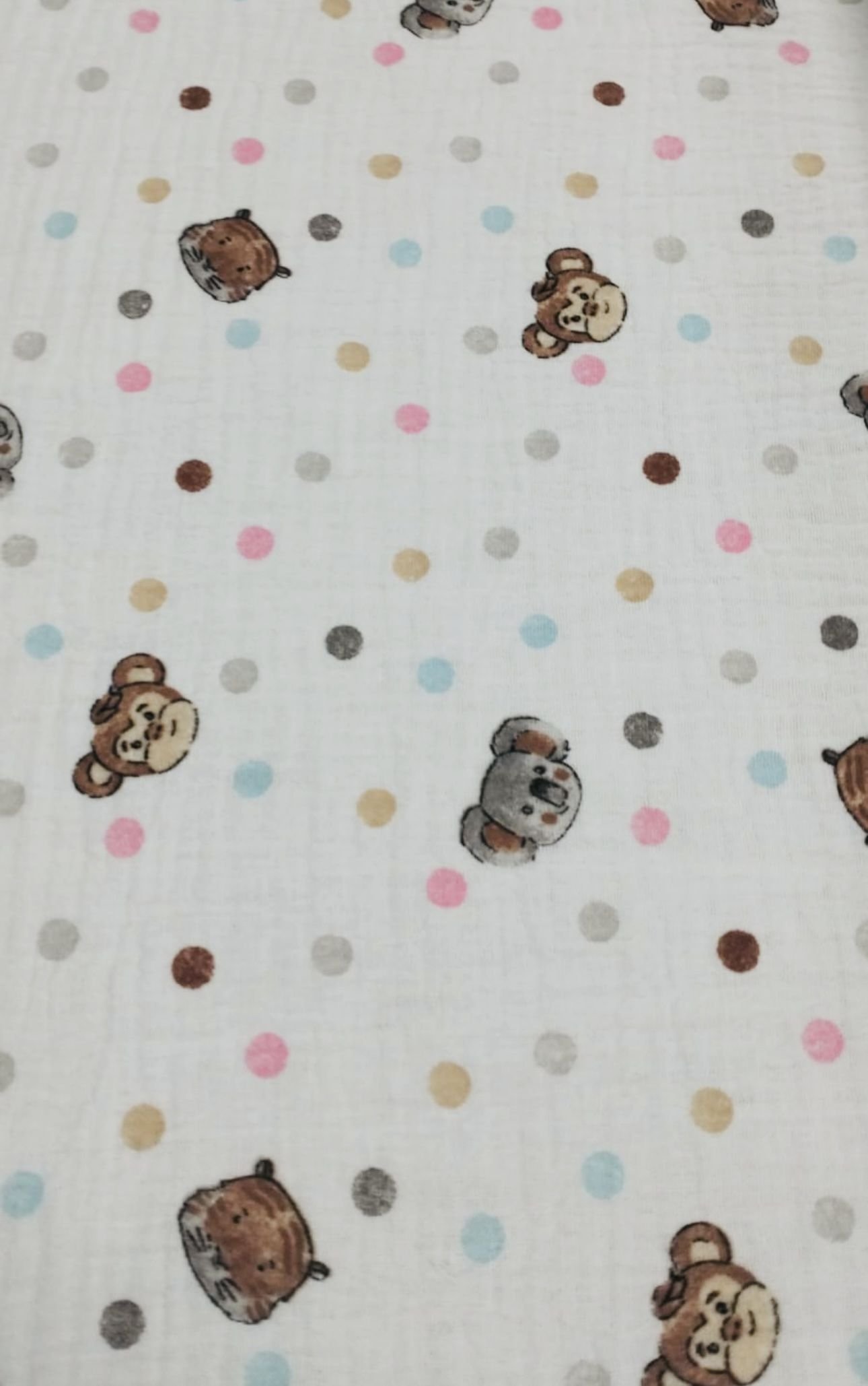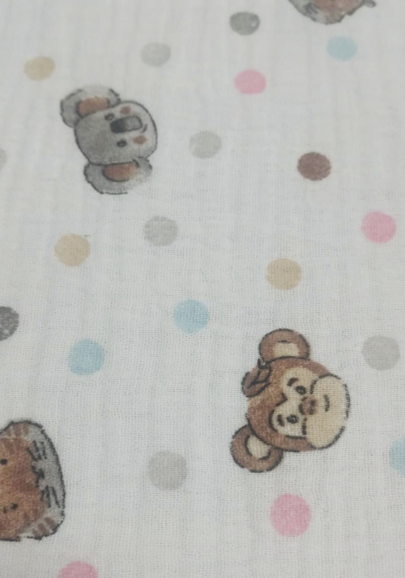 Esta maravillosa muselina estampada con animales en colores pasteles muy alegre, es muy suave y ligera.