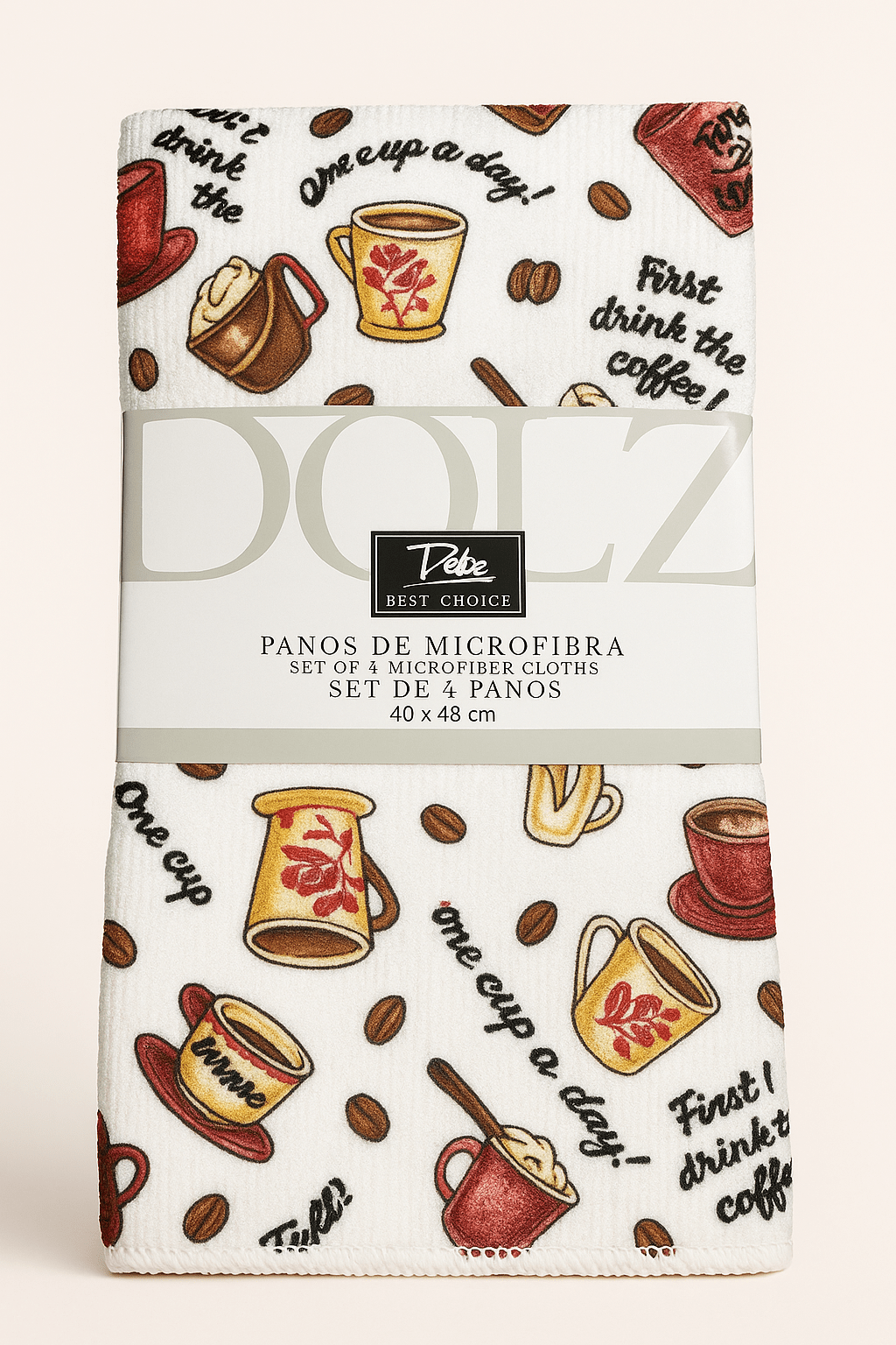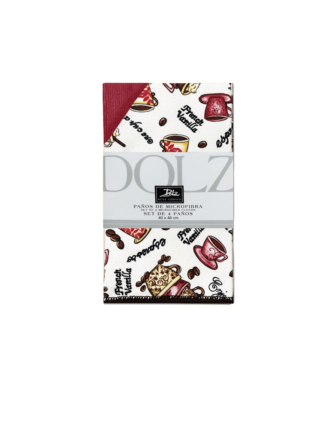 Pack de 4 unidades compuesto por 2 paños con estampado de café y 2 paños de color granate.