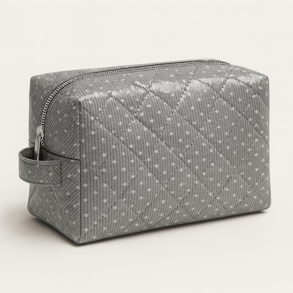 Tela de piqué plastificado con lunares blancos en fondo en color gris. Este piqué plastificado es acolchado está compuesto por tela de piqué canutillo plastificado, tela de boata y forro de algodón. Es una tela con cuerpo y perfecta para confeccionar prendas y complementos de bebé. Confección de complementos y accesorios: neceseres, bolsas…