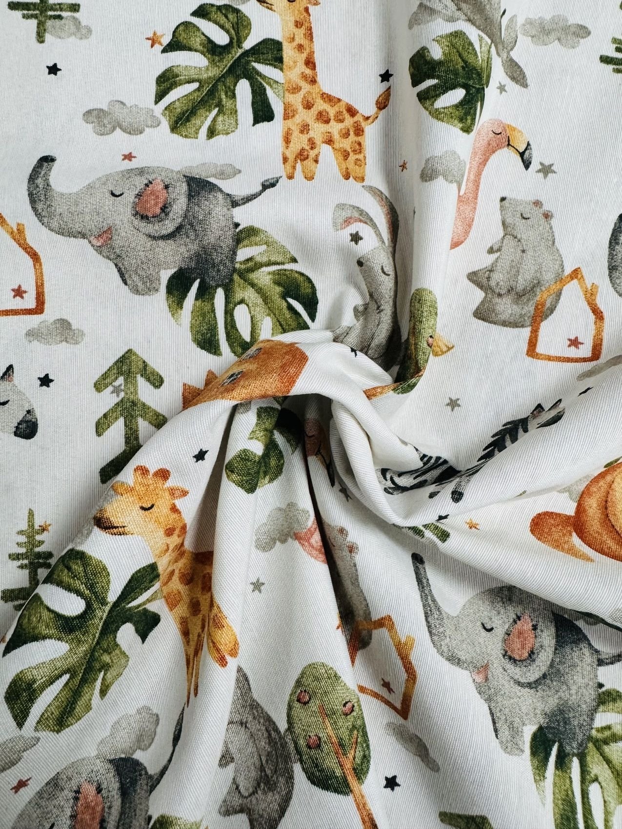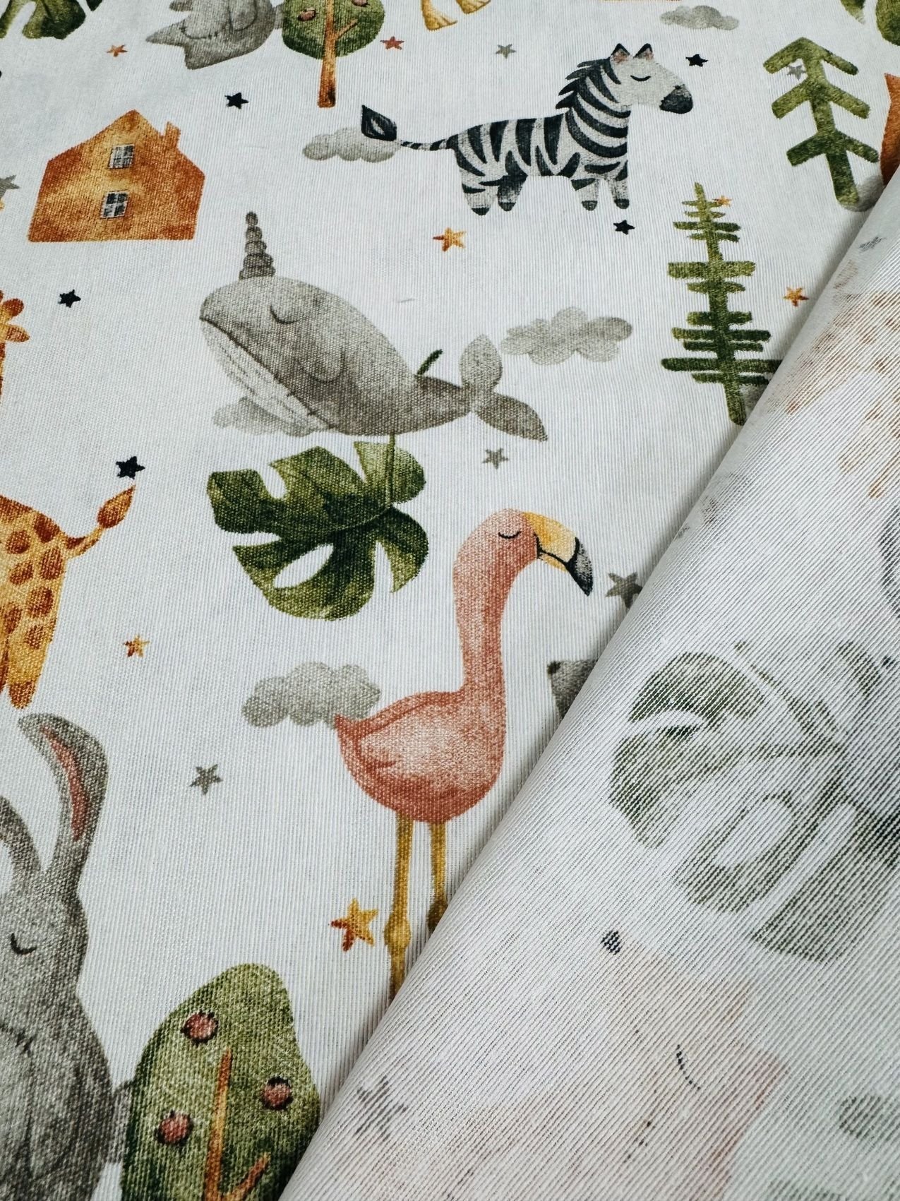 Tela de loneta estampada de animales de colores muy alegres sobre fondo claro para decoración.