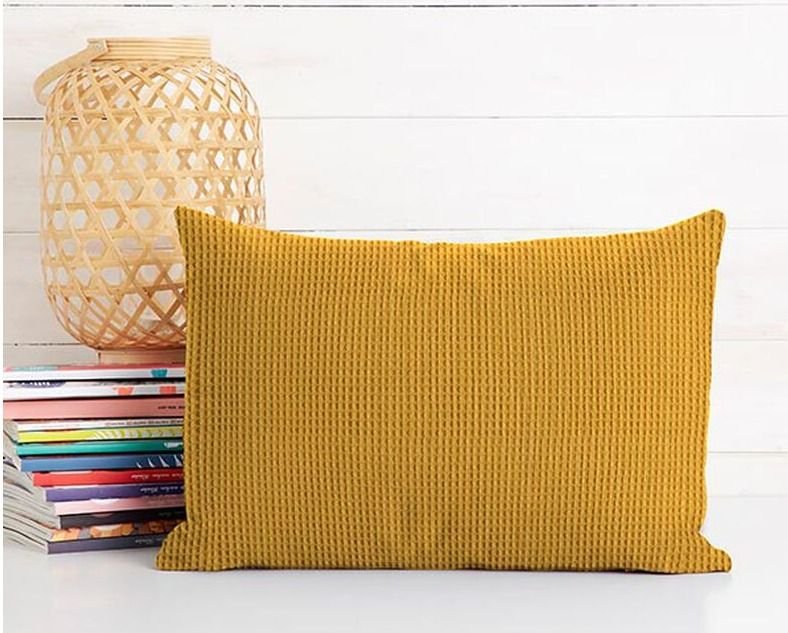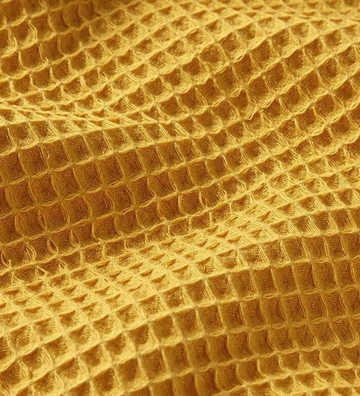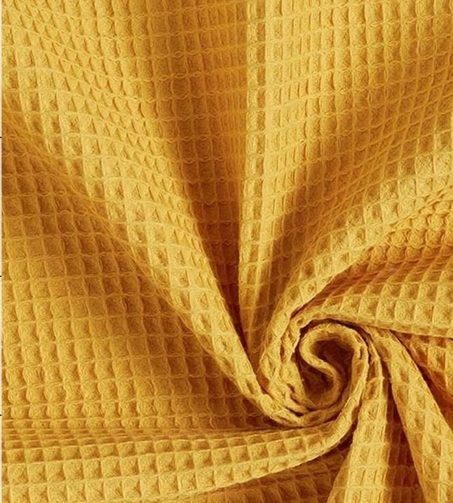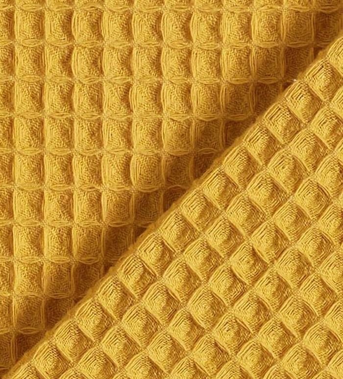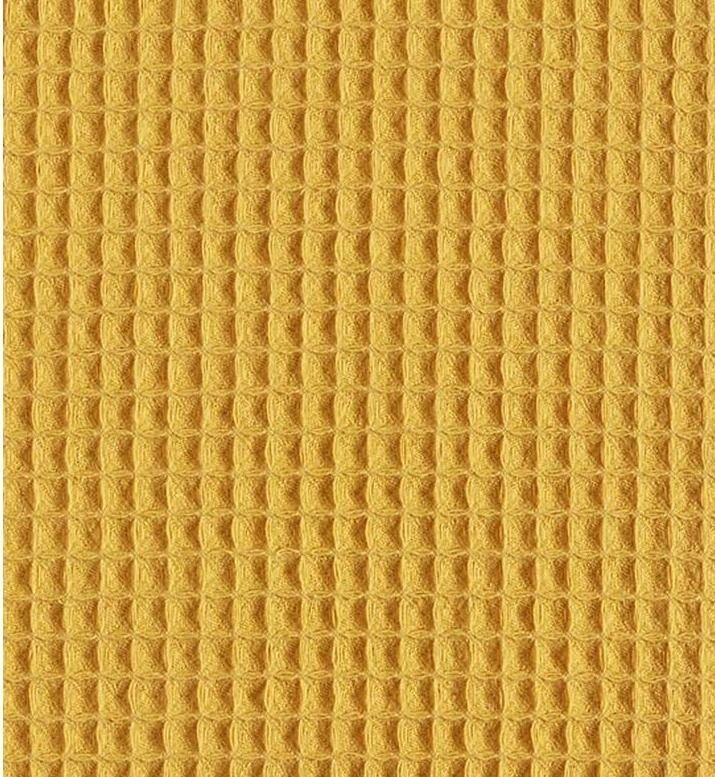 Tela piqué Waflle o Gofre con el cuadro grande para toallas color amarillo oro o cúrcuma. Tela también conocida como toalla piqué, por los cuadraditos en relieve que componen el tejido. Tiene el cuerpo y peso ideal para colchas de verano, arrullos y complementos para bebé. Perfecta para confección de albornoces. Tela muy dulce debido a su composición de algodón, pudiéndose utilizar como saco de carritos para bebe y colcha de verano.