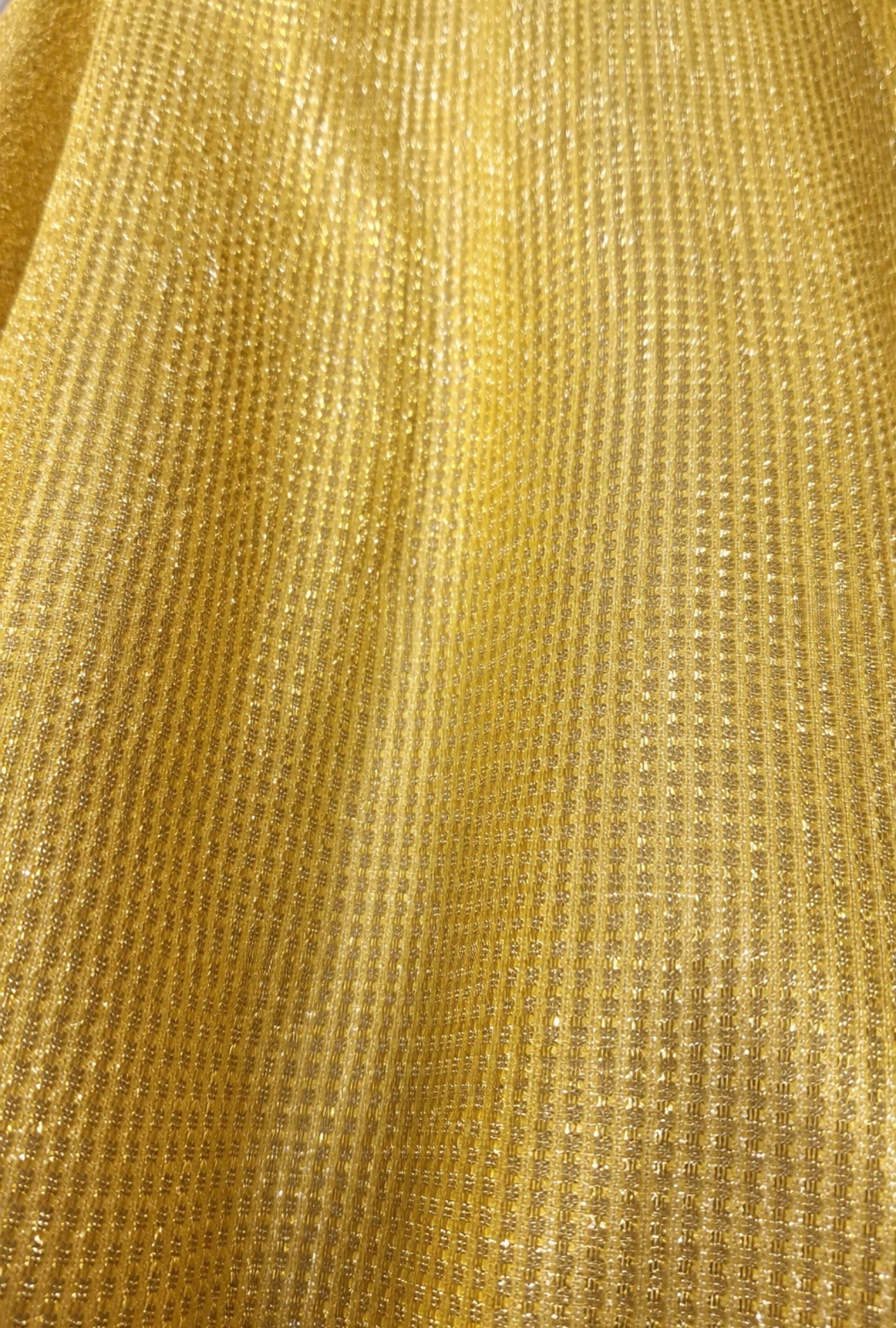 El Tejido Janeiro es un punto elástico con hilo metalizado que destaca por su espectacular brillo y su textura de malla fina y regular. Su acabado luminoso aporta un efecto elegante y sofisticado, ideal para prendas y creaciones que buscan llamar la atención.