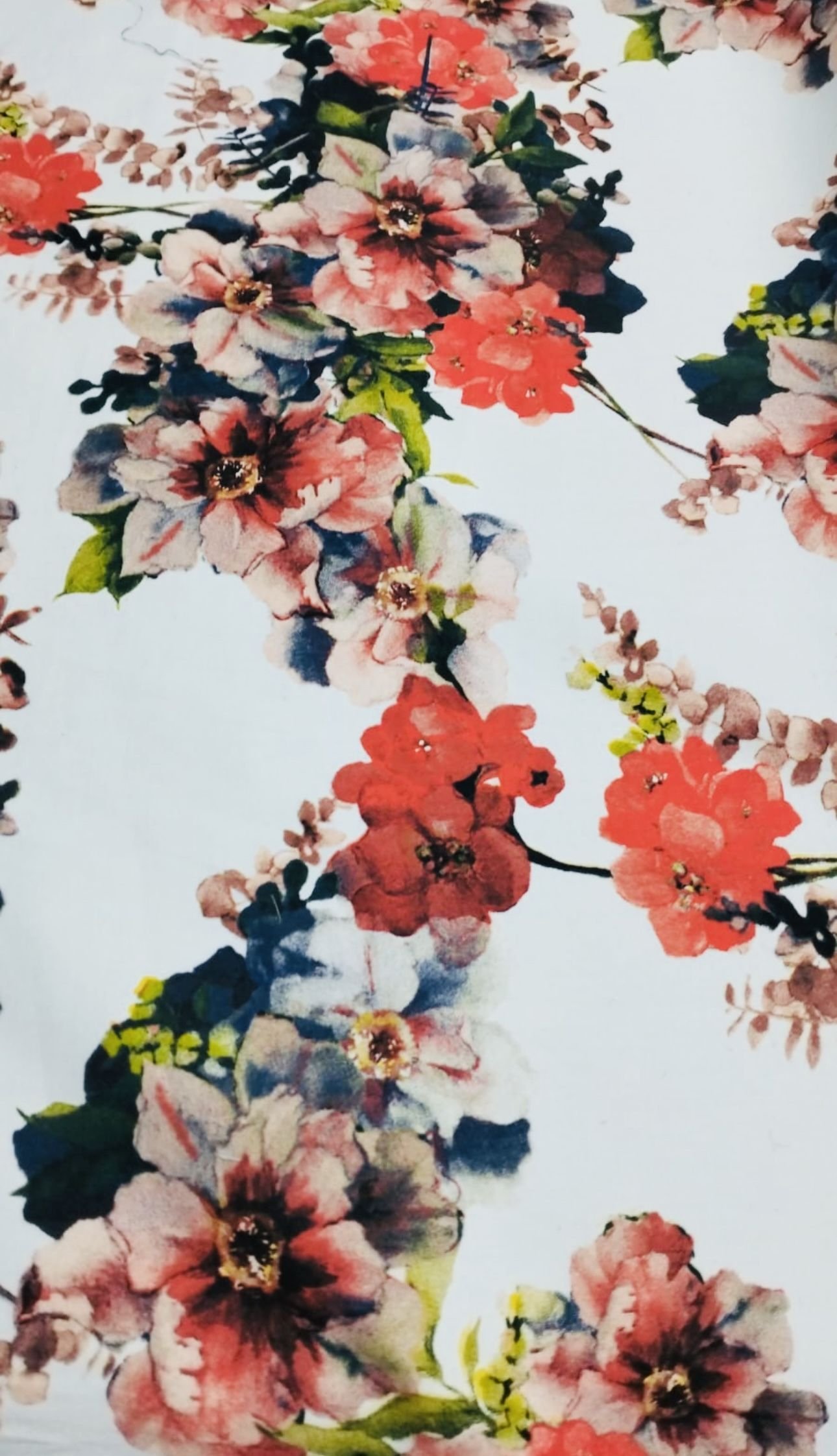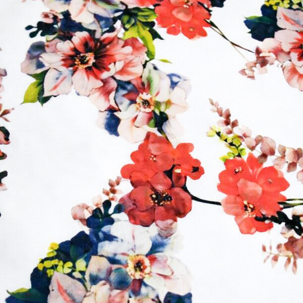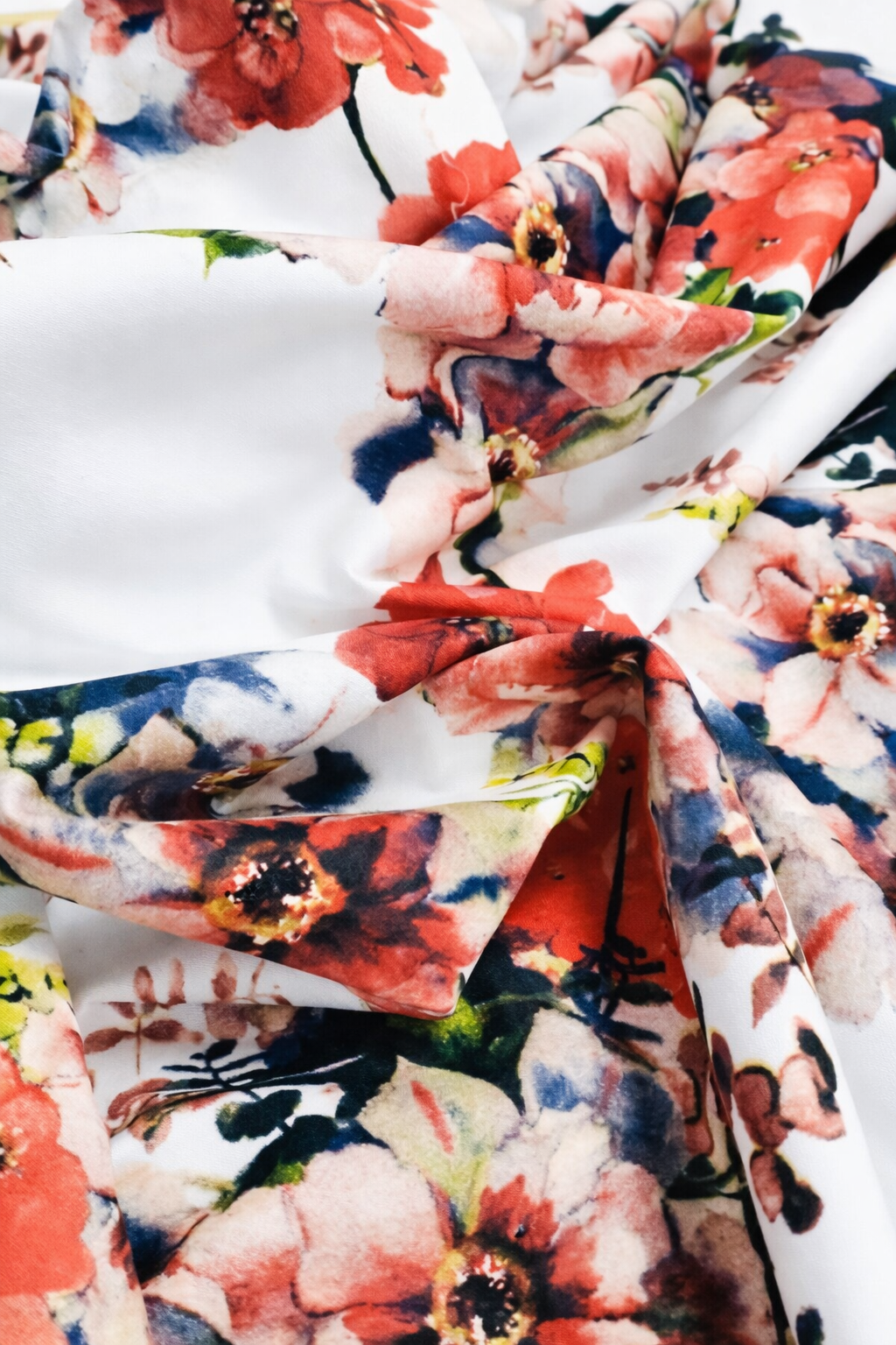 Esta tela de satén con Elastano con un estampado floral muy alegre y elegante impresiona con su delicada caída, su ligereza y su finura, es muy fluida con mucha caída y de tacto muy suave.
