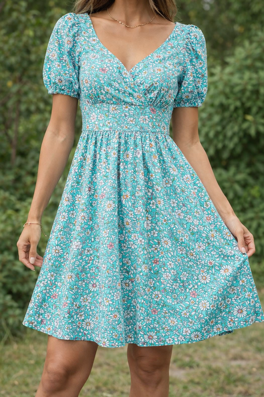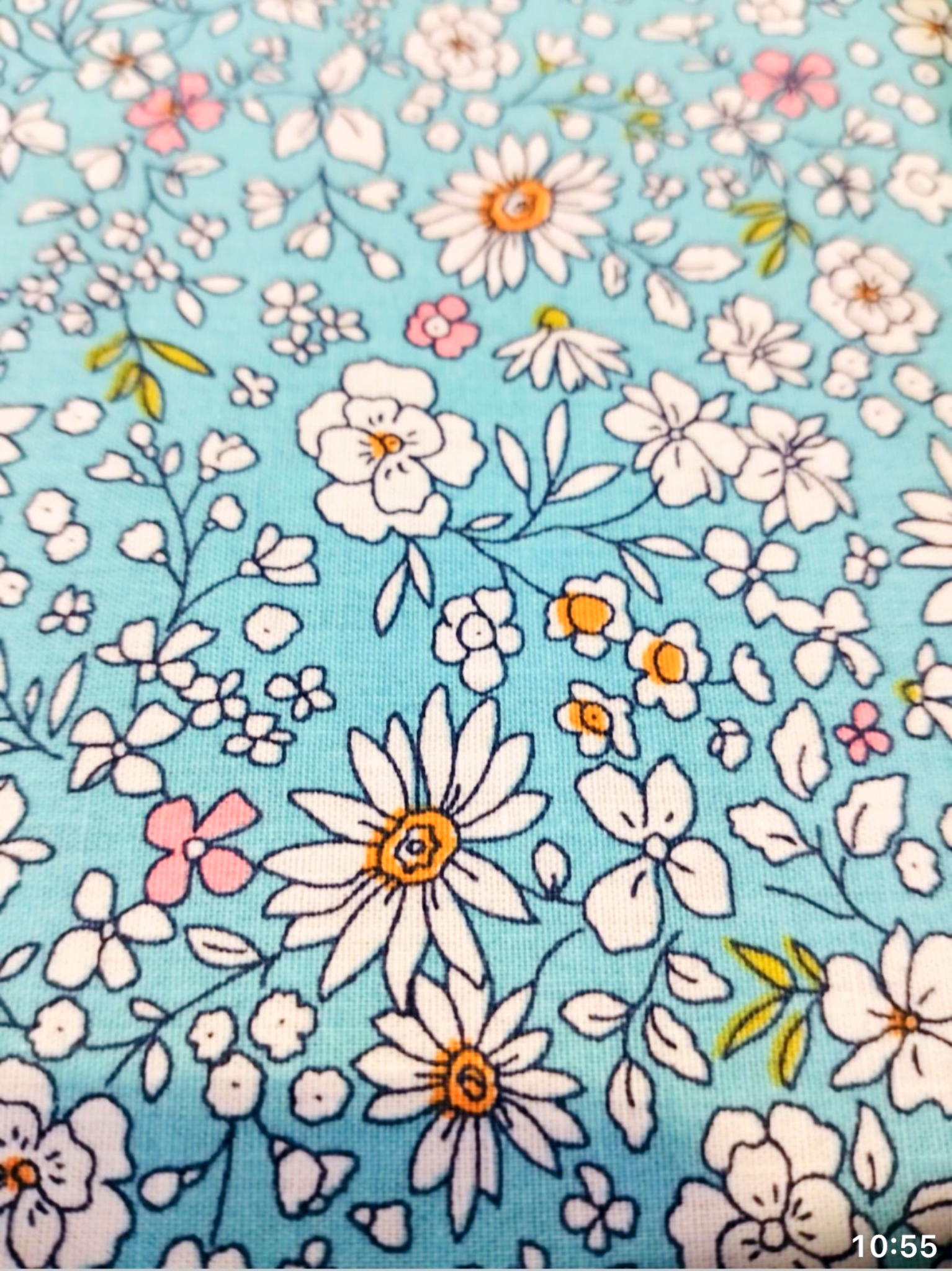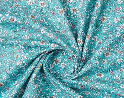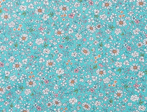 Tejido de 100% algodón con un delicado estampado de pequeñas flores tipo ditsy sobre fondo aqua oscuro, ideal para confecciones frescas y llenas de estilo.
