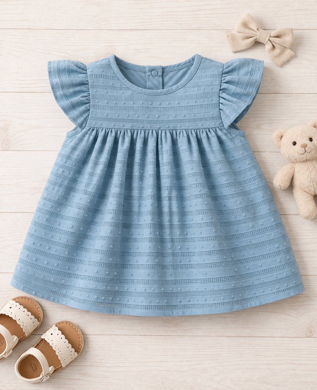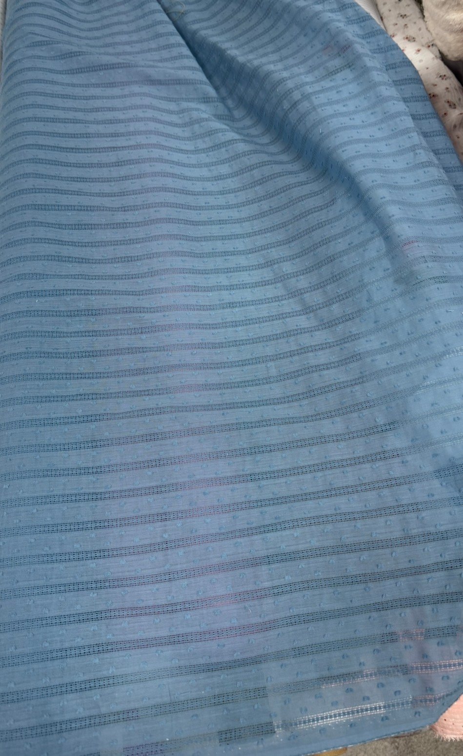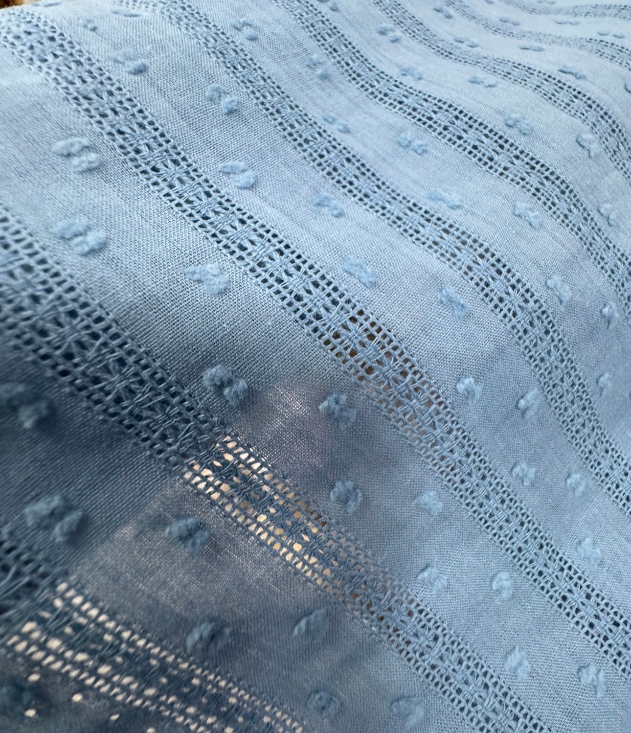 Tejido plumeti de alta calidad en color azul, confeccionado en 100% algodón, que combina delicadeza y naturalidad. Su diseño incorpora pequeños relieves característicos del plumeti junto con elegantes rayas de vainica, aportando textura y un acabado sofisticado.