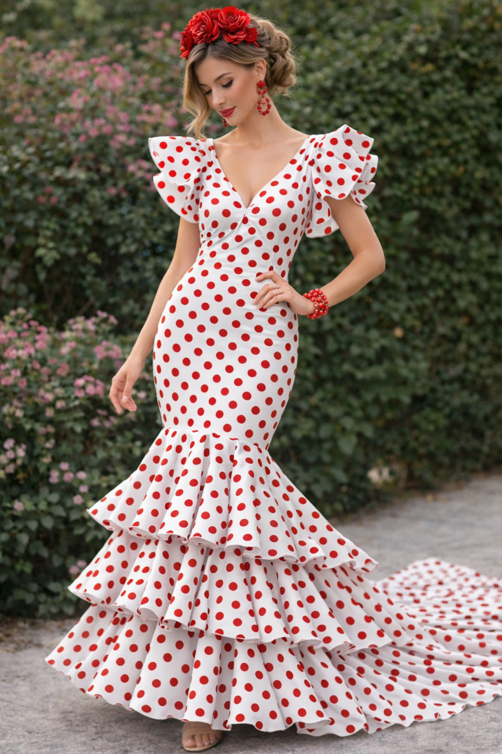 Tela flamenca Candela blanca y lunares rojos para trajes de muy buena calidad y fácil confección. Es una tela con mucho vuelo y caída, textura rugosa.