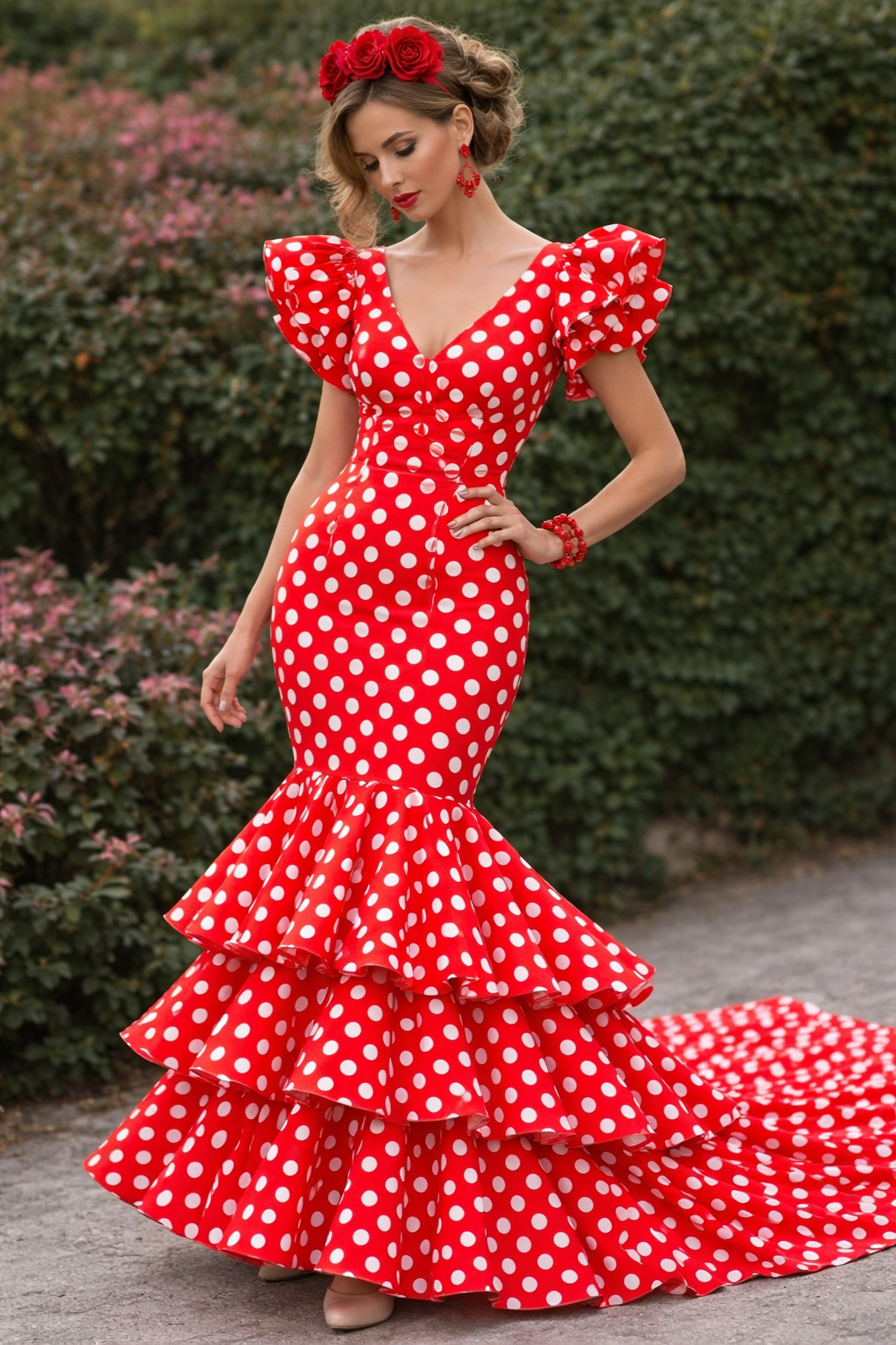Tela flamenca Candela roja y lunares blancos  para trajes de muy buena calidad y fácil confección. Es una tela con mucho vuelo y caída, textura rugosa.