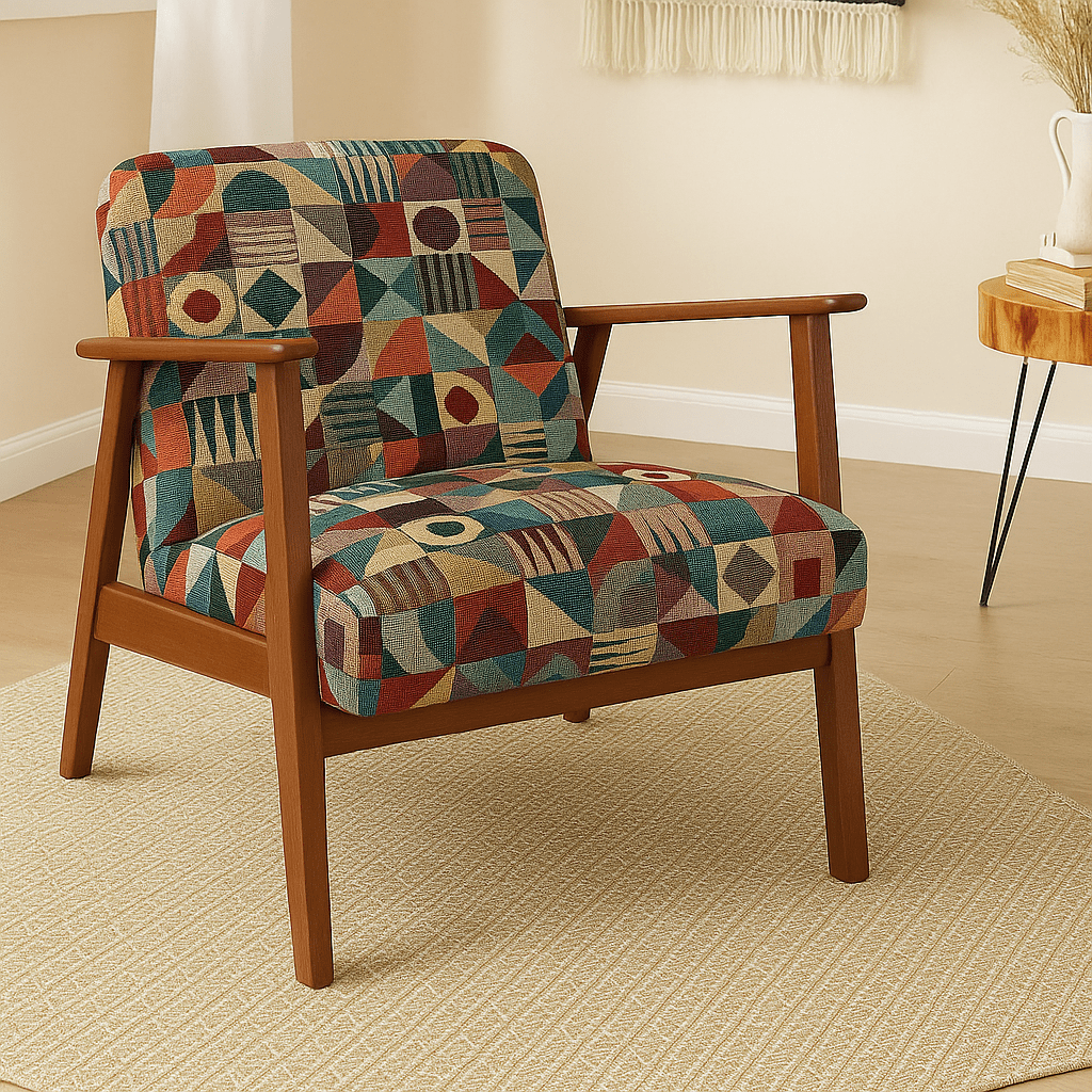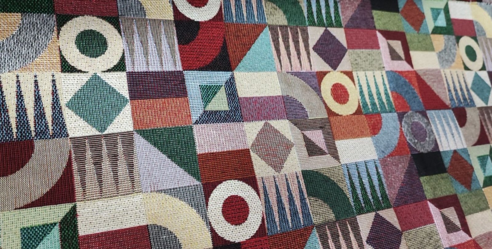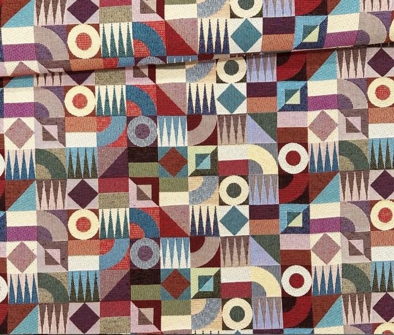 Tela de Loneta Jacquard estilo gobelino de colores muy vistosos toda en mosaico de figuras de rombos multicolor.
