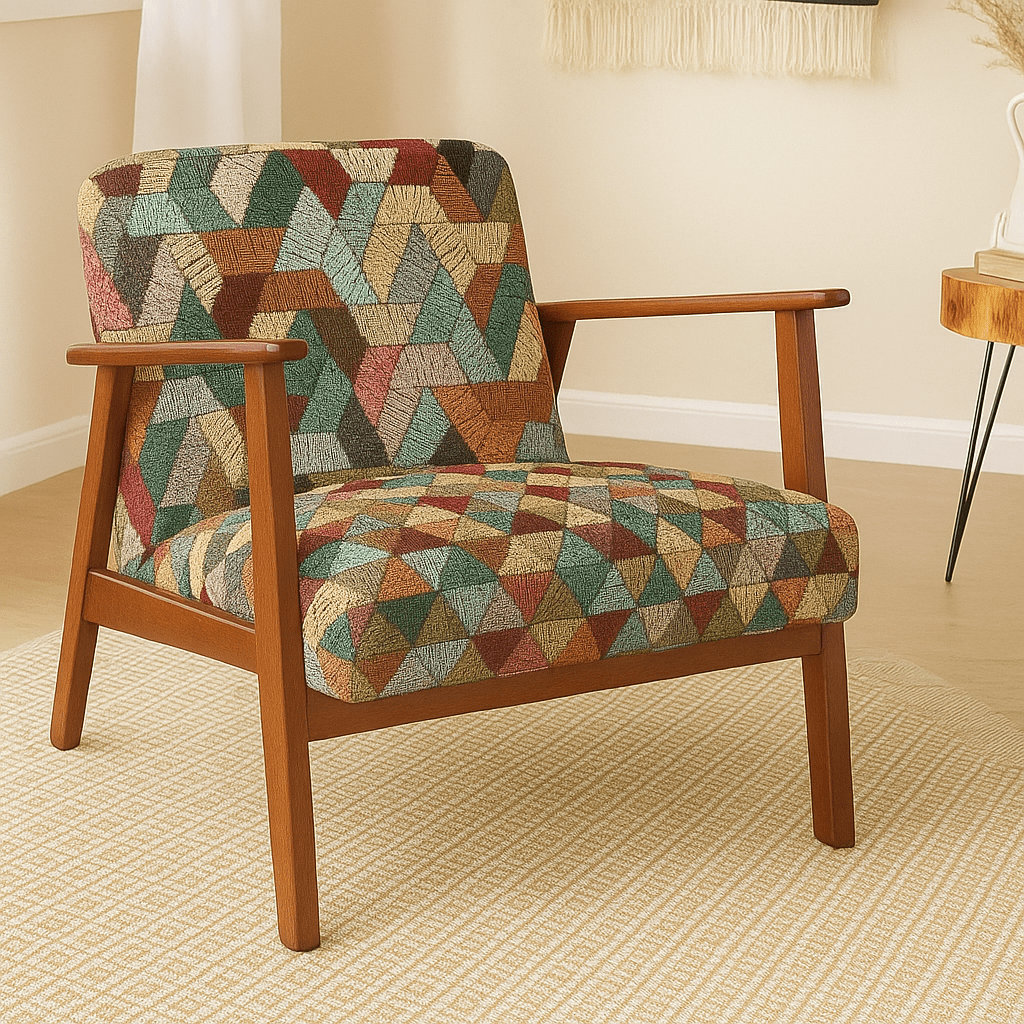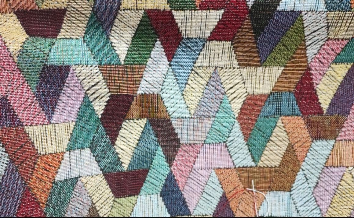 Tela de Loneta jacquard estilo gobelino de colores muy vistosos toda en mosaico de figuras de rombos multicolor.